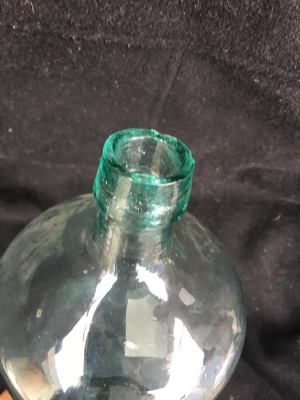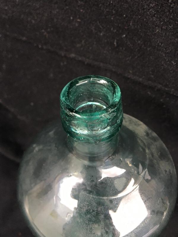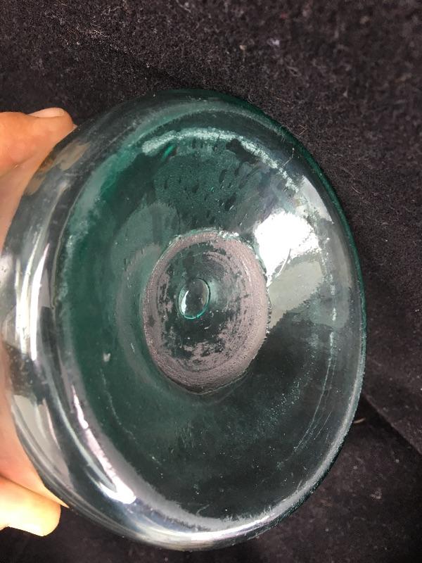 Beautiful old bottle with ground pontil bottom and no seam. Green glass with air bubbles that, most likely, dates back to the 1800s. No cracks or repairs. Please note two small edge chips on bottle rim.