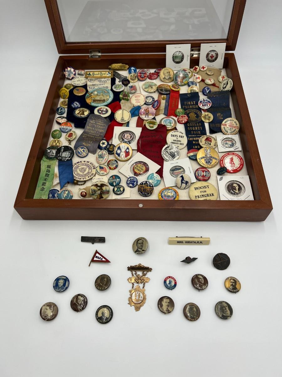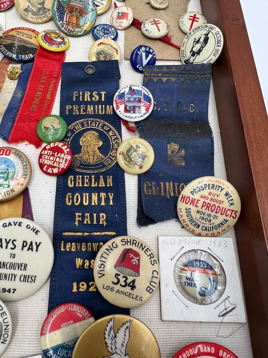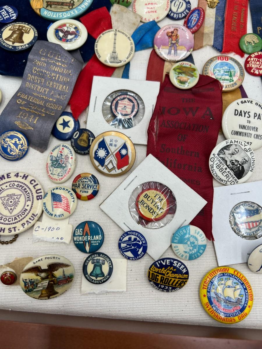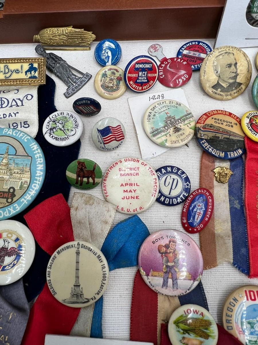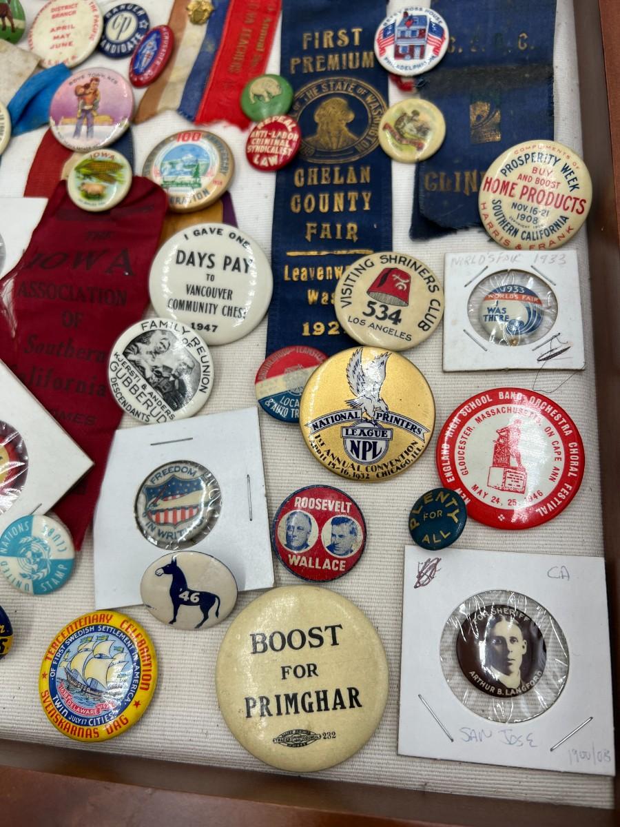 Rare Large Lot of Antique Buttons Ribbons Pins and Pin Backs from 1890, 1900s, 1910s, 1920s, 1930s and 1940s. Lot includes antique buttons for Fred Busse for Mayor, Thomas L. Haines for Representative, Oliver W. Stewart for Representative, Good League Government Taylor, Folk Good Government, Deneen for Governor, Capt. Mills for Congress, C.H. Dietrich for Governor, Boost for Primghar, Arthur B. Langford, Roosevelt Wallace, Gubberud Descendants, Brotherhood of Teamsters, Oregon 100 Anniversary, 1908 Prosperity Week Los Angeles, First Premium (Prize) Ribbon at 1920s Chelan County Fair, Leif Erikson Day, Red Cross, Chest X-Ray, The Prudential Admiral Dewey, 1940 Community Chest, 1950 Chicago Fair, Panama Pacific International Exposition, 1929 Tower City Jubilee, 1910 Sioux City, 1924 Don't Tread On Me, 1941 Convention Fraternal Order of Eagles, I Love the Beatles, Boy Scouts of America "I'll Be Invested", Salvation Army, Hiroshima Peace circa World War 2, I'm Buying Bonds, First Swedish Settlement in America Twin Cities Tercentenary Celebration, Charlie Chaplin, Freedom Train, and a rare Past President Security badge pin. Conditions as shown. (If shipping is required, the lot will not include the case)