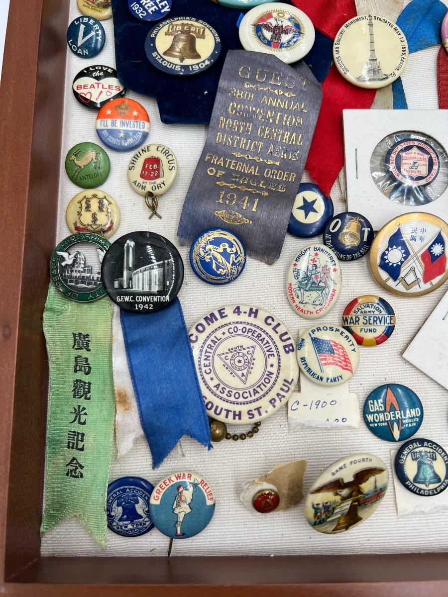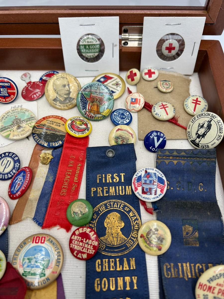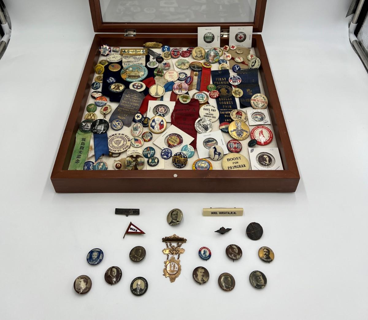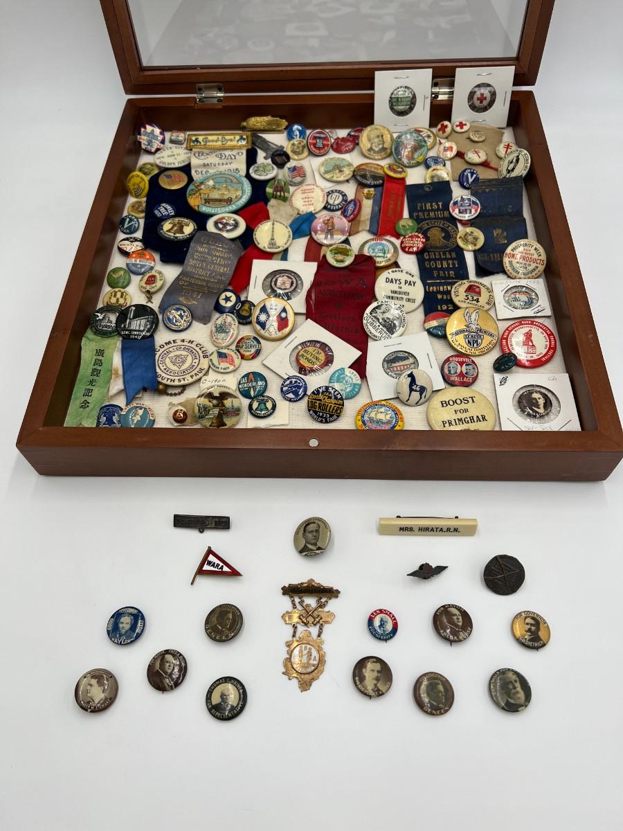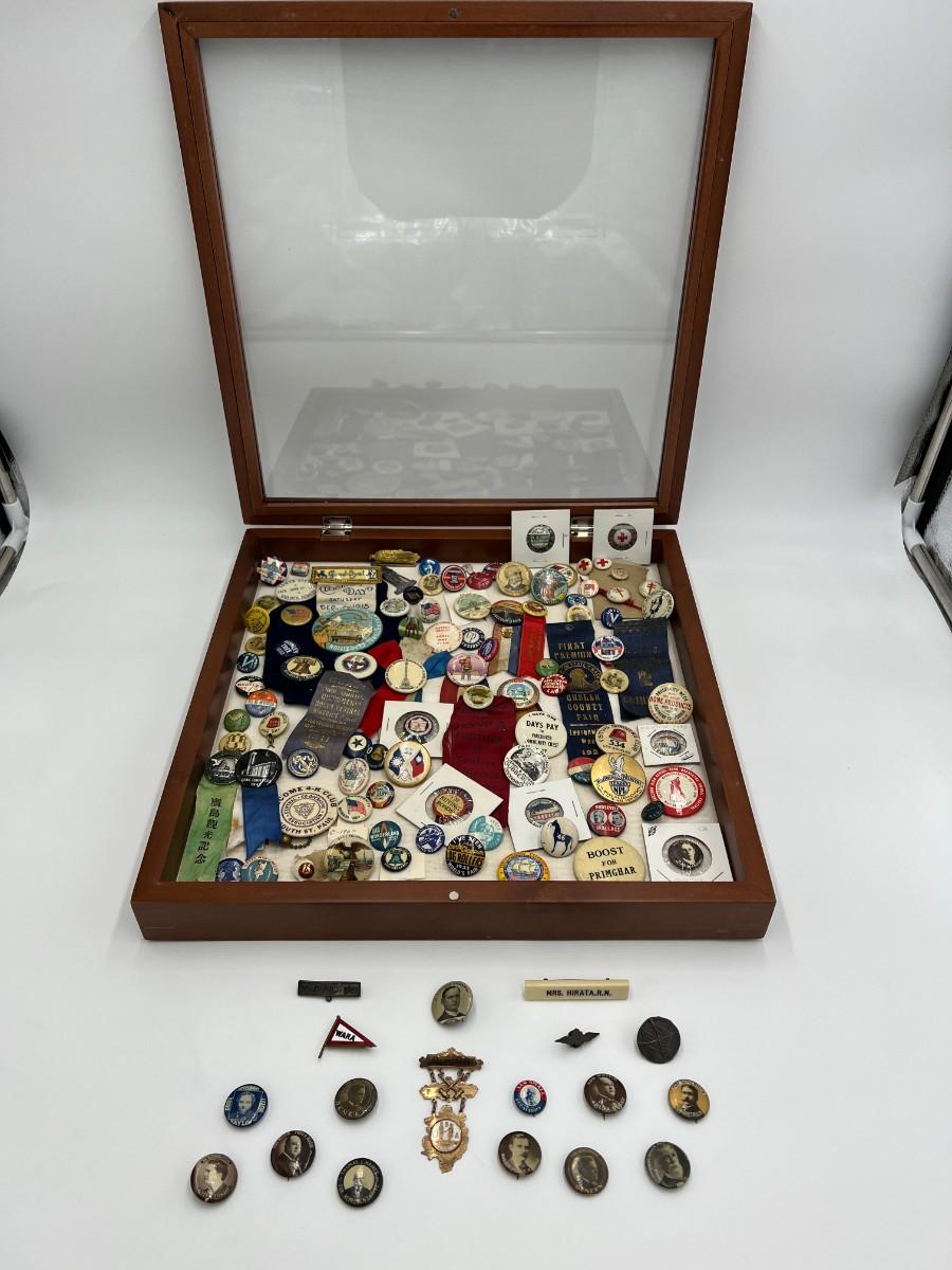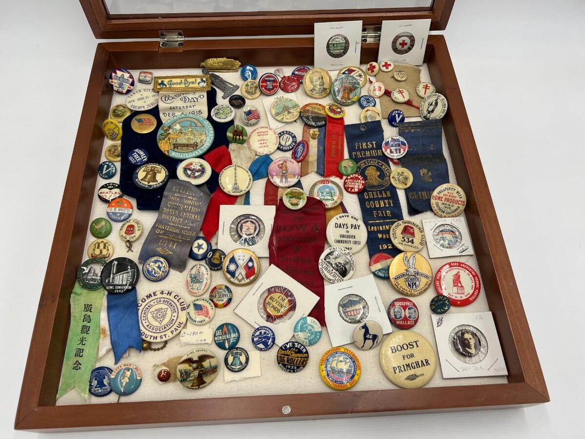Rare Large Lot of Antique Buttons Ribbons Pins and Pin Backs from 1890, 1900s, 1910s, 1920s, 1930s and 1940s. Lot includes antique buttons for Fred Busse for Mayor, Thomas L. Haines for Representative, Oliver W. Stewart for Representative, Good League Government Taylor, Folk Good Government, Deneen for Governor, Capt. Mills for Congress, C.H. Dietrich for Governor, Boost for Primghar, Arthur B. Langford, Roosevelt Wallace, Gubberud Descendants, Brotherhood of Teamsters, Oregon 100 Anniversary, 1908 Prosperity Week Los Angeles, First Premium (Prize) Ribbon at 1920s Chelan County Fair, Leif Erikson Day, Red Cross, Chest X-Ray, The Prudential Admiral Dewey, 1940 Community Chest, 1950 Chicago Fair, Panama Pacific International Exposition, 1929 Tower City Jubilee, 1910 Sioux City, 1924 Don't Tread On Me, 1941 Convention Fraternal Order of Eagles, I Love the Beatles, Boy Scouts of America "I'll Be Invested", Salvation Army, Hiroshima Peace circa World War 2, I'm Buying Bonds, First Swedish Settlement in America Twin Cities Tercentenary Celebration, Charlie Chaplin, Freedom Train, and a rare Past President Security badge pin. Conditions as shown. (If shipping is required, the lot will not include the case)