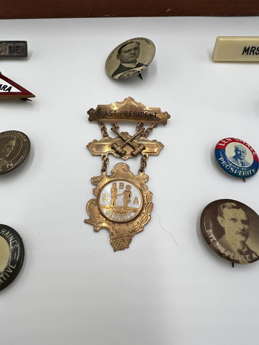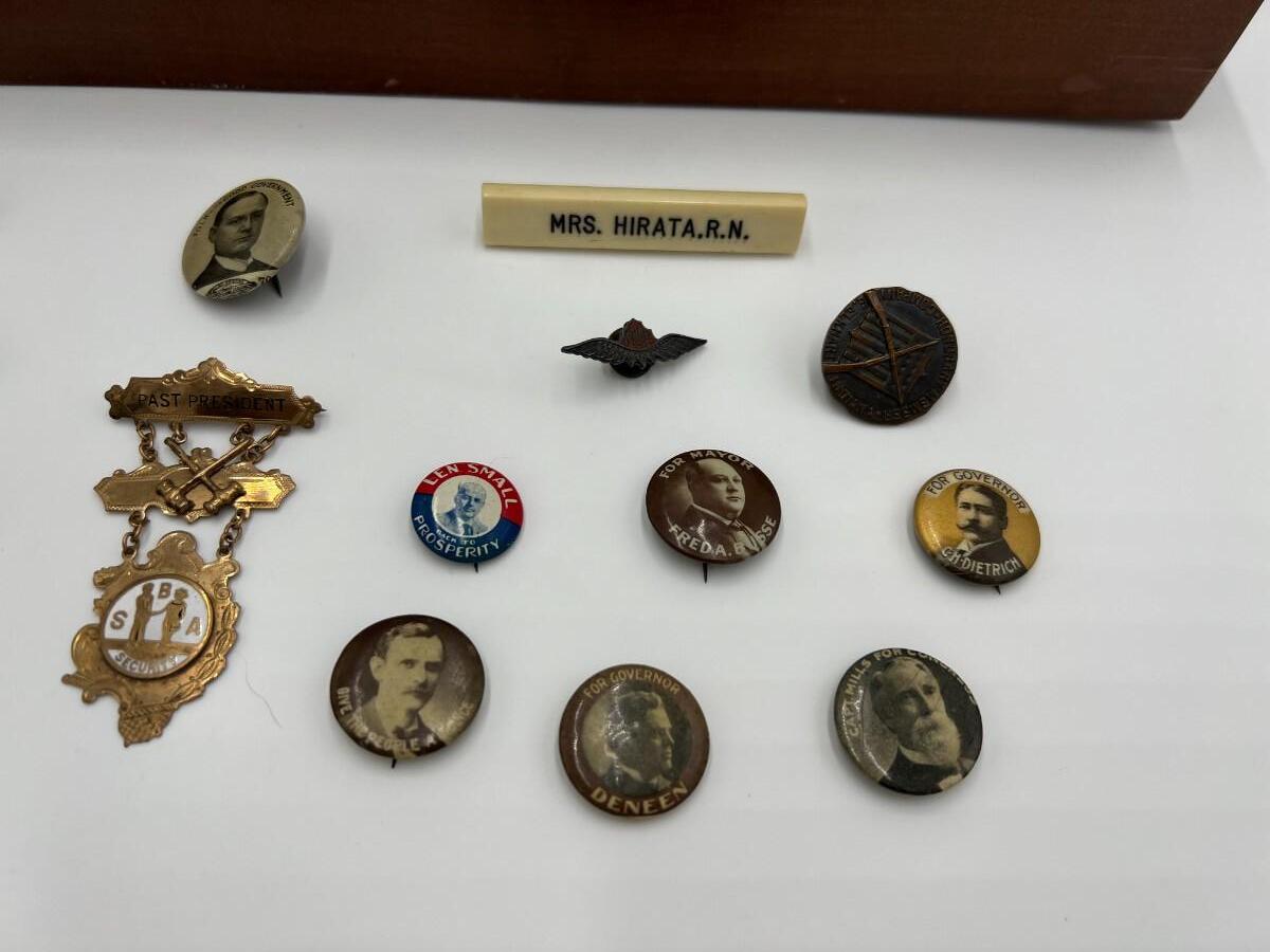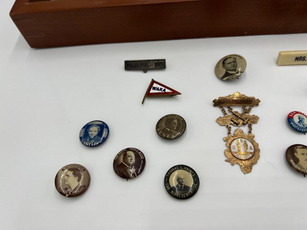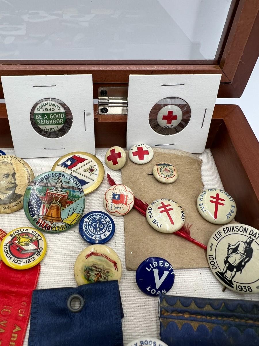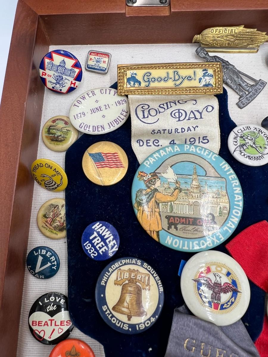 Rare Large Lot of Antique Buttons Ribbons Pins and Pin Backs from 1890, 1900s, 1910s, 1920s, 1930s and 1940s. Lot includes antique buttons for Fred Busse for Mayor, Thomas L. Haines for Representative, Oliver W. Stewart for Representative, Good League Government Taylor, Folk Good Government, Deneen for Governor, Capt. Mills for Congress, C.H. Dietrich for Governor, Boost for Primghar, Arthur B. Langford, Roosevelt Wallace, Gubberud Descendants, Brotherhood of Teamsters, Oregon 100 Anniversary, 1908 Prosperity Week Los Angeles, First Premium (Prize) Ribbon at 1920s Chelan County Fair, Leif Erikson Day, Red Cross, Chest X-Ray, The Prudential Admiral Dewey, 1940 Community Chest, 1950 Chicago Fair, Panama Pacific International Exposition, 1929 Tower City Jubilee, 1910 Sioux City, 1924 Don't Tread On Me, 1941 Convention Fraternal Order of Eagles, I Love the Beatles, Boy Scouts of America "I'll Be Invested", Salvation Army, Hiroshima Peace circa World War 2, I'm Buying Bonds, First Swedish Settlement in America Twin Cities Tercentenary Celebration, Charlie Chaplin, Freedom Train, and a rare Past President Security badge pin. Conditions as shown. (If shipping is required, the lot will not include the case)