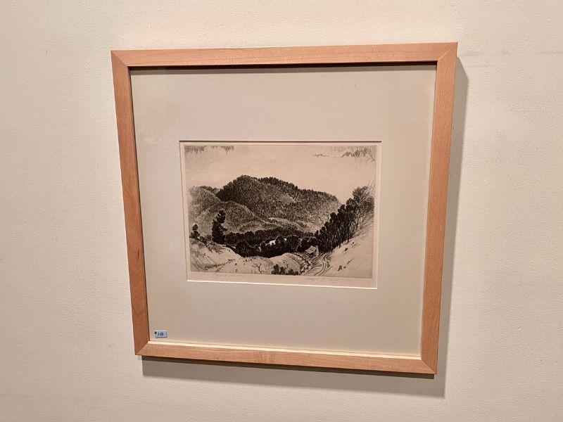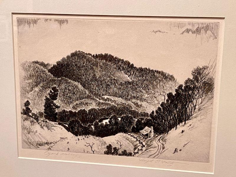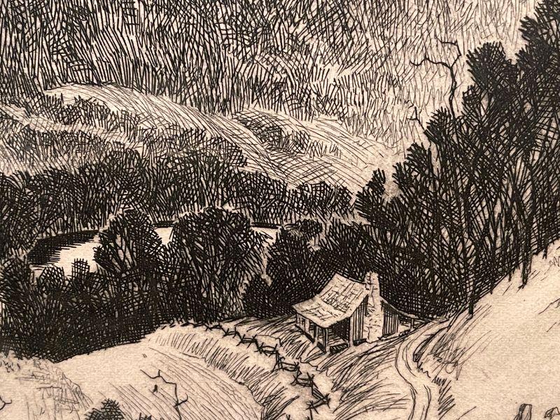 This is an original signed print by founding Prairie Printmaker member Lloyd Foltz, and was presented by the association as the Gift Print for 1935. The rolling landscape image features a tiny log cabin tucked into a wooded valley the bottom of the gorge.