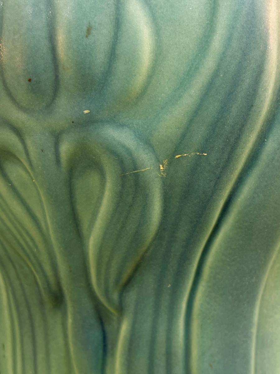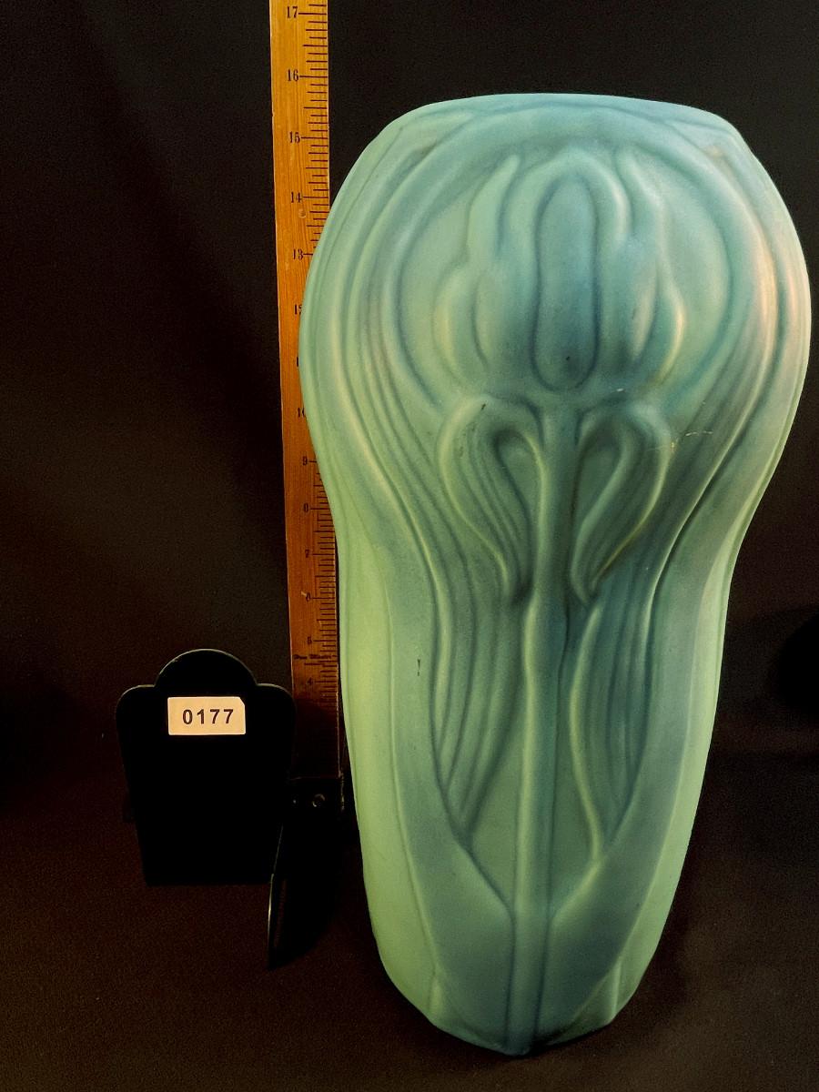The subject item is a massive Van Briggle Vase of flaring head ovoid form with incised stems of tulips, Colo Spgs. Circa 1920 monogram "AA" for Artus Van Briggle