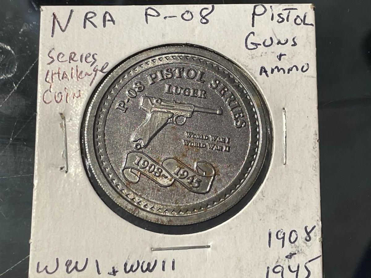 RARE NRA P-08 PISTOL SERIES LUGER COMMEMORATIVE MEDALLION COIN/MEDAL IKE DOLLAR SIZED IN VG PREOWNED CONDITION. $5 DOMESTIC SHIPPING.