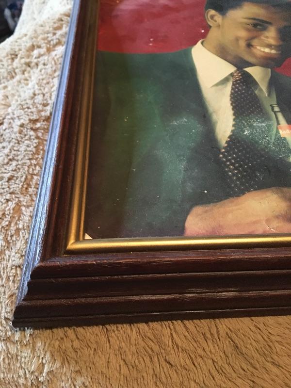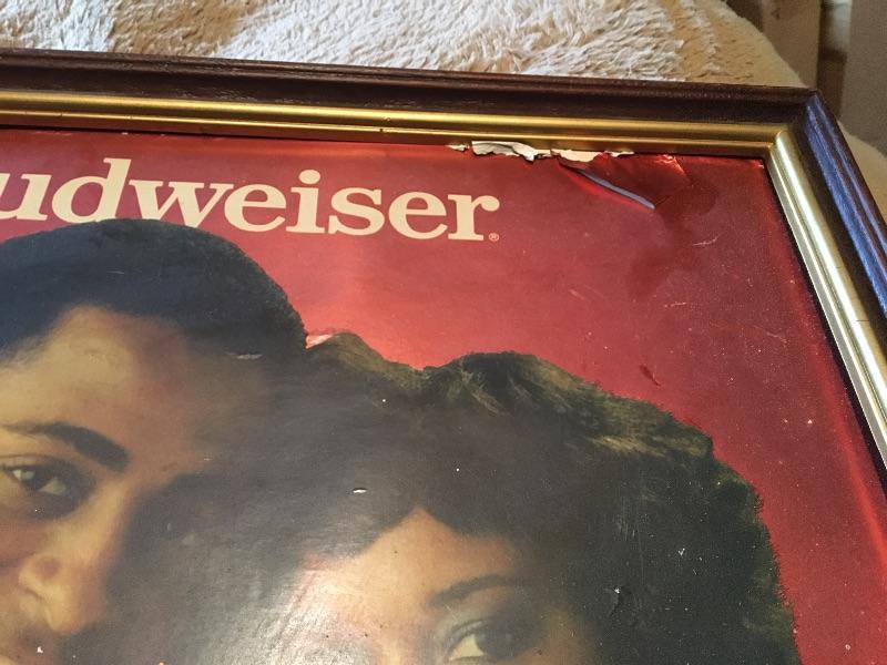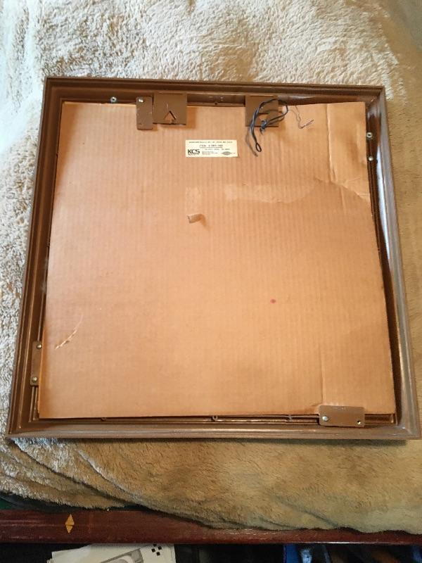 Good overall condition. The art is on foil and mounted on cardboard. Some minor tears along edges. Frame measures 17” x 18”. Please see pictures for details. Packaging and shipping services available. Please contact us, if you need a shipping quote, before bidding.