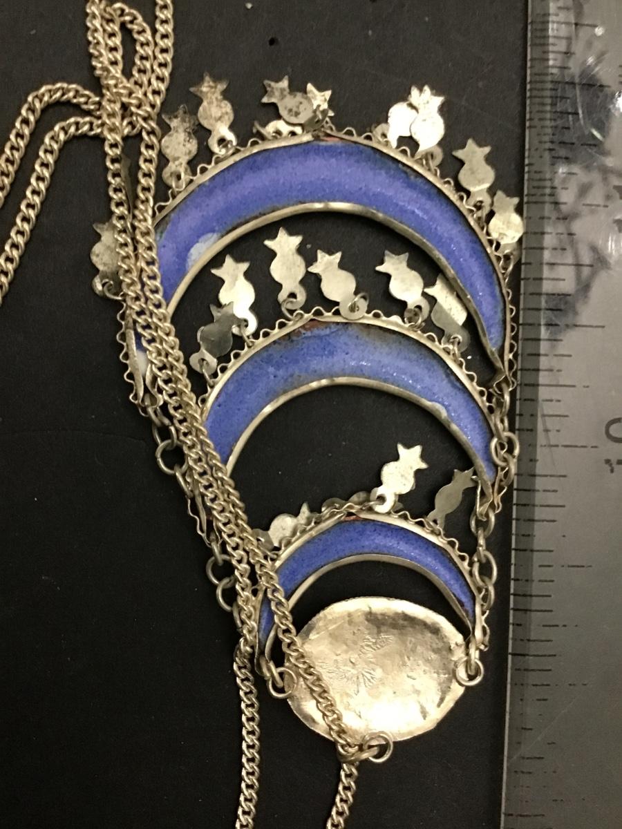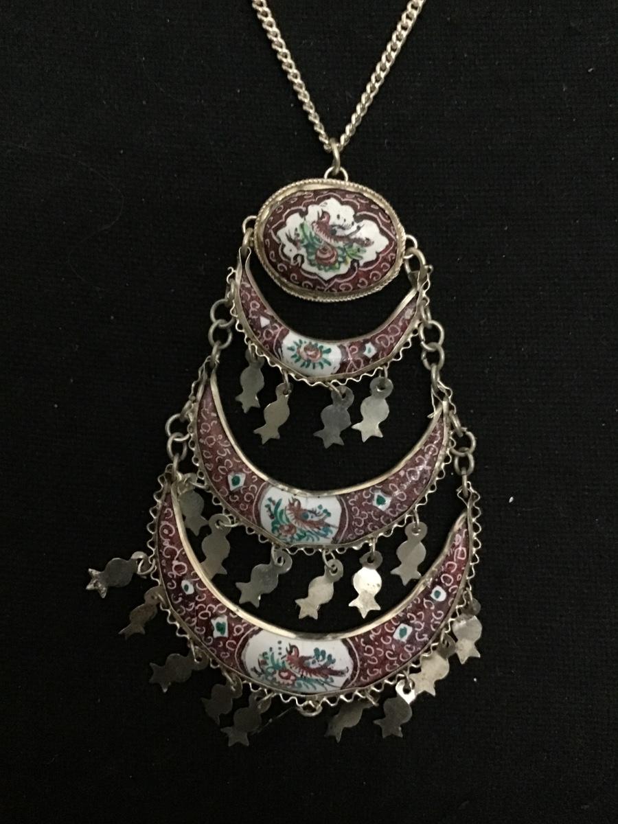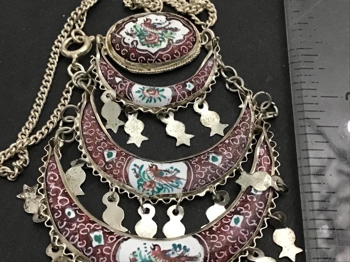 Rare Persian Necklace Sterling Chandlier crescent Shape Enamel Birds Flowers