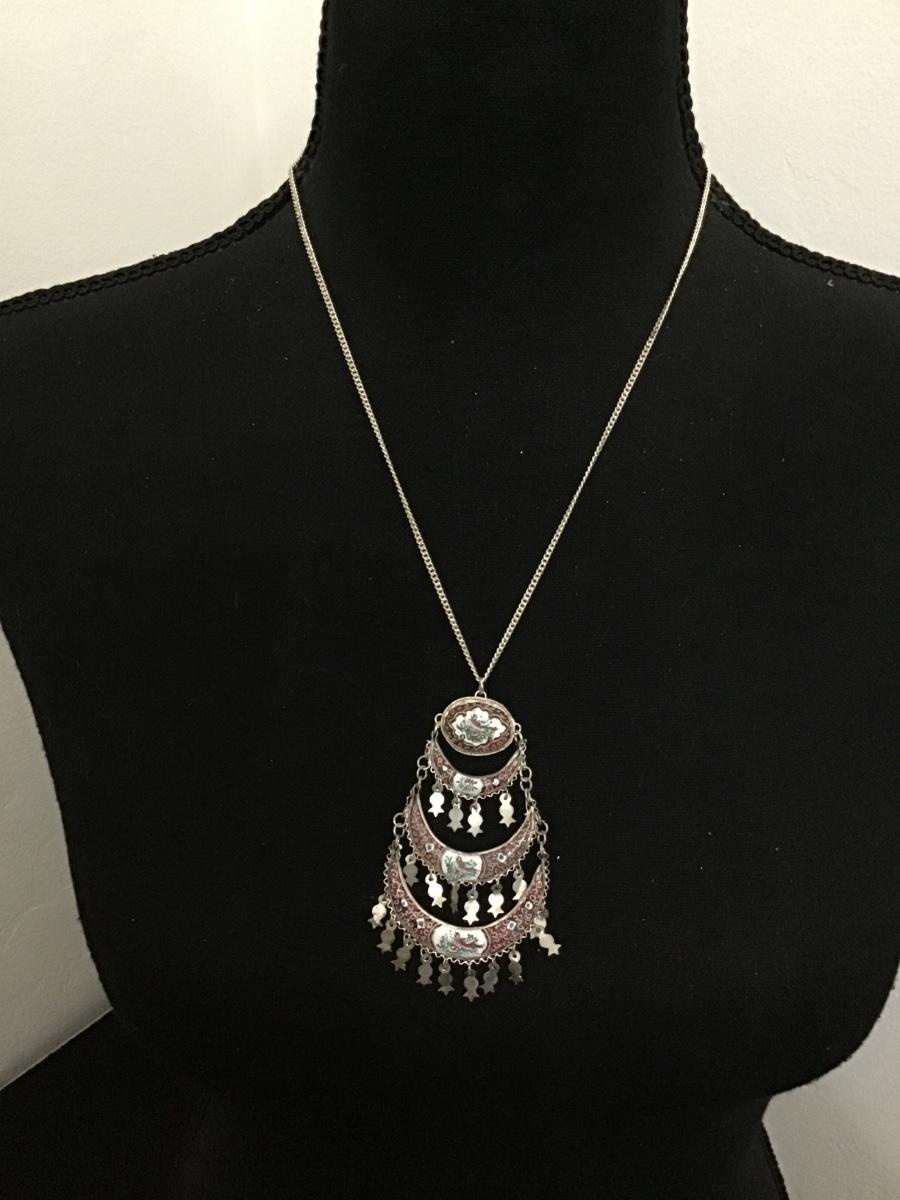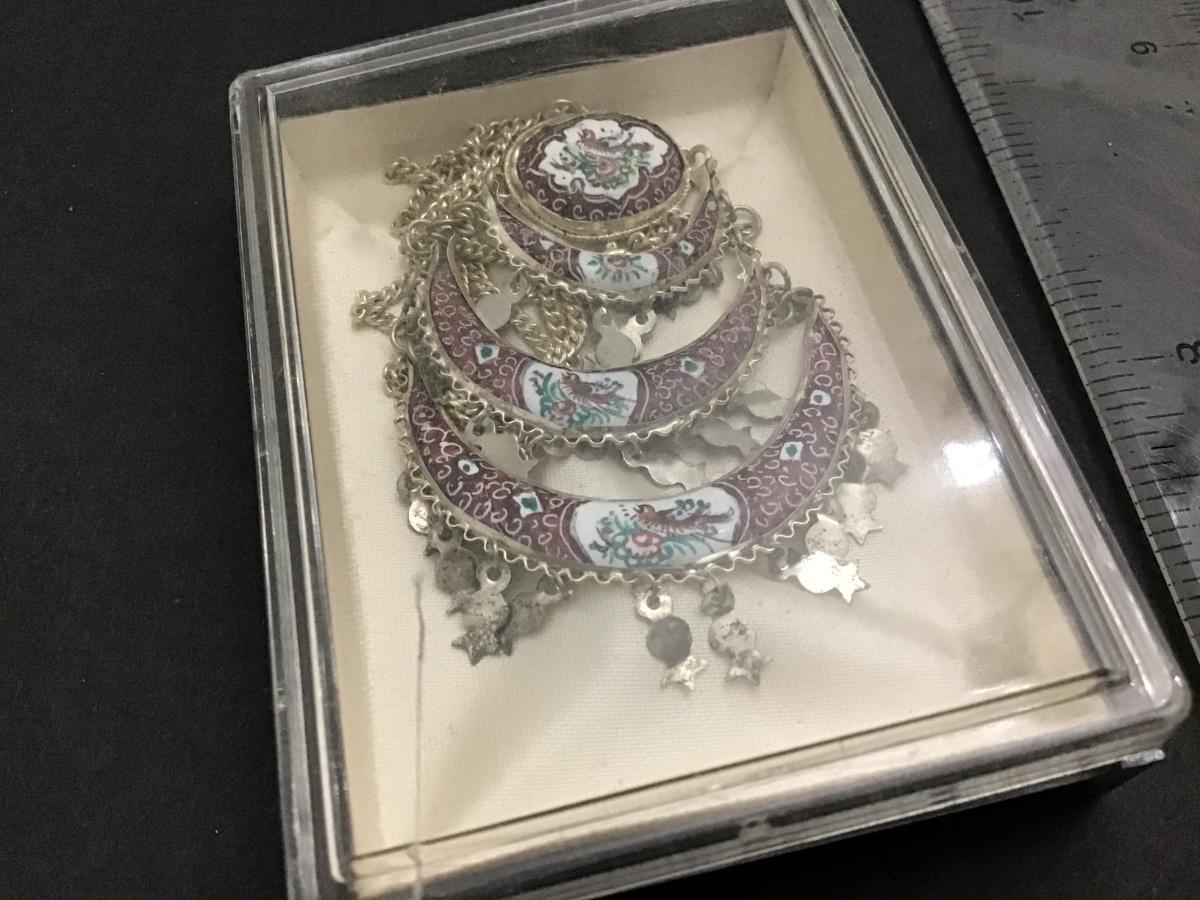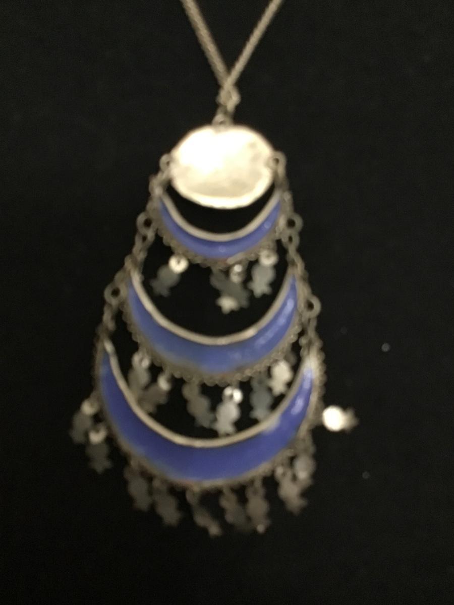 Rare Persian Necklace Sterling Chandlier crescent Shape Enamel Birds Flowers