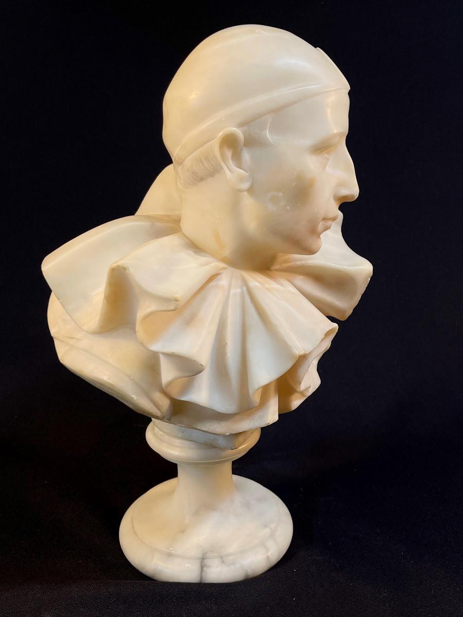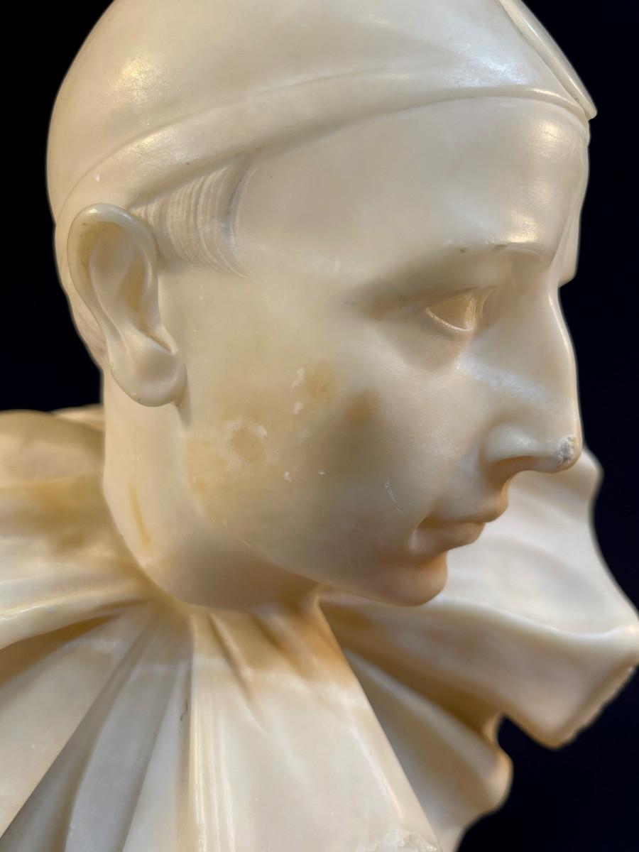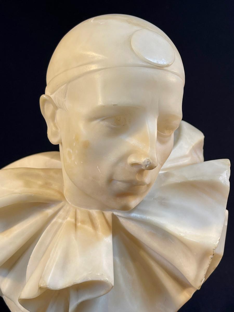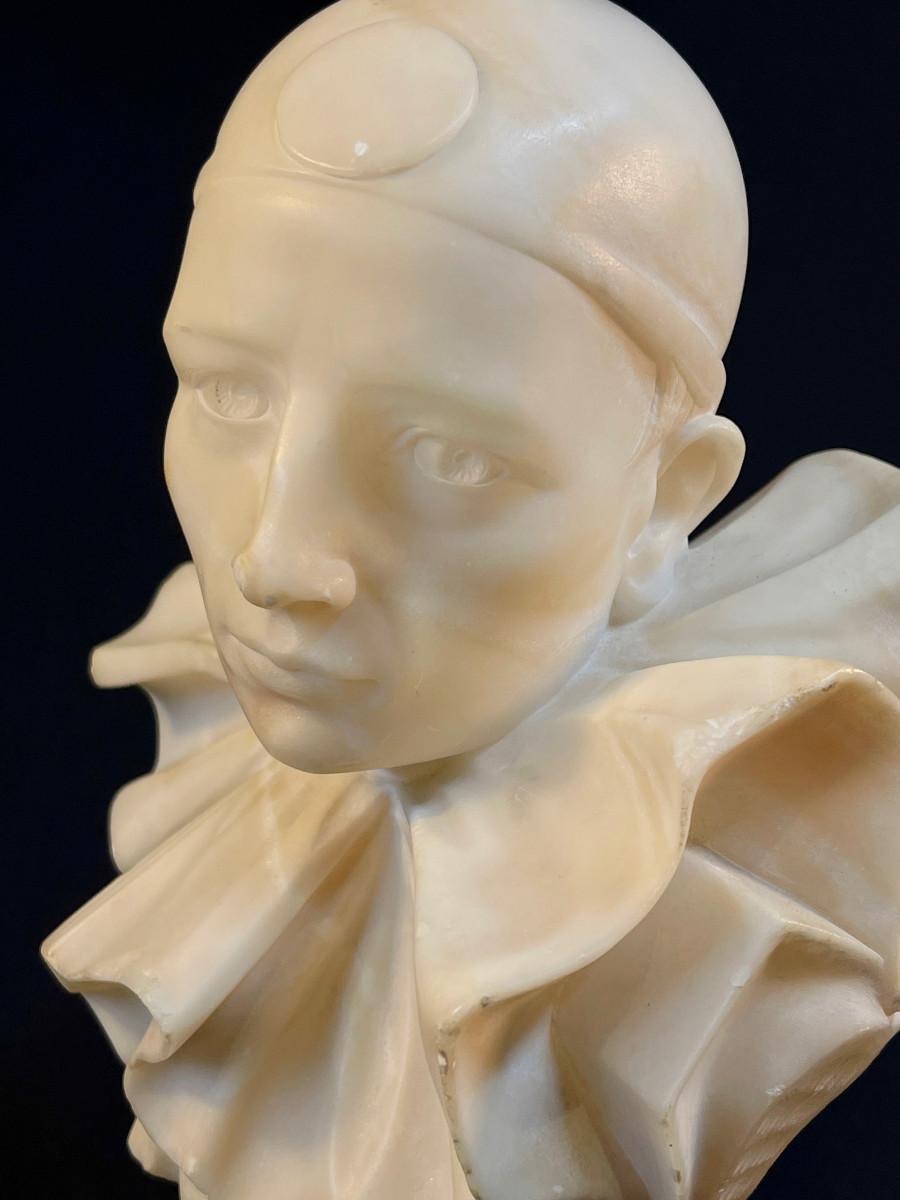 The subject item is a white alabaster, bust length sculpture portrait of the world famous French clown, Pierrot. The handsome character is dressed in a tight fitting skull cap and extended frilled ruff at the neck, in the traditional manner. The creamy white stone exhibits a luminous transparency. The bust rests on a separate and unattached marble base, fitted to receive the metal rod on the bust itself.