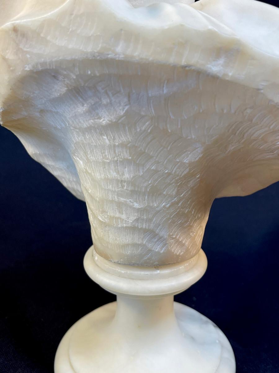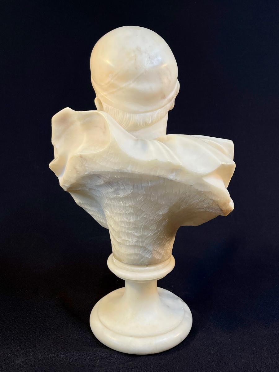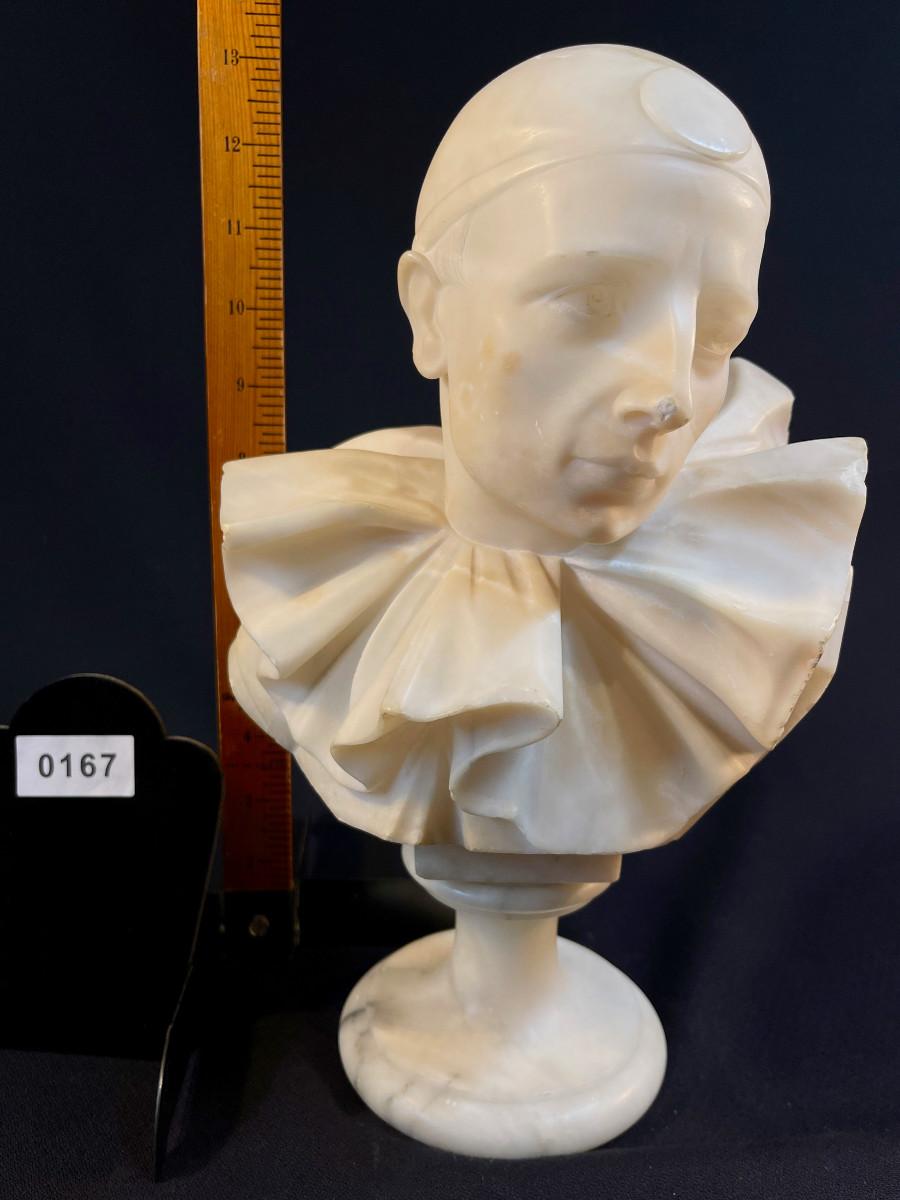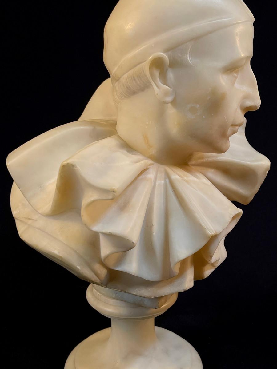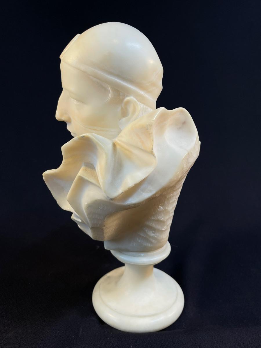 The subject item is a white alabaster, bust length sculpture portrait of the world famous French clown, Pierrot. The handsome character is dressed in a tight fitting skull cap and extended frilled ruff at the neck, in the traditional manner. The creamy white stone exhibits a luminous transparency. The bust rests on a separate and unattached marble base, fitted to receive the metal rod on the bust itself.