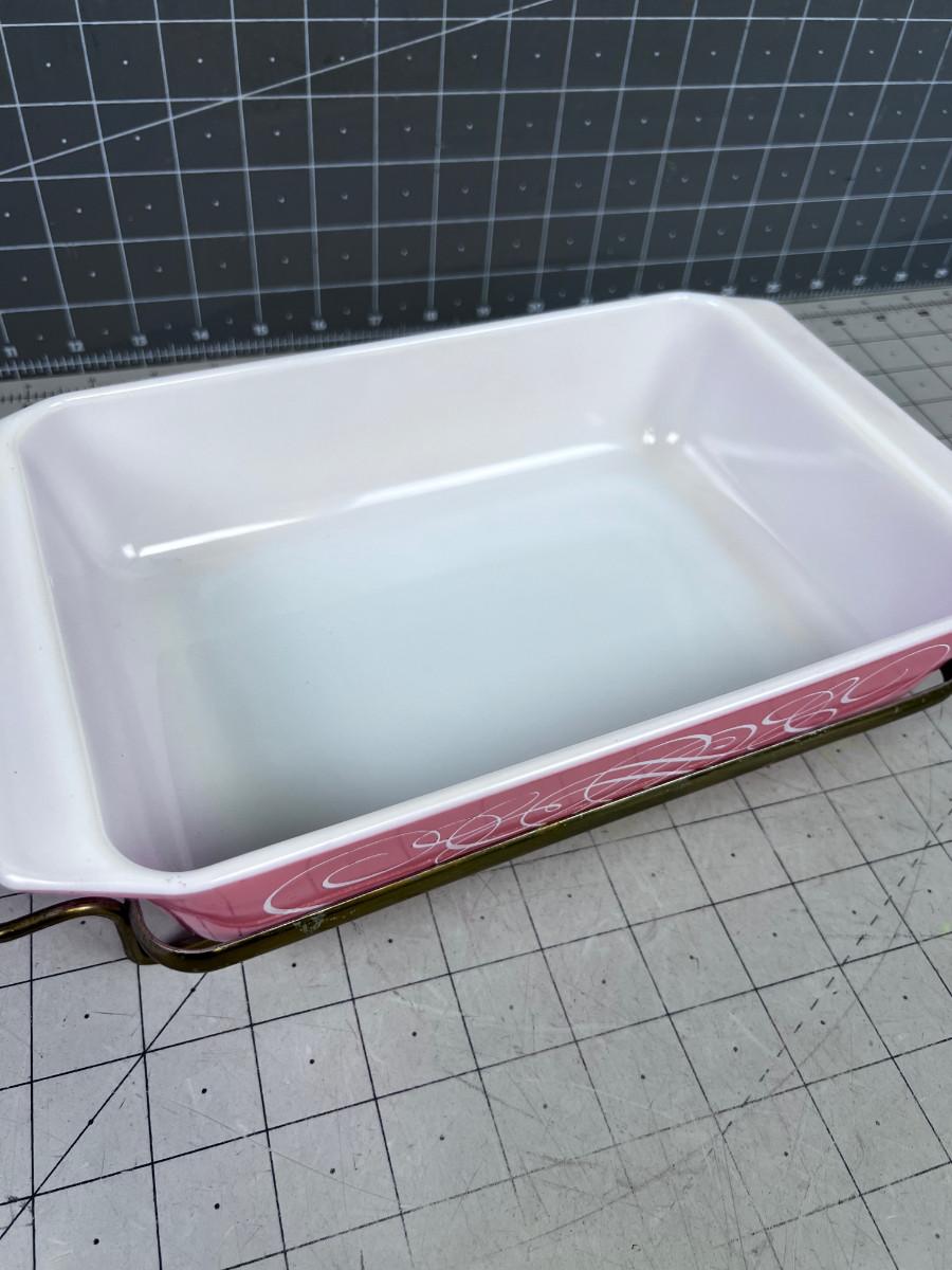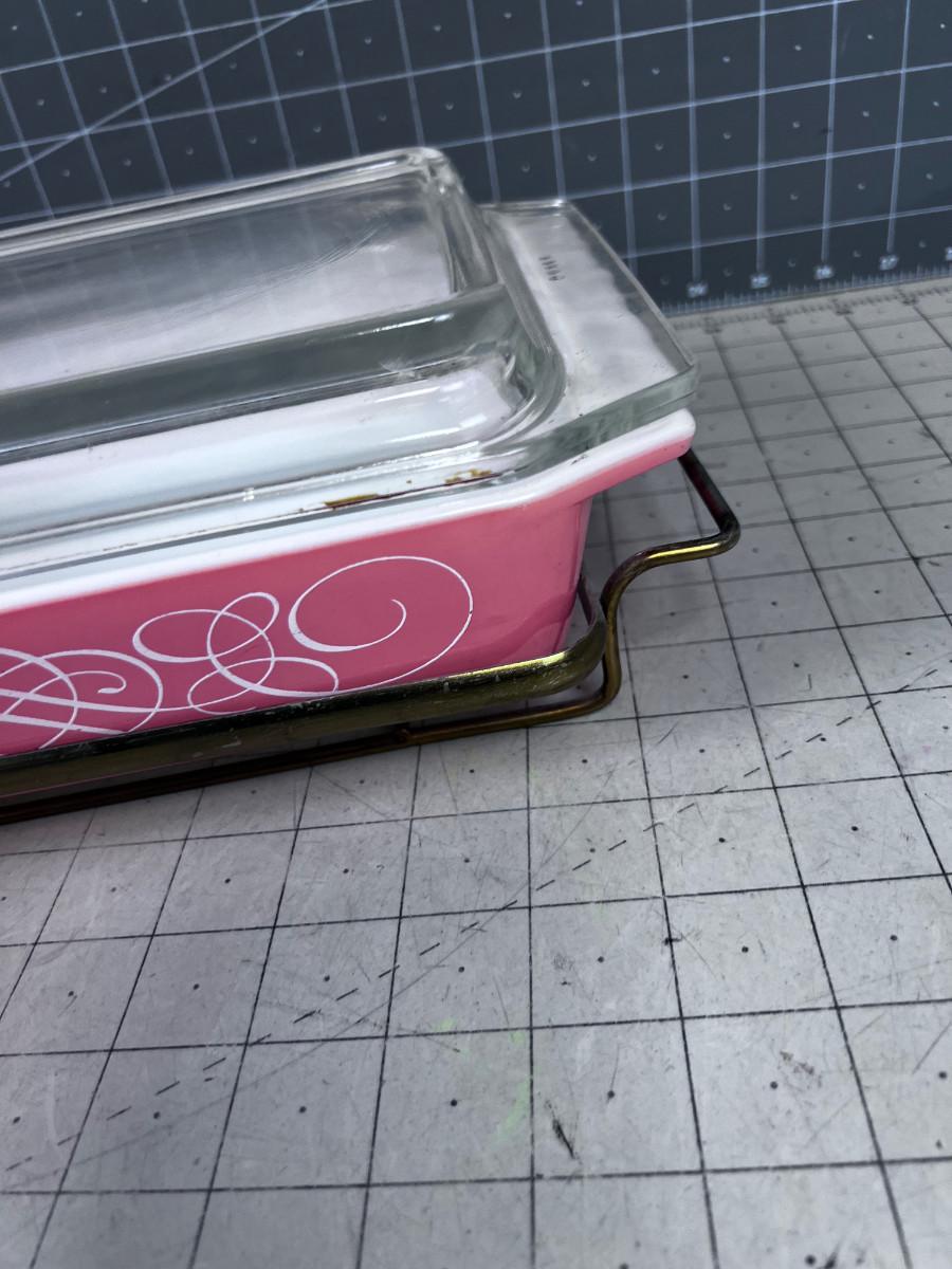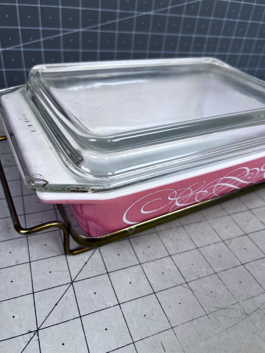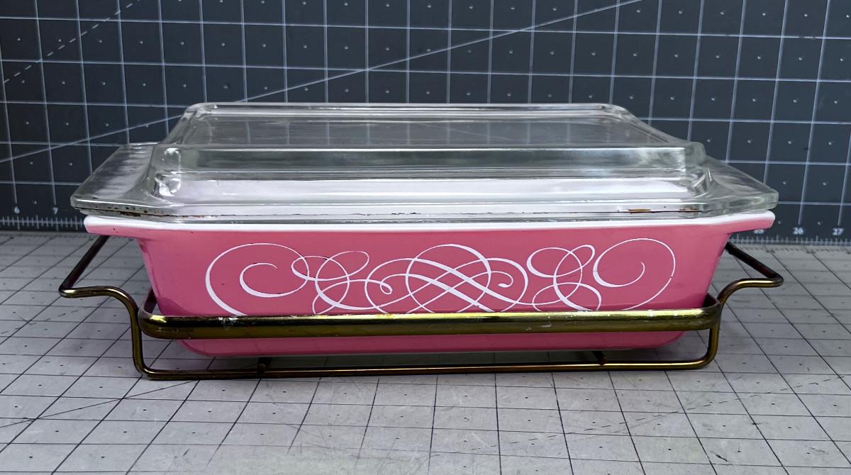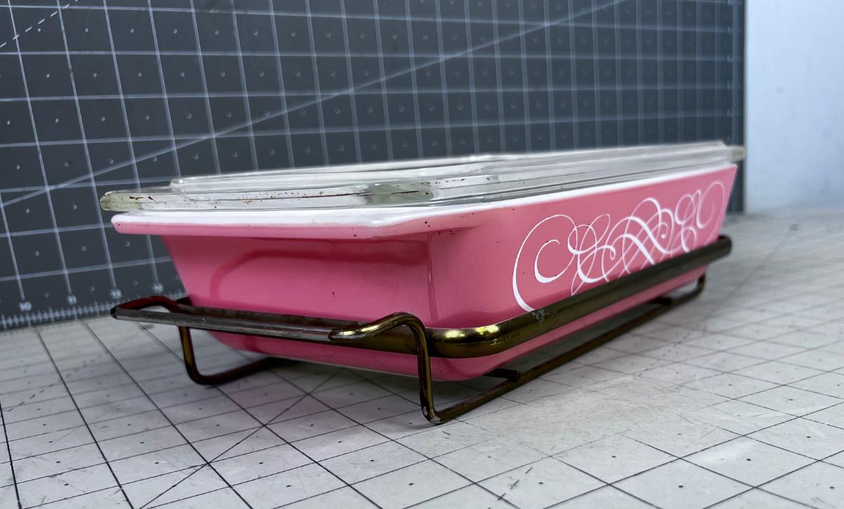 RARE! Pink PYREX Swirl with Lid #575-B 2 Quart Plus Original Wire Cradle