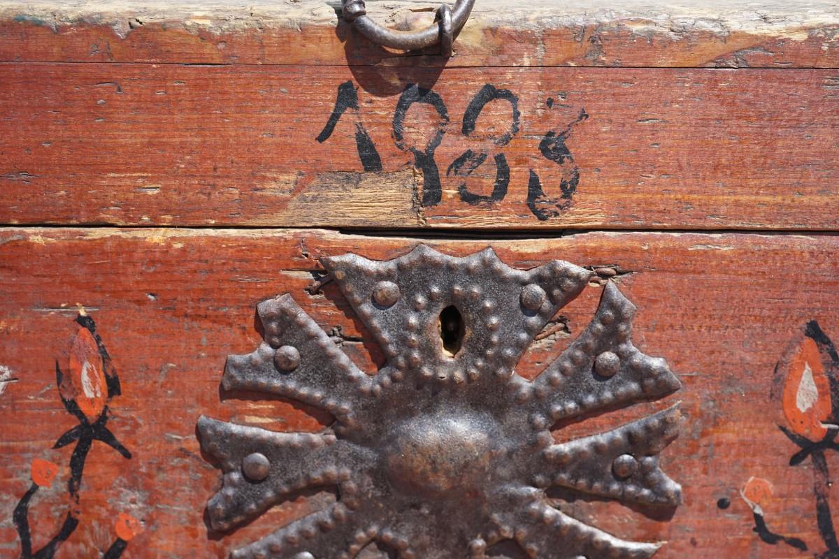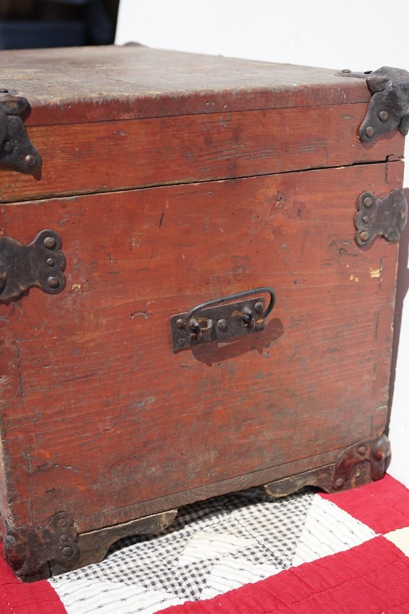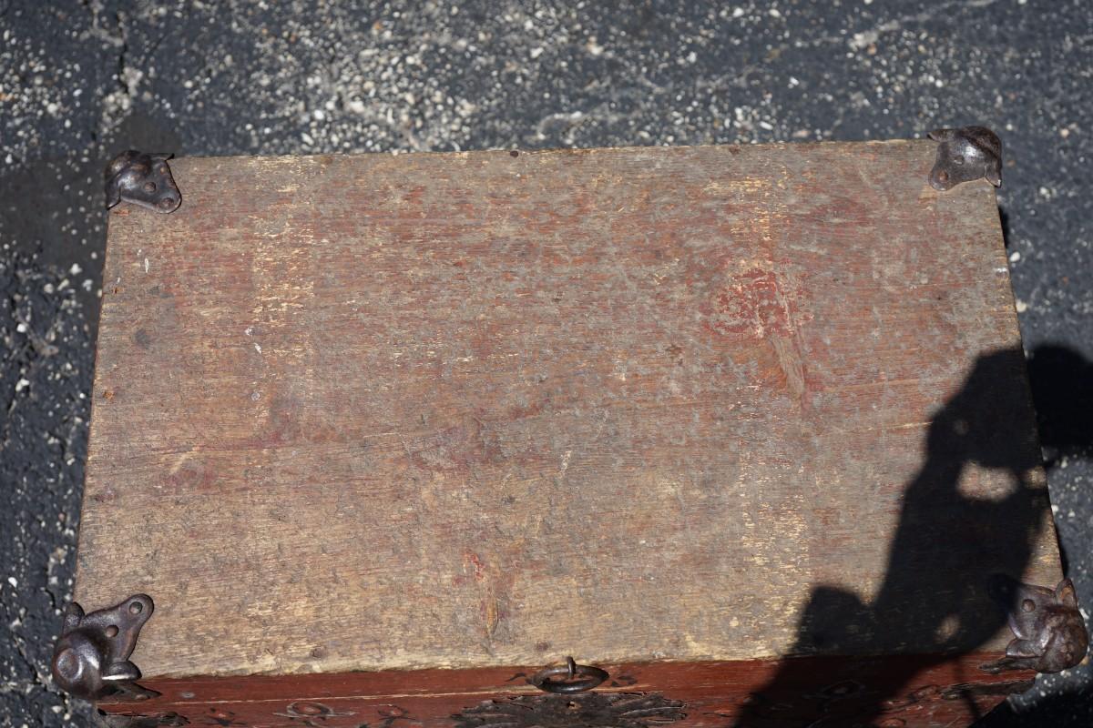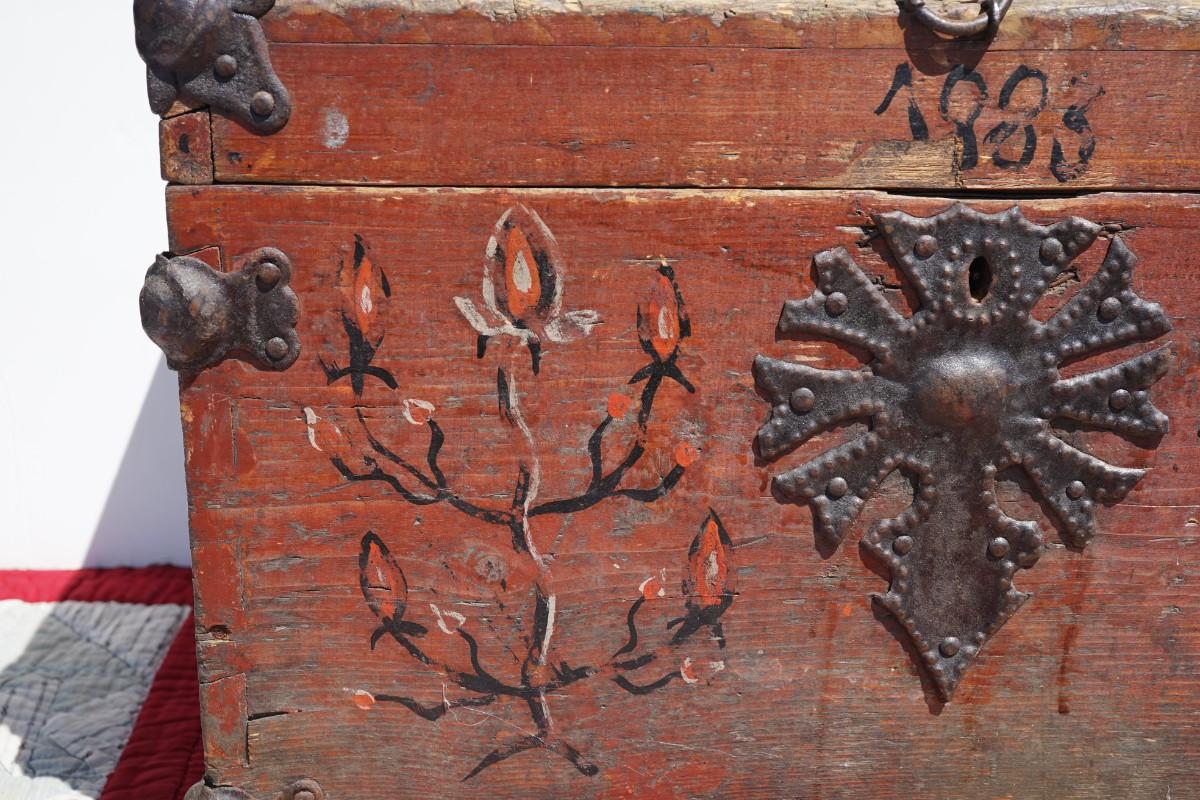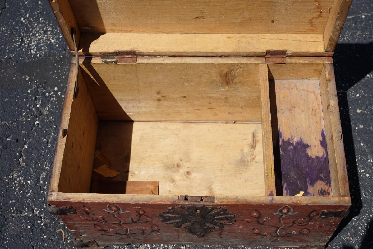 original red paint that has been accented by hand painted floral art. The hardware consists of a star formed lock and ring.no key. The interior has compartments to store. all early construction.