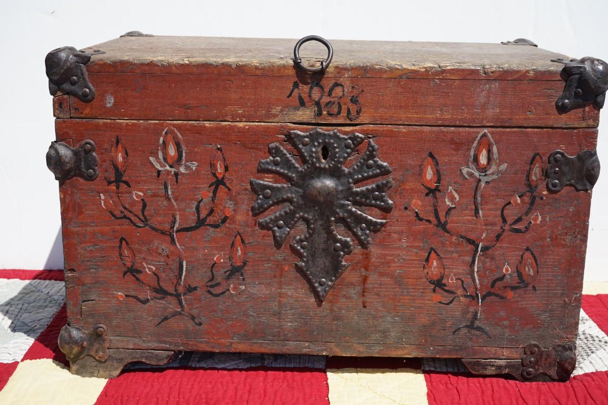 RARE PRIMITIVE EUROPEAN TRAVEL TRUNK DATED 1883 /HAND WROUGHT HARDWARE AND STENCILLED ART