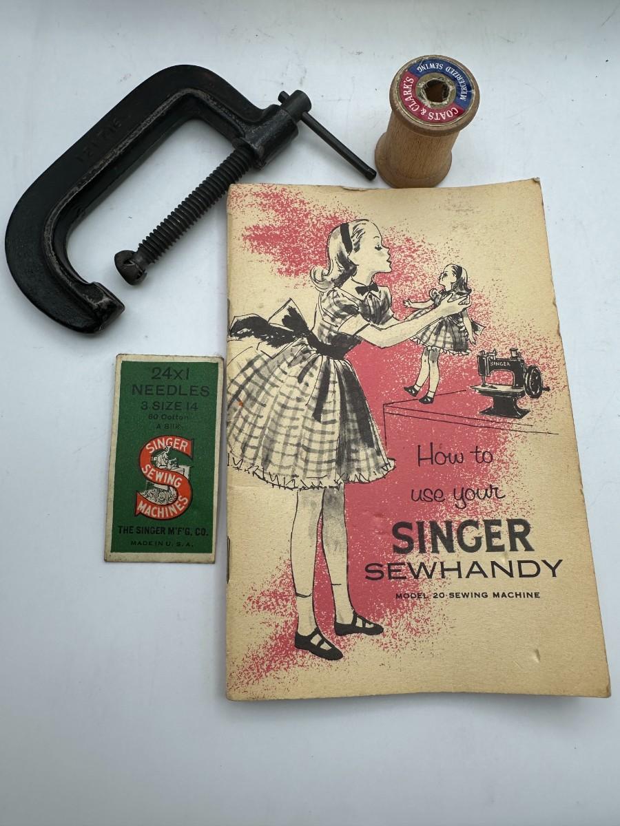 Well built toy, made of cast iron. Hand cranked sewing machine that produces a simple chain stitch. Comes with original clamp, manual, spool and needle package but no needles inside.