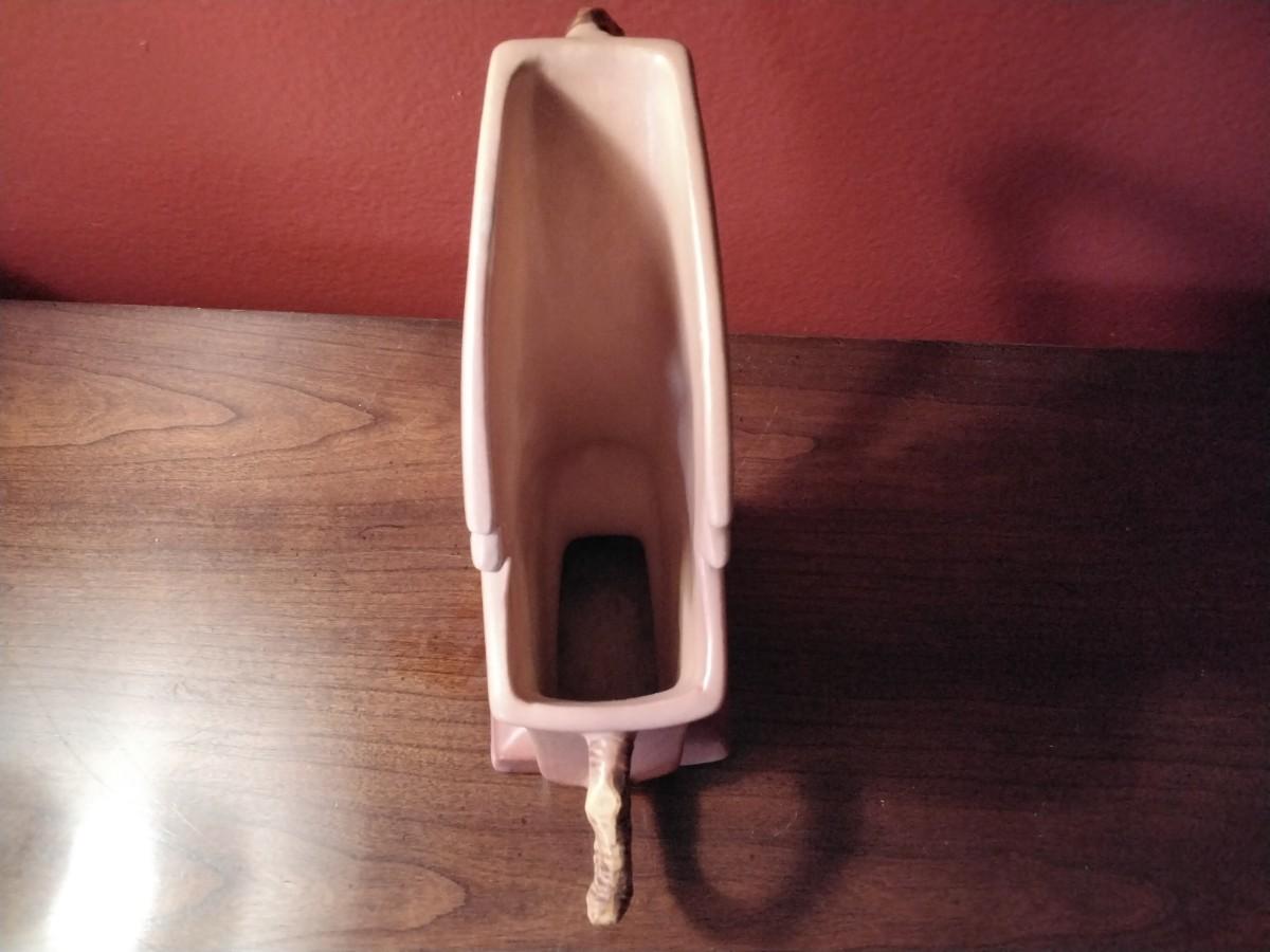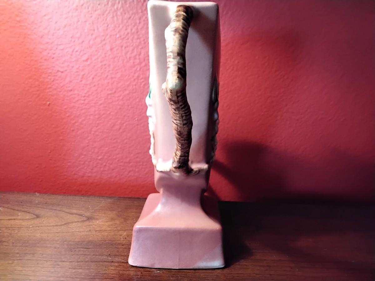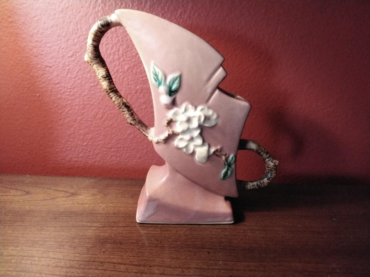 Roseville Pottery Apple Blossom pink handled vase. Good form and color. EXCELLENT ORIGINAL CONDITION. No chips, cracks, damage or repair of any kind. Bottom marked with Roseville, USA and 373-7. Vase is 7 1/2" tall and 7 1/2" wide from handle to handle.