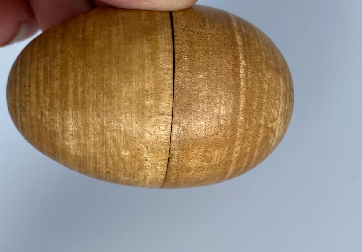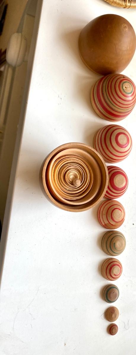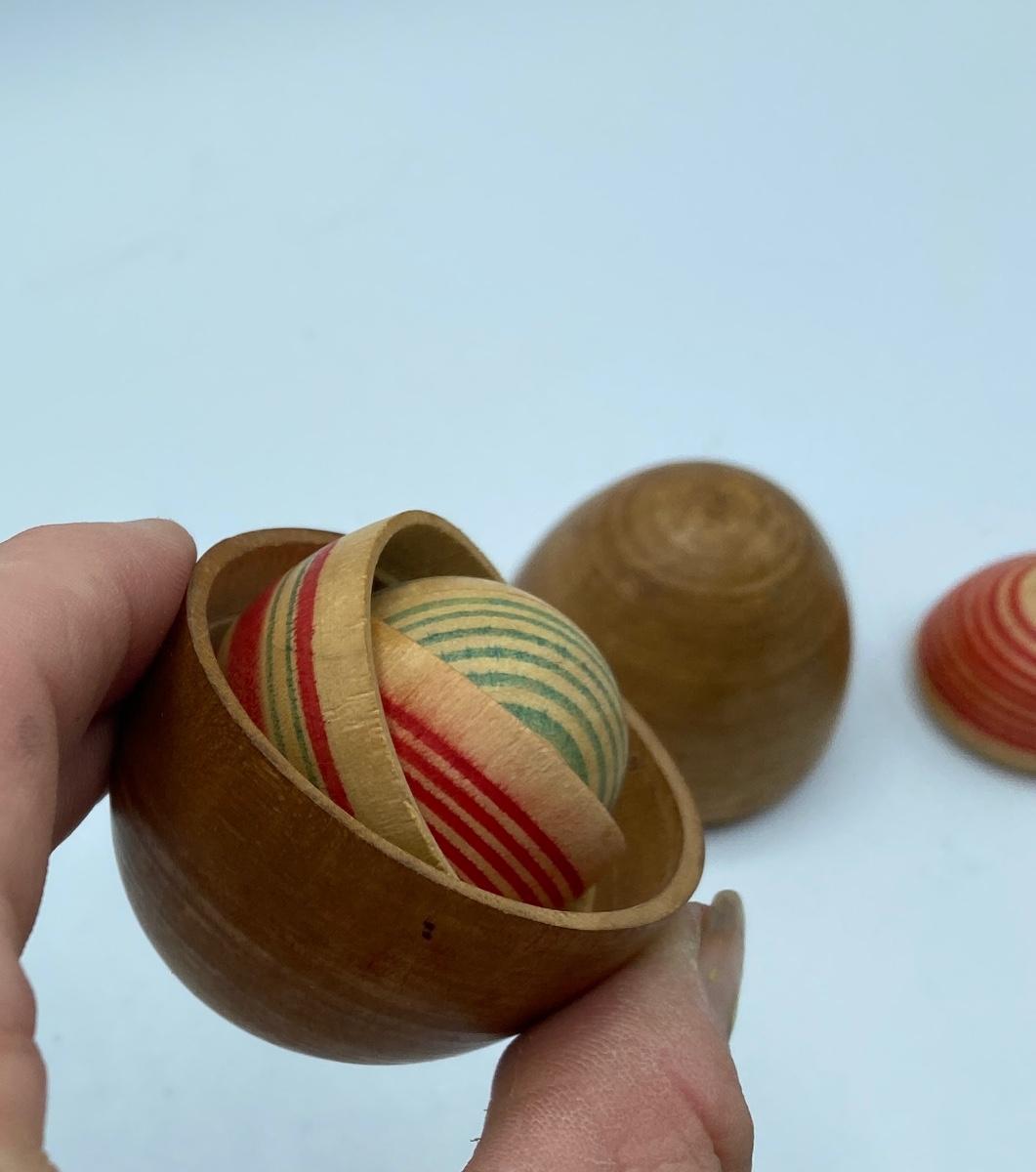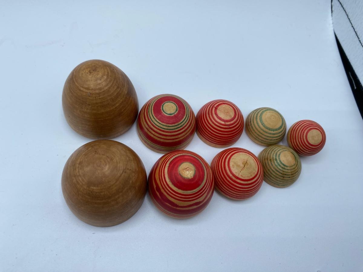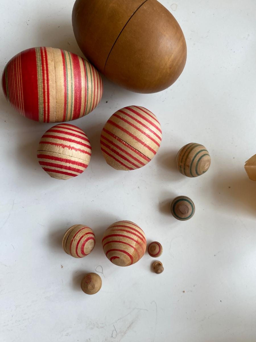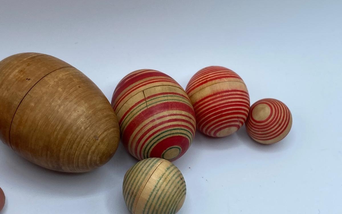 Unique set of 5 nesting eggs found in antique sewing box. Largest egg has beautiful wood grain and they get progressively smaller with red and blue stripes. Largest is 3”, smallest about 1” .