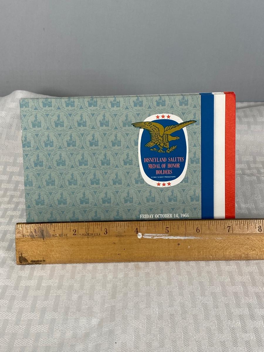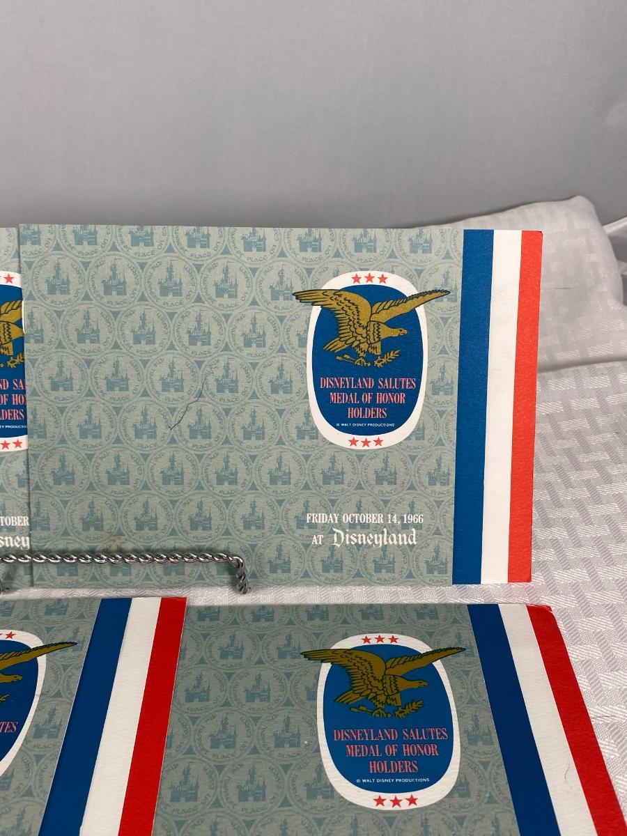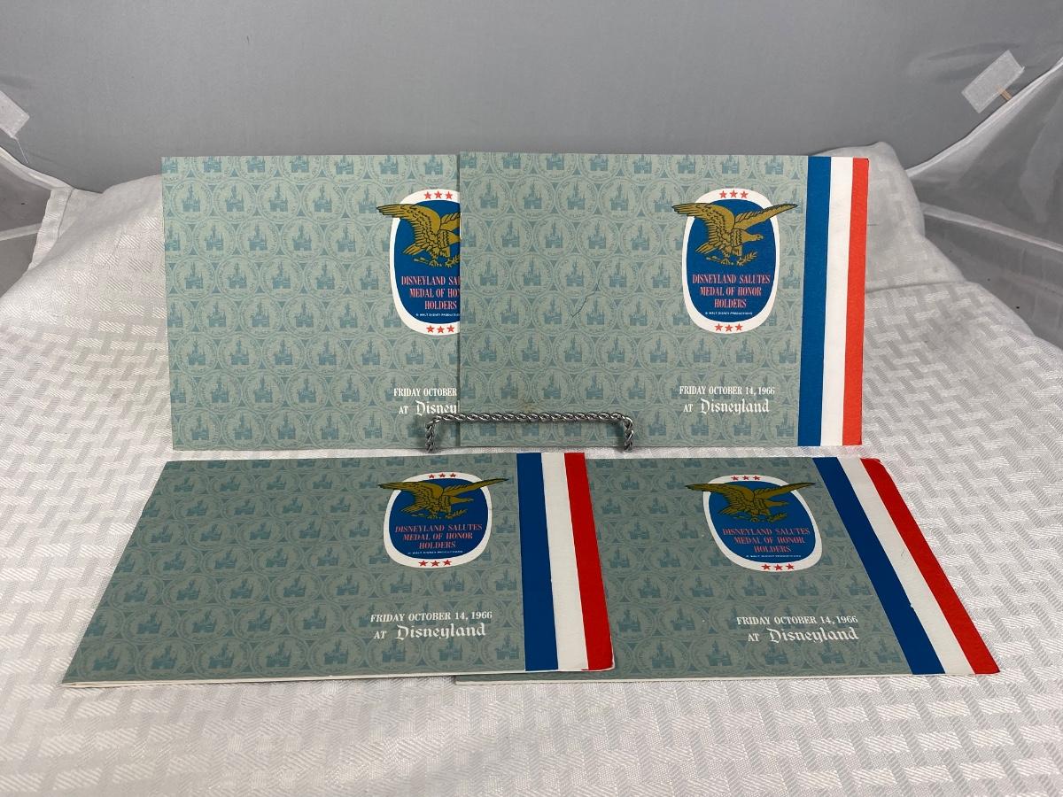 Rare set of 4 event booklets from Disneyland. Dated October 14, 1966, these are programs from Disneyland Salutes Medal of Honor Holders. From the estate of a WWII Medal of Honor recipient. All are in good condition, a few spots here and there. Booklet gave thanks to MOH recipients, listed events of the day, and the menu for the day. Inside one booklet is the signature from Walt Disney. Compared to signatures online and where these originated from it is believed to be authentic but there is no COA, it has not been appraised or certified.