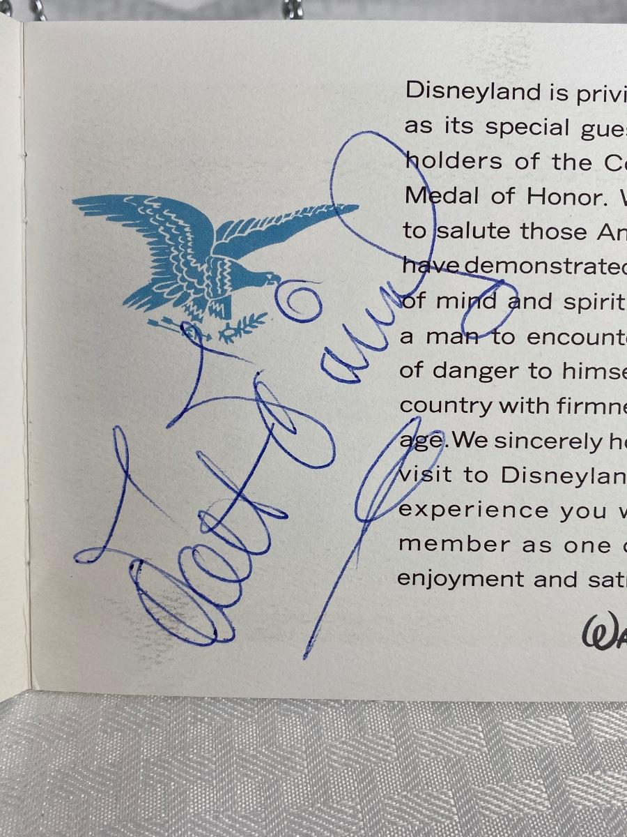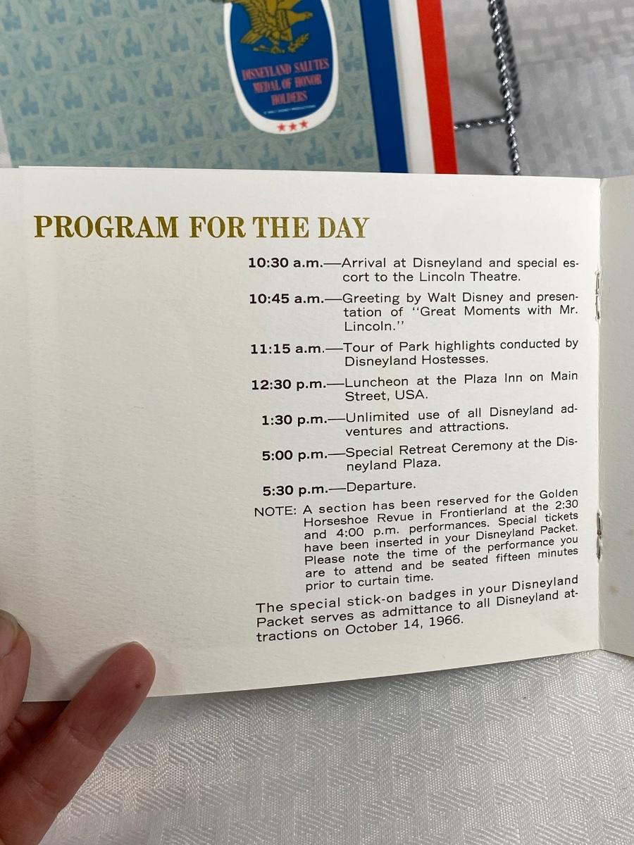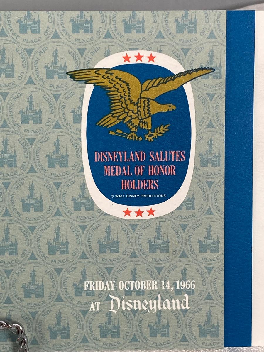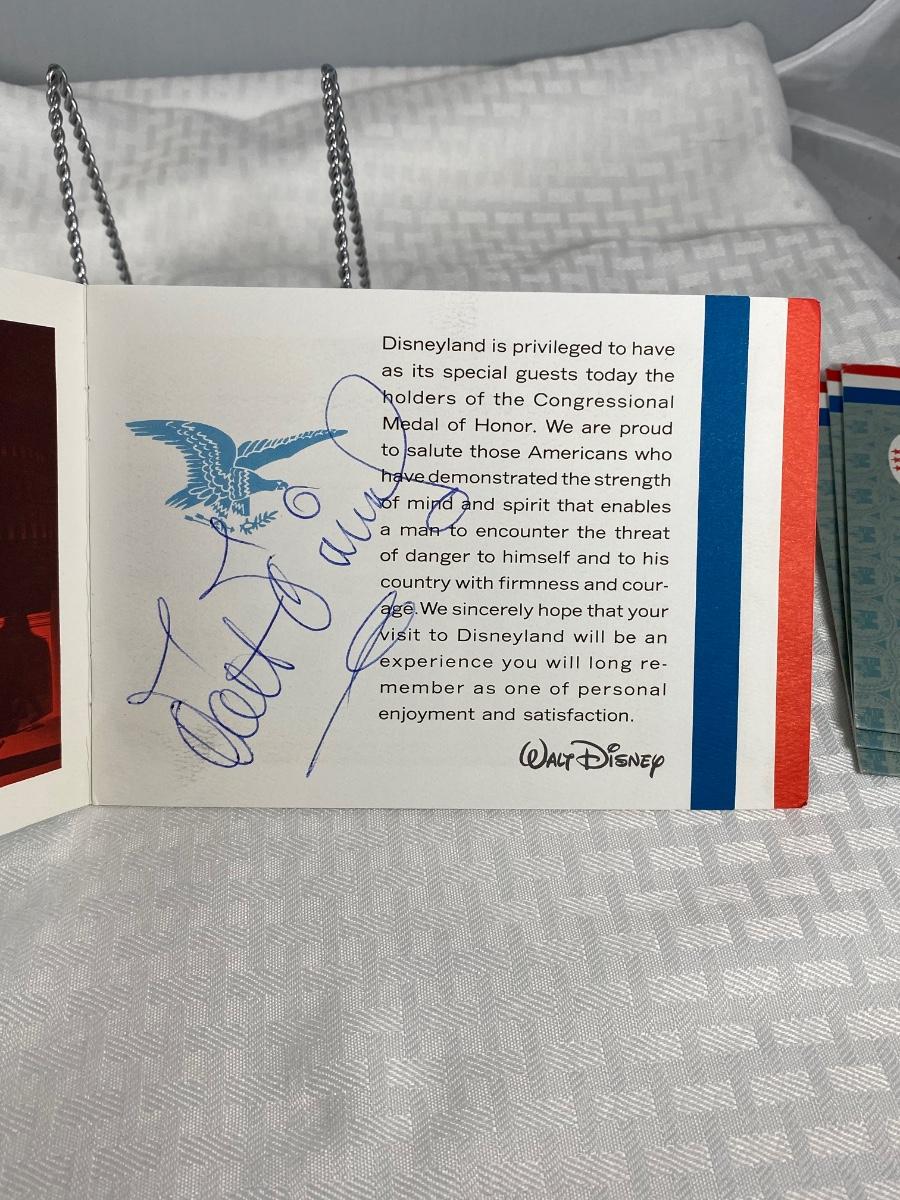 Rare set of 4 event booklets from Disneyland. Dated October 14, 1966, these are programs from Disneyland Salutes Medal of Honor Holders. From the estate of a WWII Medal of Honor recipient. All are in good condition, a few spots here and there. Booklet gave thanks to MOH recipients, listed events of the day, and the menu for the day. Inside one booklet is the signature from Walt Disney. Compared to signatures online and where these originated from it is believed to be authentic but there is no COA, it has not been appraised or certified.