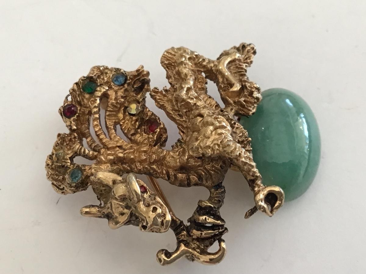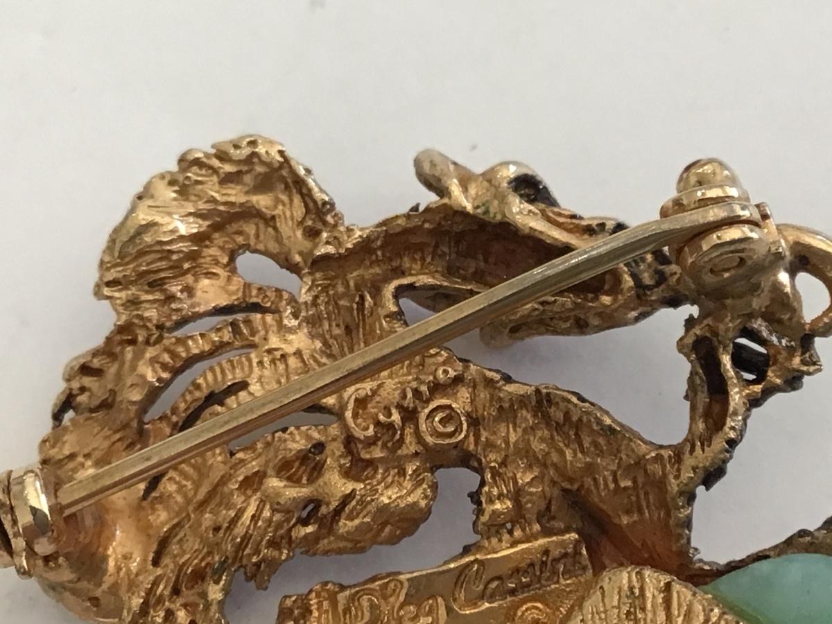 Rare Signed Oleg Cassini Dated Jade Rhinestone Dragon Brooch 1964