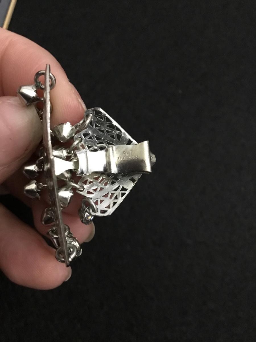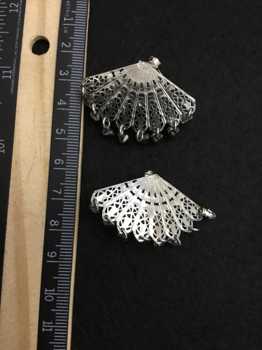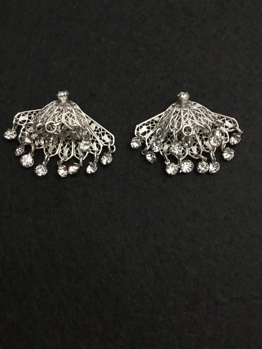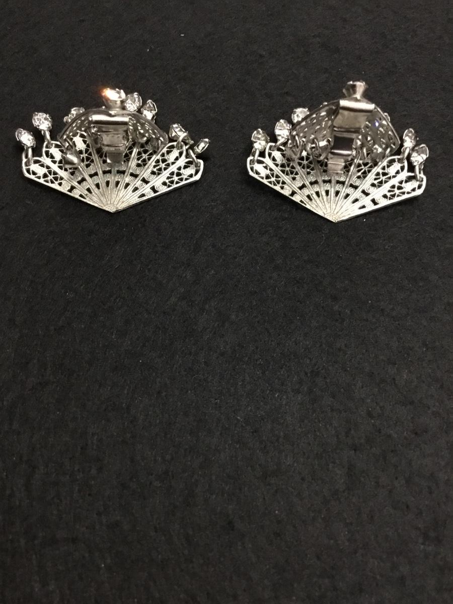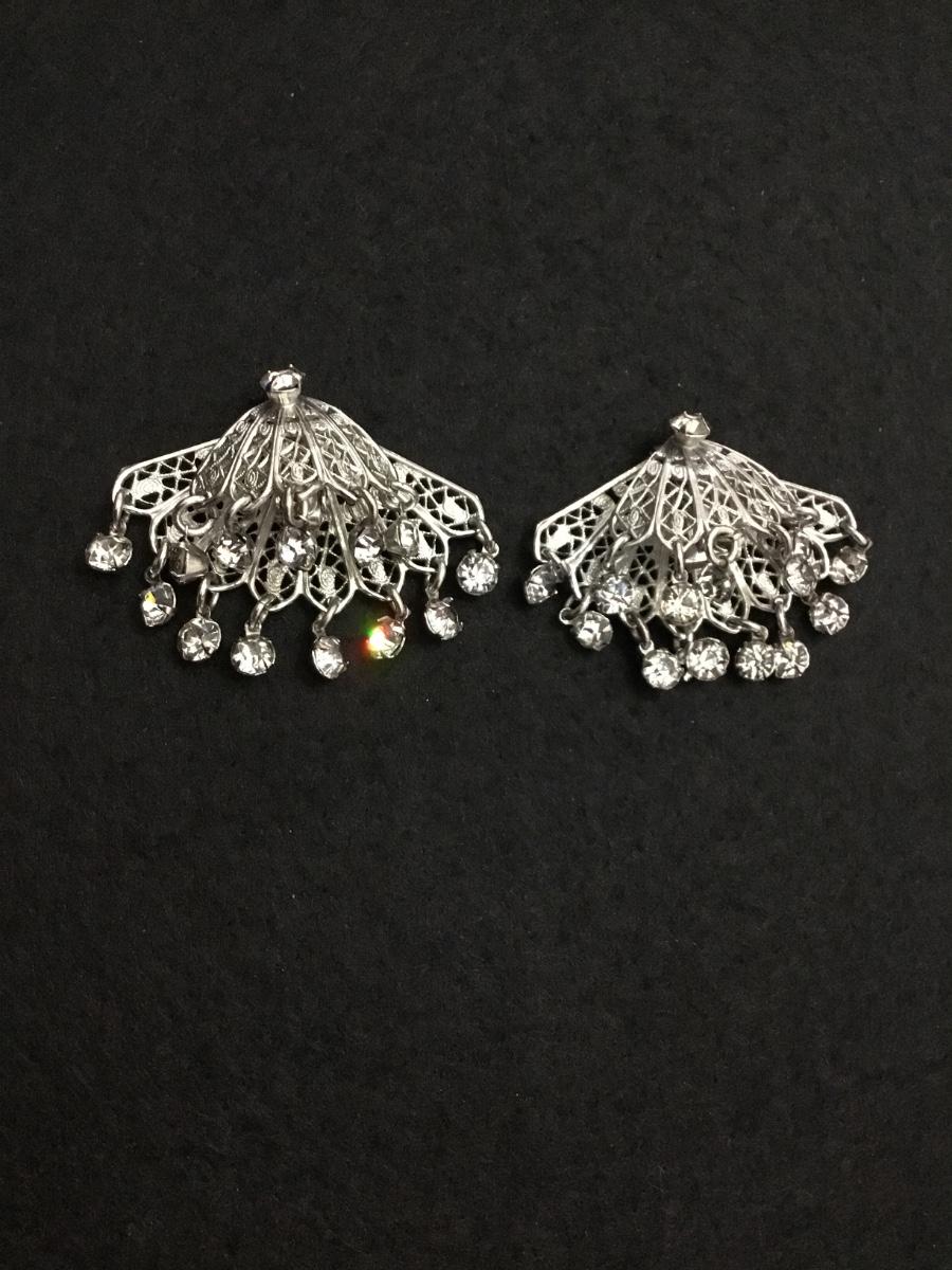 Rare Silver tone filagree, vintage, rhinestone fan clip on steam earrings