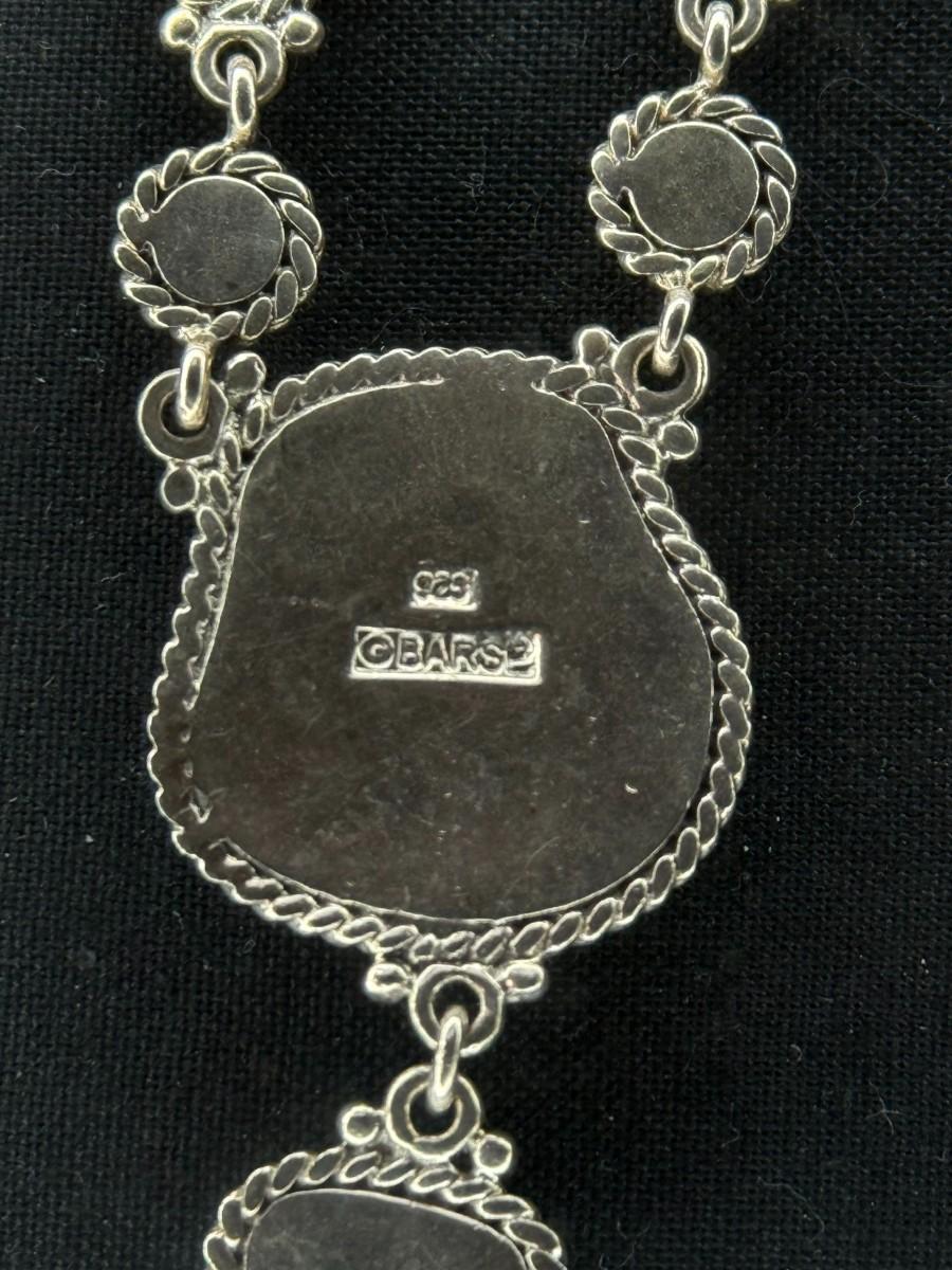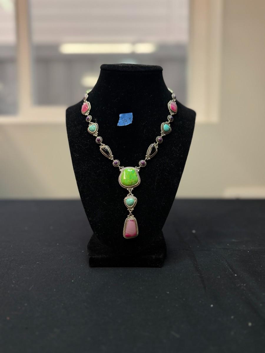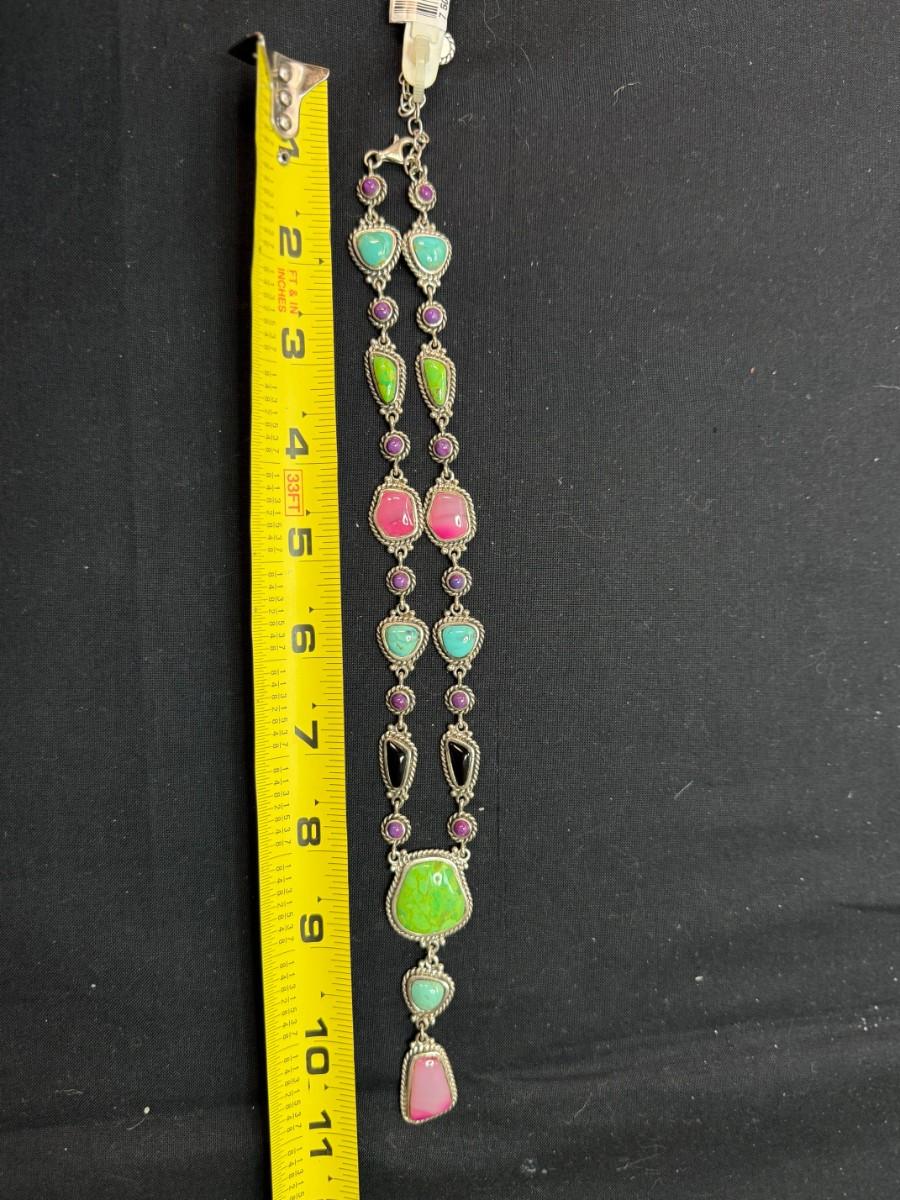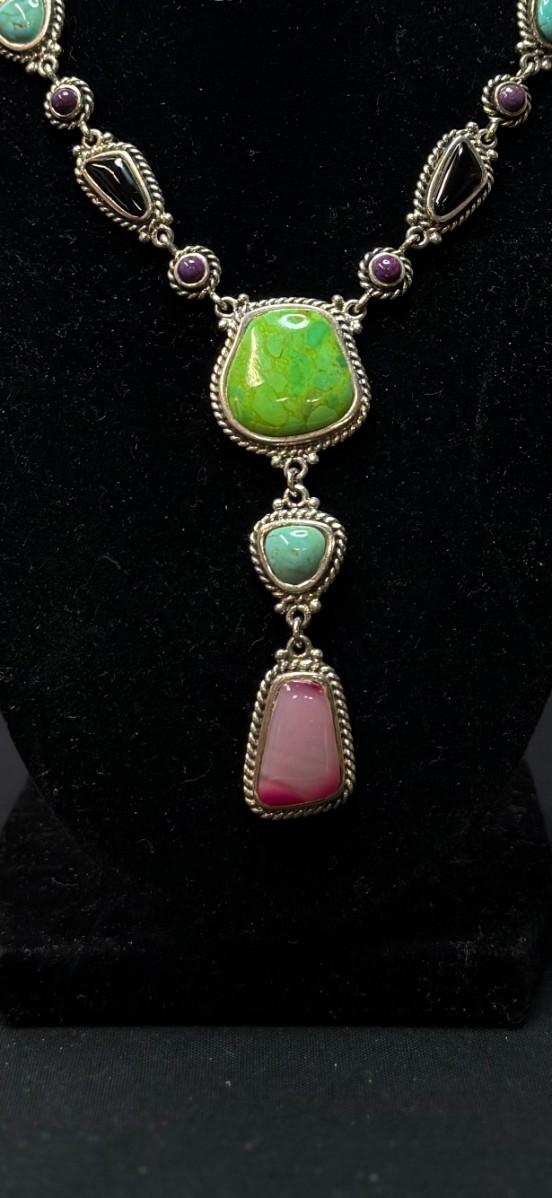 (Rare) Southwestern Sterling Silver Necklace Green Blue Turquoise Onyx Pink Purple