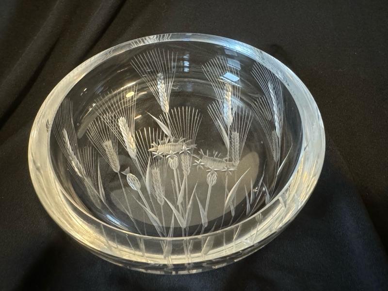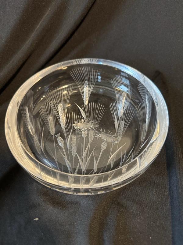 This is a rare elegant Bohemia Crystal dish in the style of Josef Svarc. The dish has an amazing thistle pattern with some etching to highlight the beautiful botanical motif. It is a large circular dish measuring 6" in diameter and is very heavy. It is in near mint condition with no cracks, chips, or scratches. This is an absolutely stunning piece! Thank you for viewing & bidding. This item is heavy but less fragile & can be shipped worldwide for an extra fee.