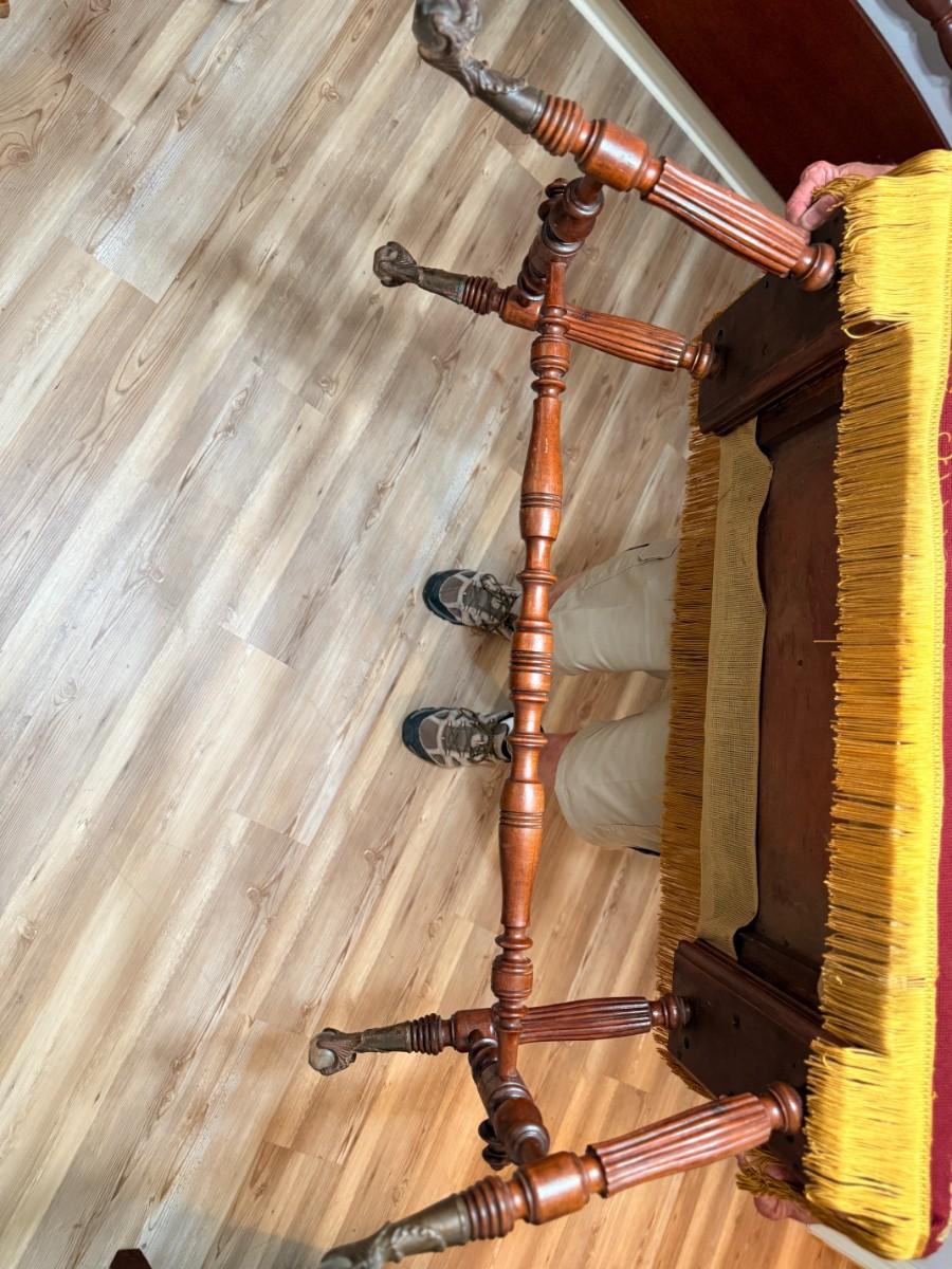 Gorgeous Needlepoint Cushion, Bench Finish in excellent condition, metal eagle claw feet clasping crystal ball very unique . 38.5Wx16Dx21.75H