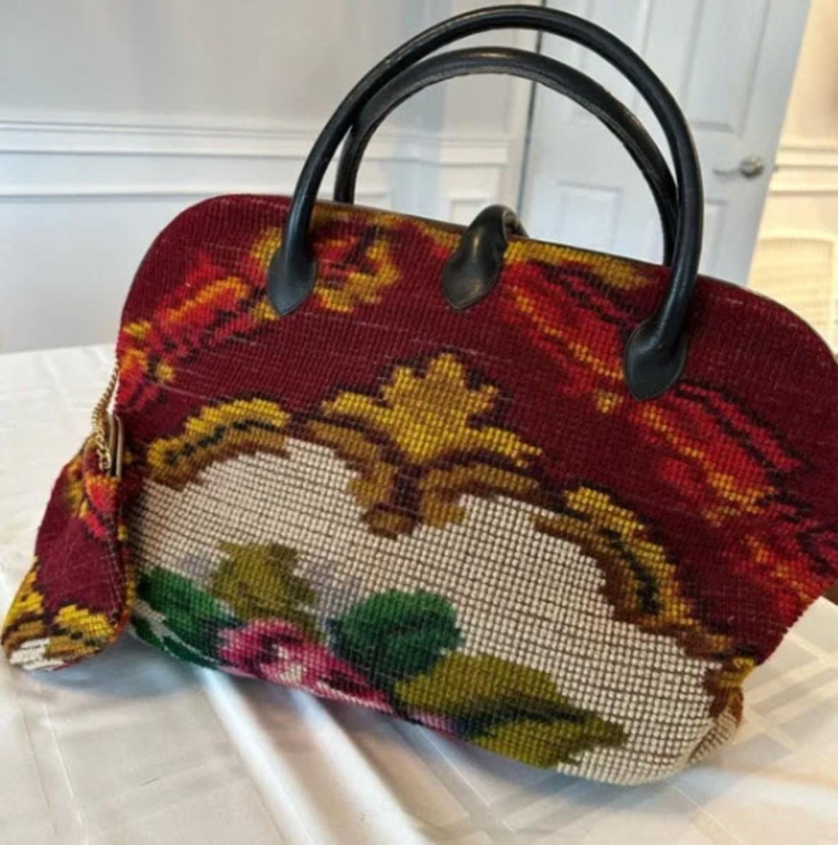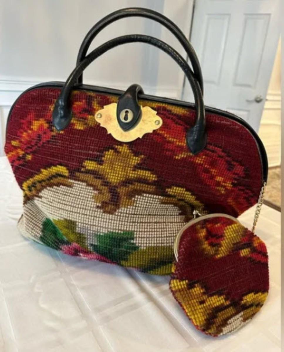 This beautiful Koret tapestry/carpet bag is adorned with a floral pattern of vibrant hues and comes with a matching coin purse. This bag is trimmed in black leather and was made in Italy. It is as much a statement piece today as it was 60 years ago. The outside is in amazingly good shape. The leather inside also has a few blemishes but for the age is in very good condition. This beauty has one open outer pocket and one flap pocket. Inside there is a large inner pocket and two side pockets. Please see photos. This overnight bag can hold the essentials plus a little more. It is 10.5 inches tall, 14.5 inches across and has a thickness of 7 inches wide including the outer pockets.