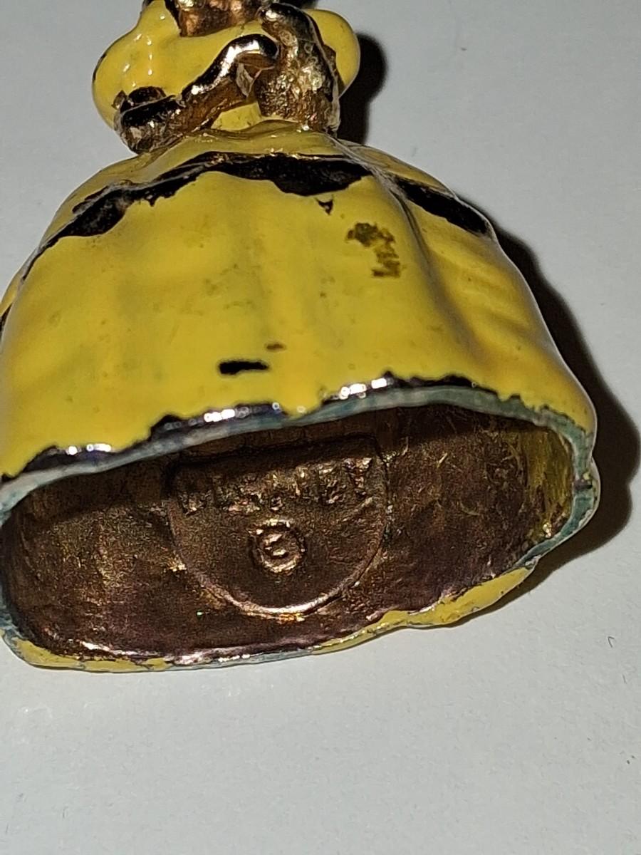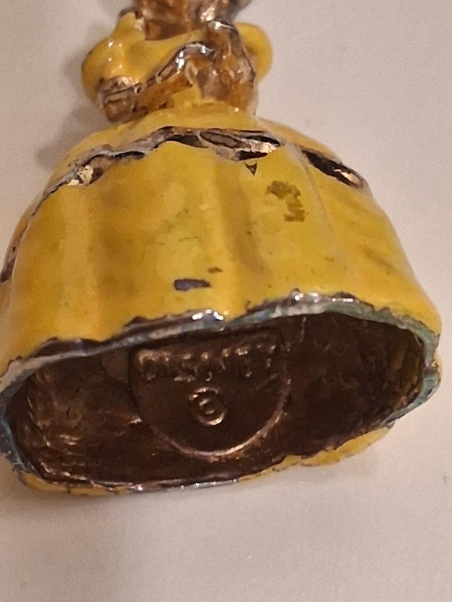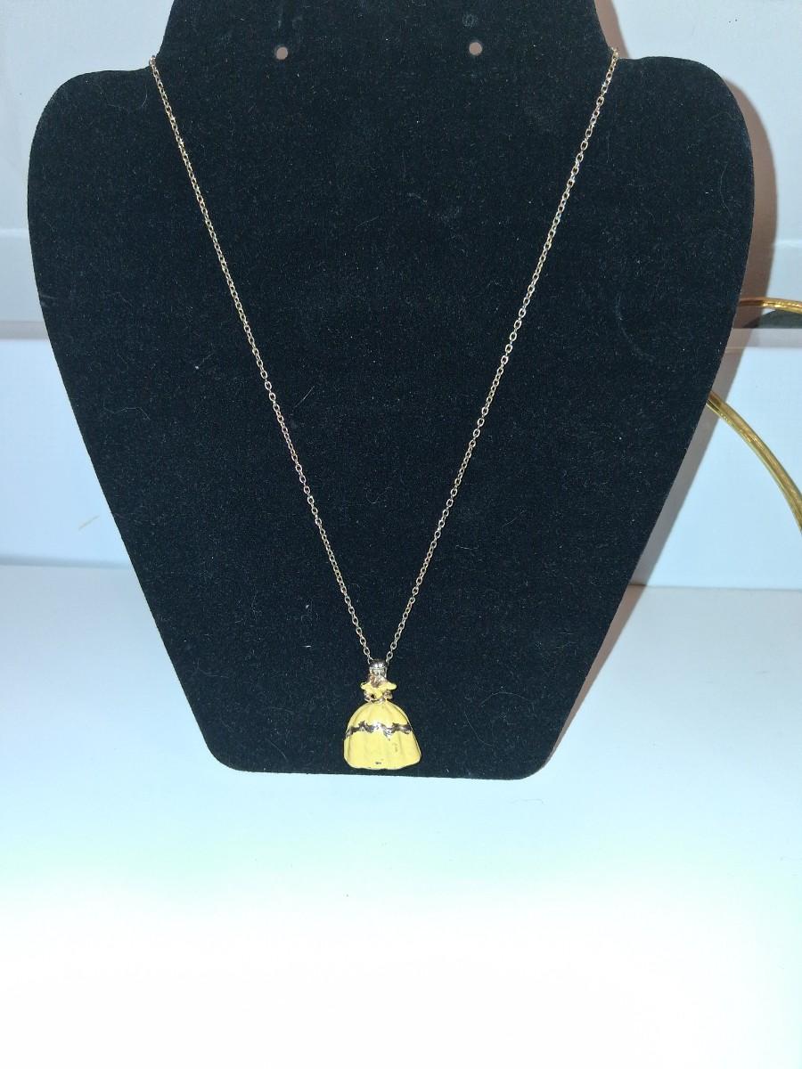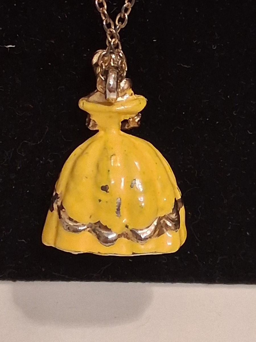 Beautiful Vintage Belle Necklace. Rare. Gold tone with Yellow Ball Gown. Some paint loss on gown. Face is so well done. Have never seen another like it.