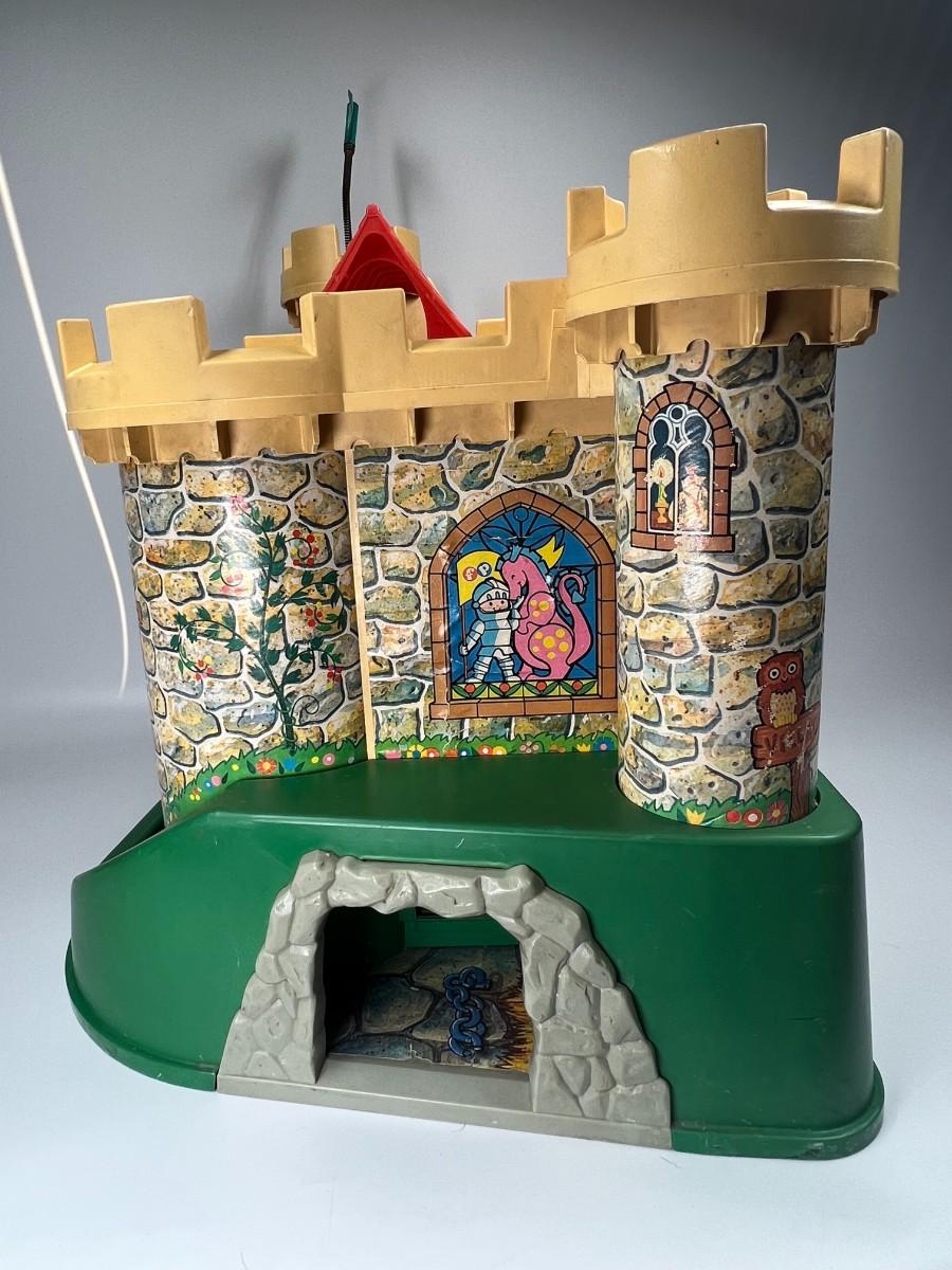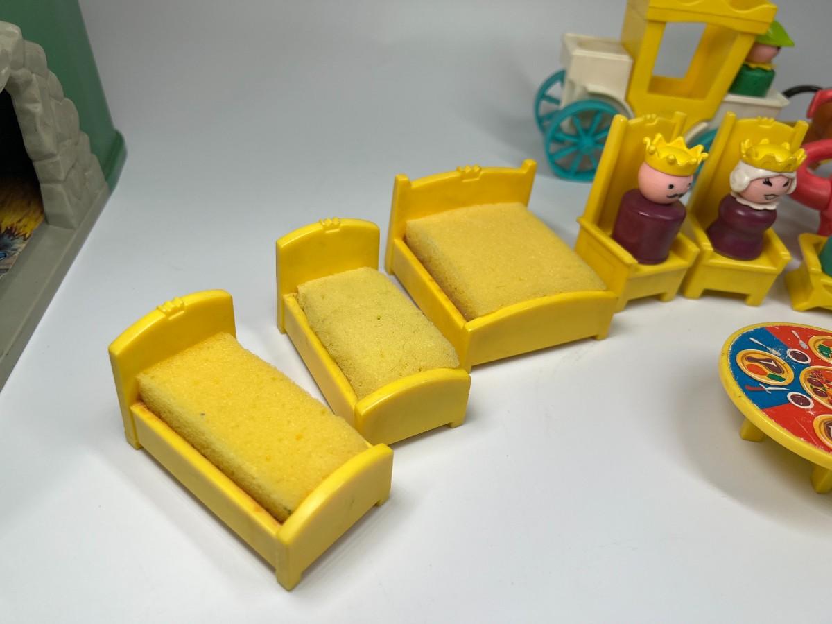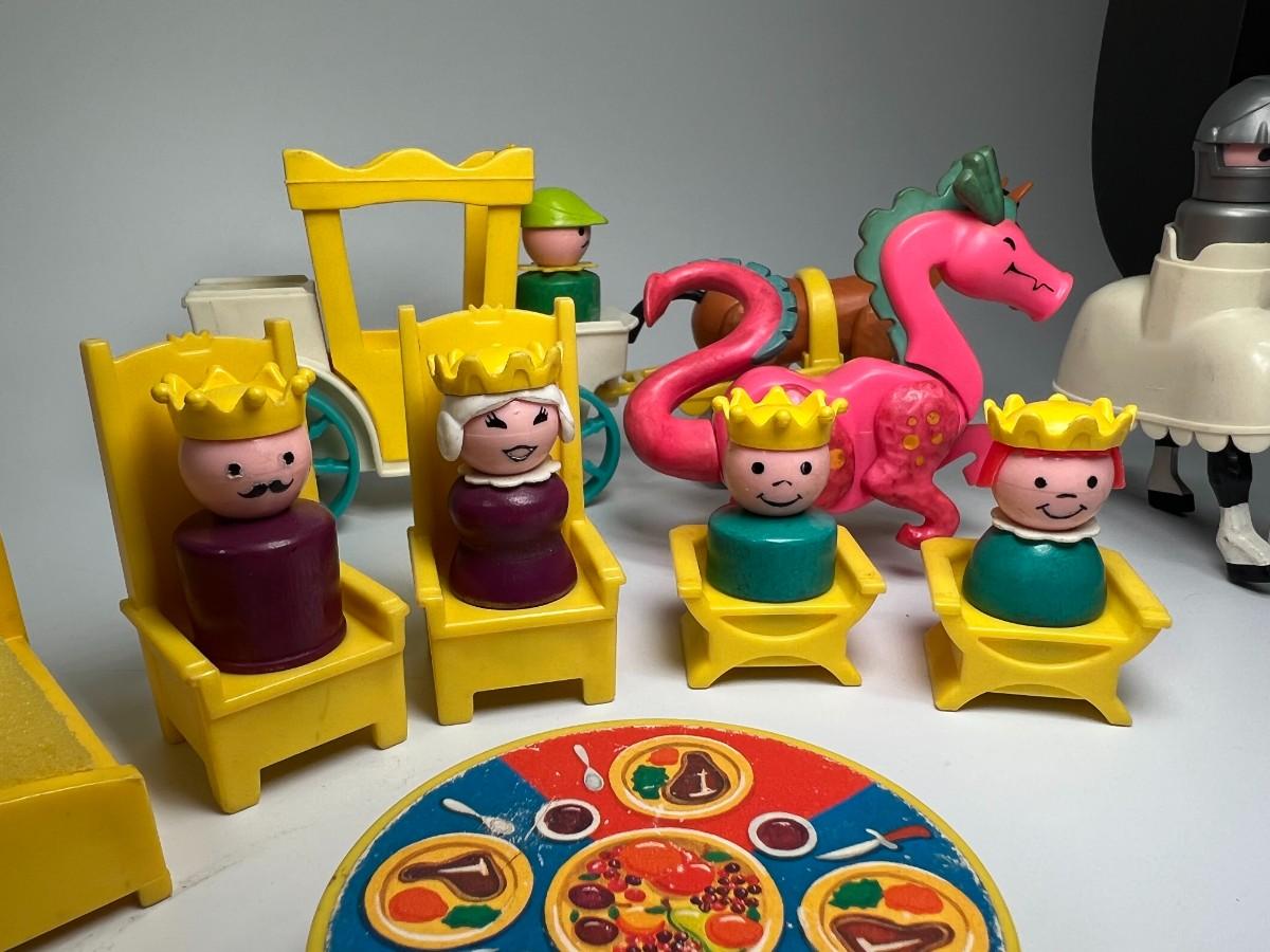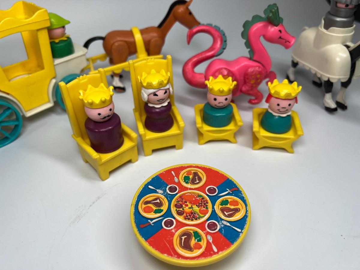 Rare & Complete! Fisher Price Little People playset #993 Play Family Castle. Released in the mid 1970s with a classic edition released late 1980s. Included with the castle base is the royal carriage with horse and harness, 1 double bed, 2 single beds, round dining table with sticker intact, 2 tall thrones, 2 small thrones, black horse wearing saddle, pink dragon, king, queen, prince, princess, knight in armor, and woodsman. In good vintage condition, there is light wear as expected with age and being played with.