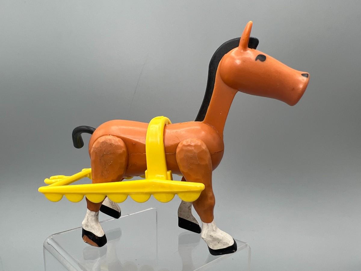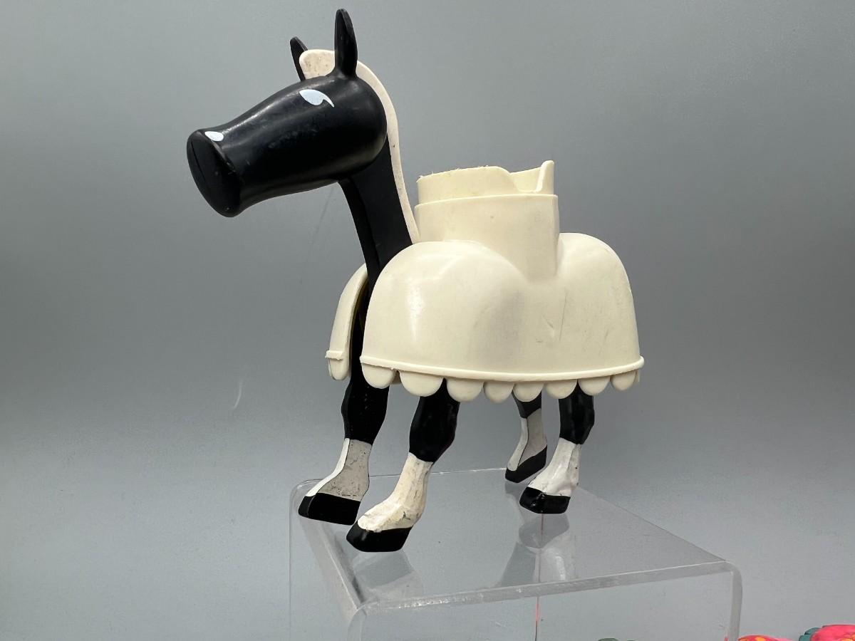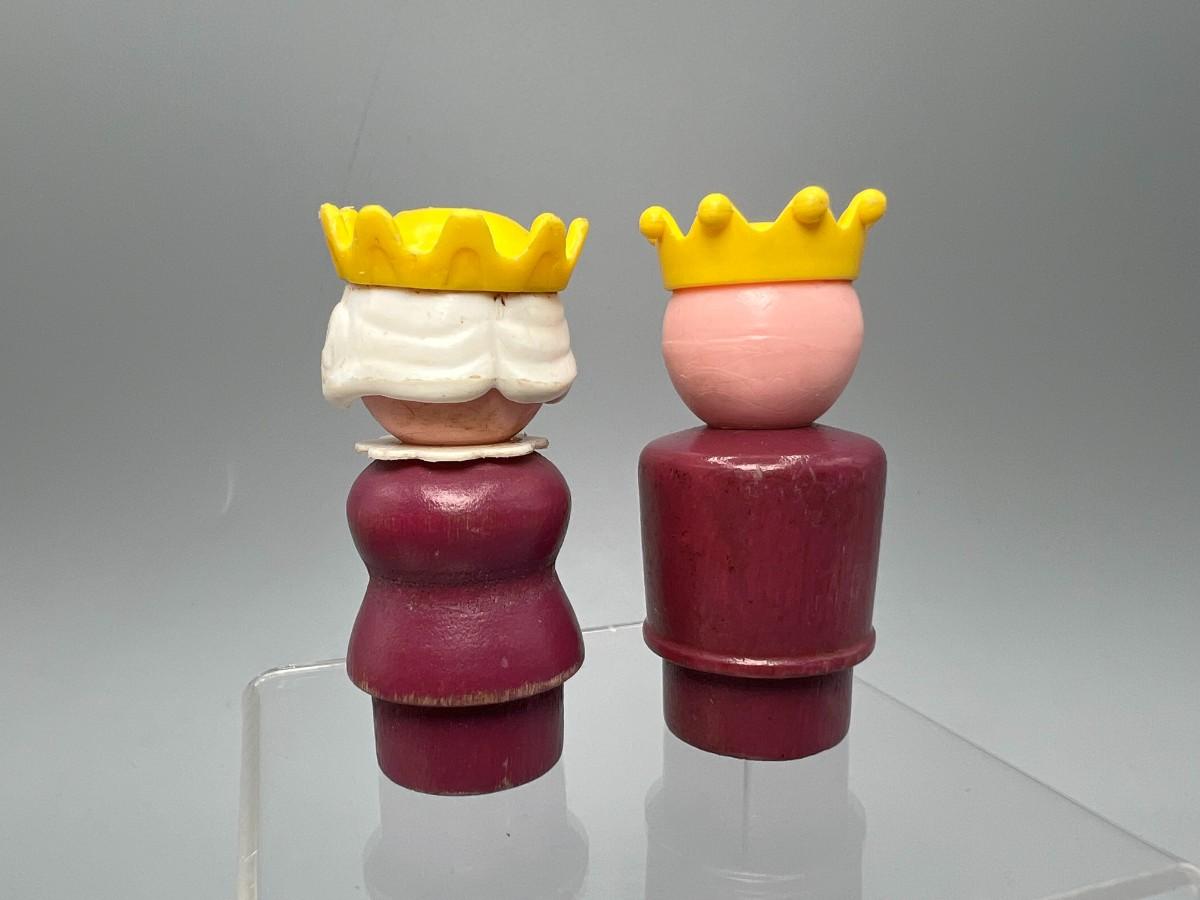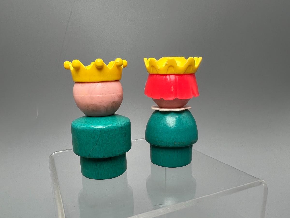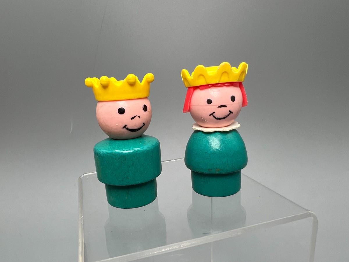 Rare & Complete! Fisher Price Little People playset #993 Play Family Castle. Released in the mid 1970s with a classic edition released late 1980s. Included with the castle base is the royal carriage with horse and harness, 1 double bed, 2 single beds, round dining table with sticker intact, 2 tall thrones, 2 small thrones, black horse wearing saddle, pink dragon, king, queen, prince, princess, knight in armor, and woodsman. In good vintage condition, there is light wear as expected with age and being played with.