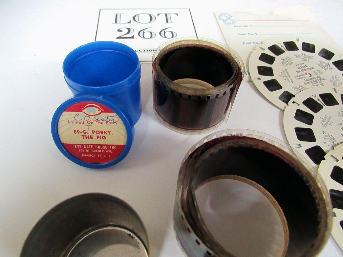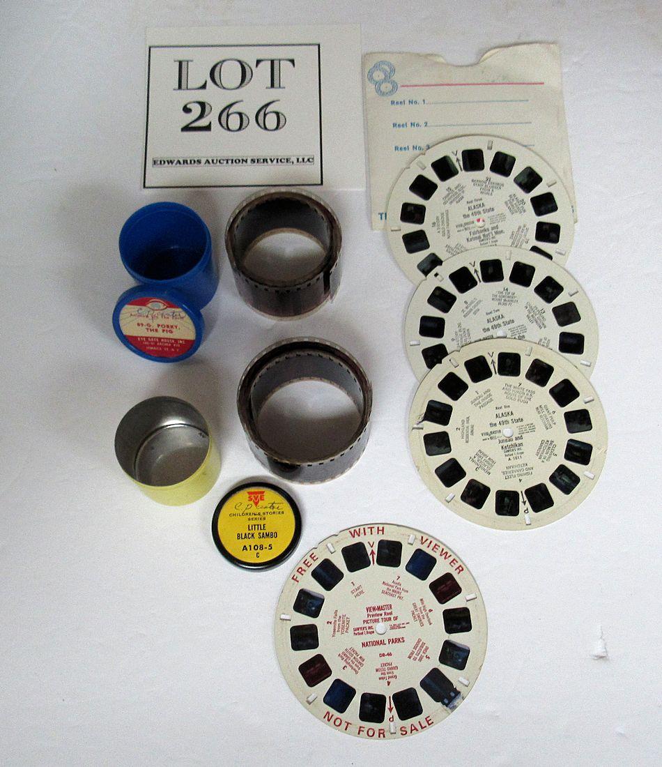 Little Black Sambo film is short, and is rare. I can't find another one like it on internet search at the moment. All in good shape. The view master reels are National Parks, 1 reel, and Alaska, A-1011, 3 reels. Good shape. The Porky the Pig film is not the comic but from the animals on the Farm series, #89-6, good shape. Shipping is available at shipping cost plus $5.00 handling fee on up to 6 lots, $10.00 handling fee on 7 or more lots or two boxes. $15.00 handling fee on 3 boxes. Helps cover shipping materials and labor cost.