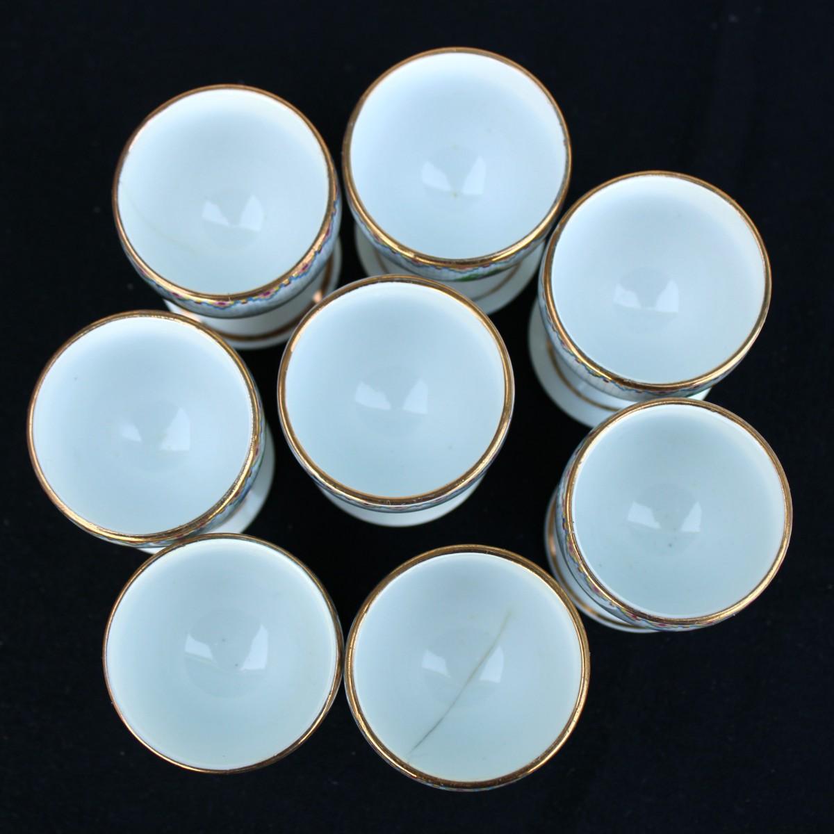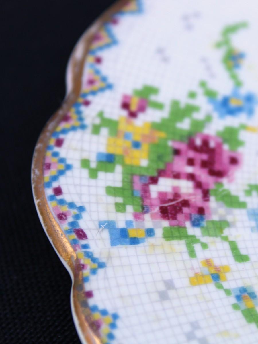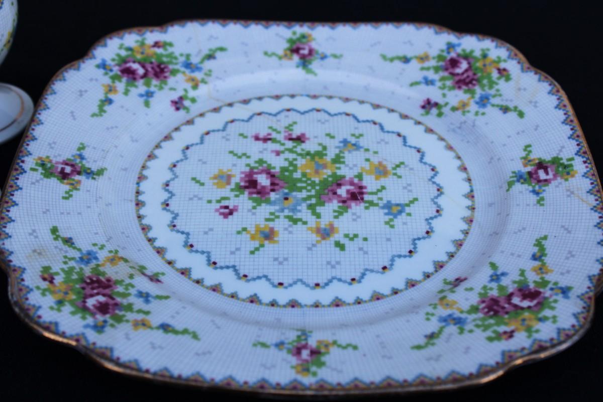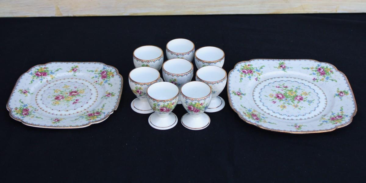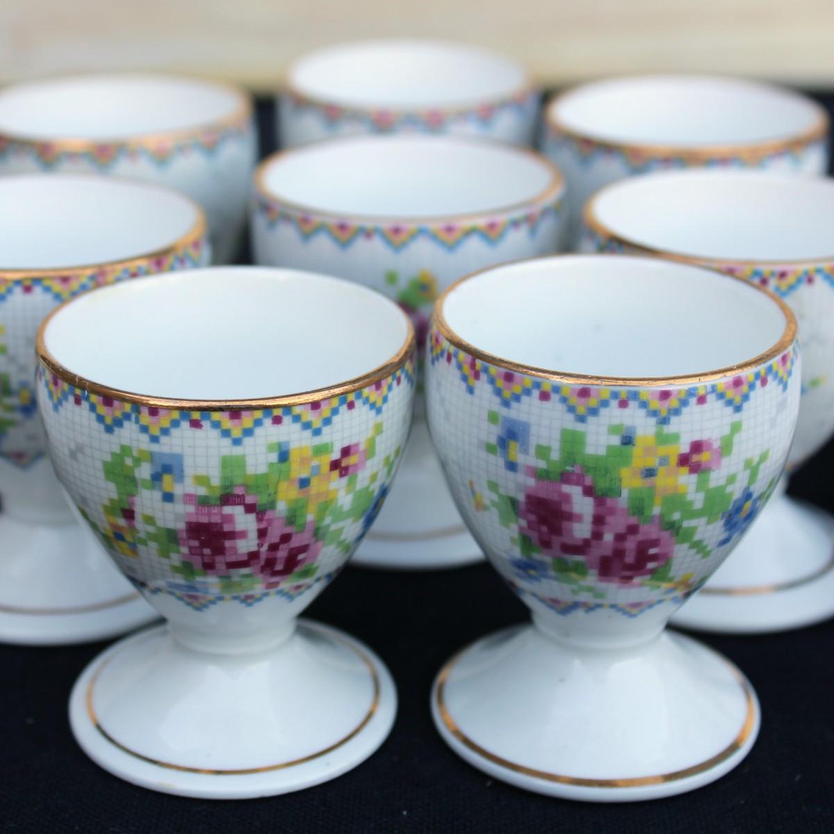 Rare Vintage Royal Albert Cross Stitch Floral Gold Edging Set. 2 Square Dessert Plates and 8 Petit Point Egg Cups. Small cracks in one egg cup and one plate.