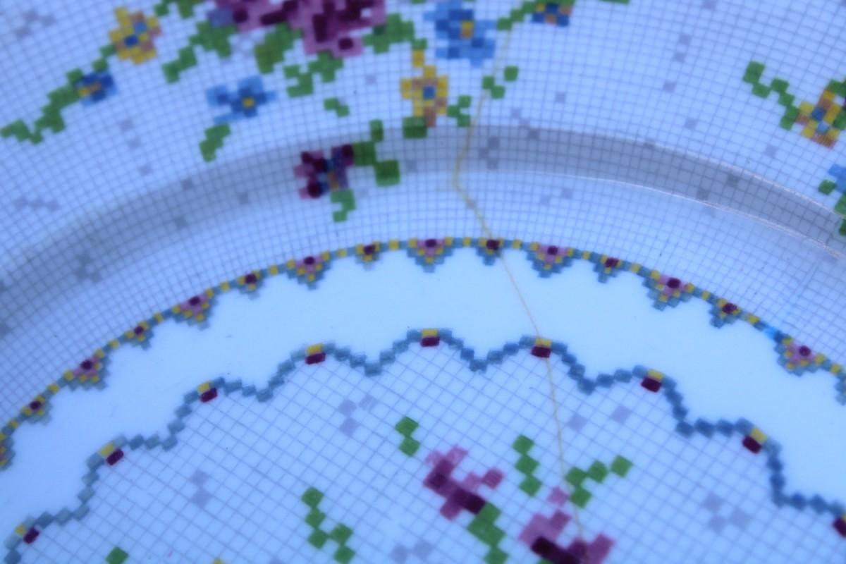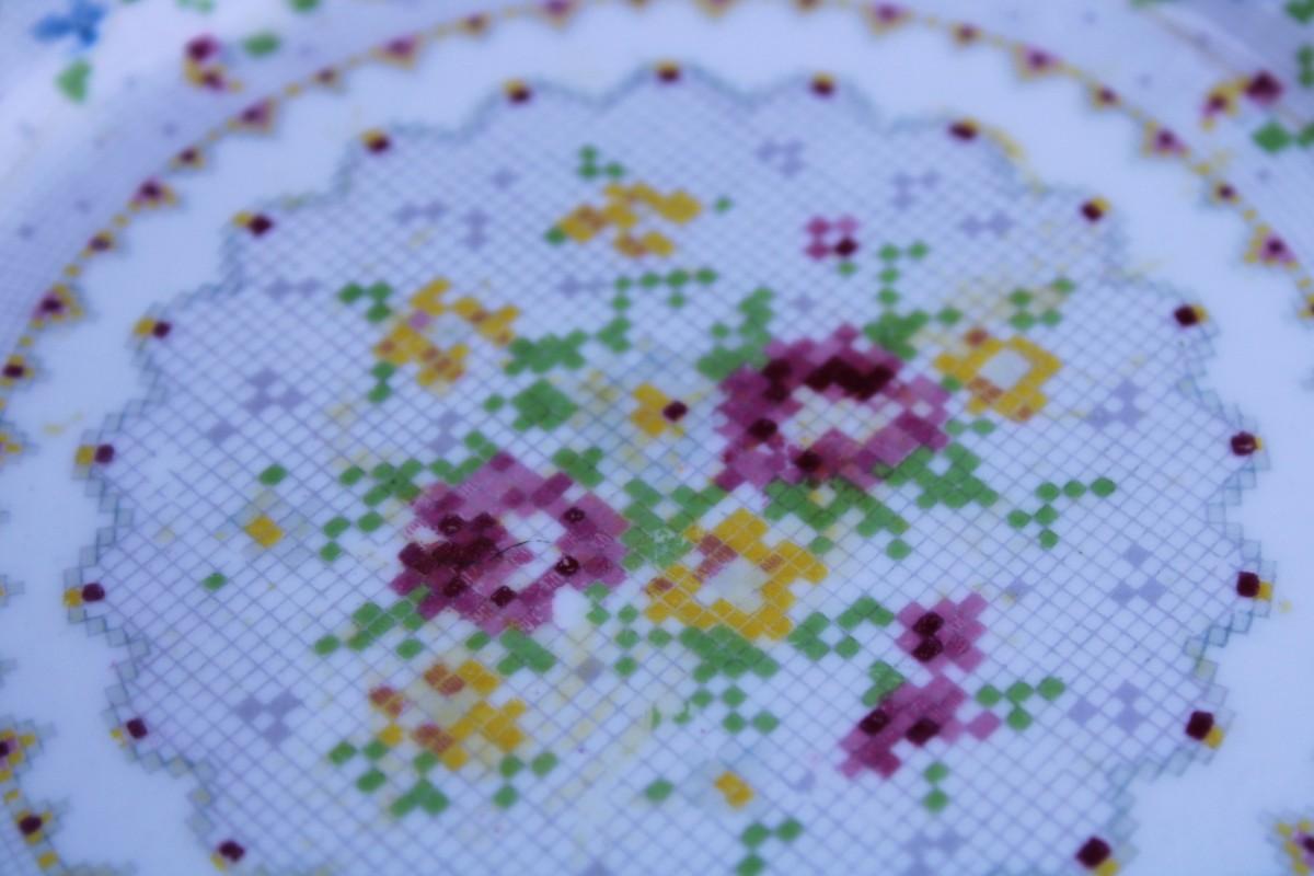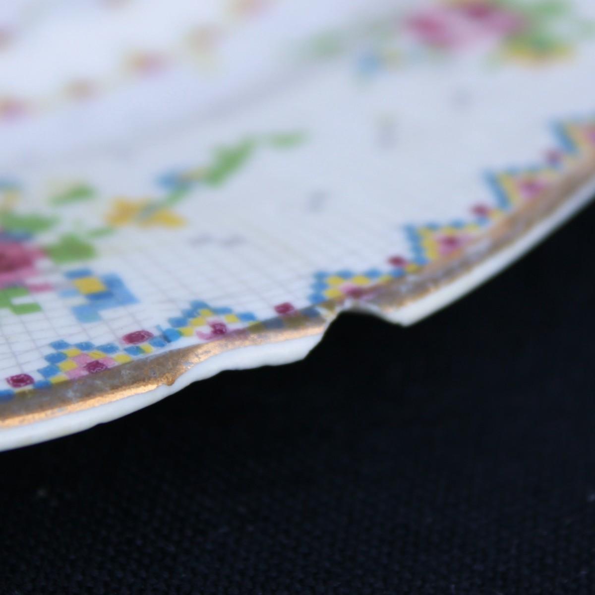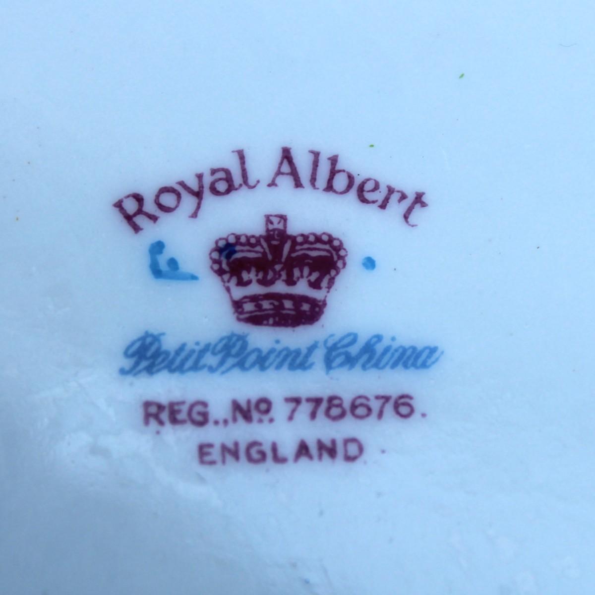 Rare Vintage Royal Albert Cross Stitch Floral Gold Edging Set. 2 Square Dessert Plates and 8 Petit Point Egg Cups. Small cracks in one egg cup and one plate.