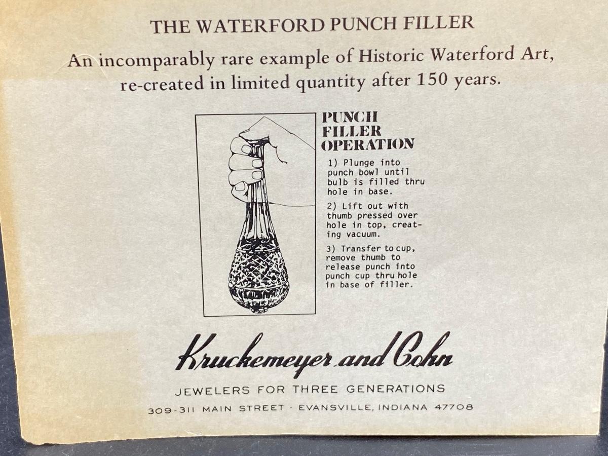 Vintage Waterford Crystal punch filler. Filler has a hole at each end, user would dip into punch, let fill then cover top hole with finger. Once over glass, you remove finger and punch will fill the glass. Interesting piece. In good condition, has original item card with it. Rare piece to own. Marked and original sticker attached.