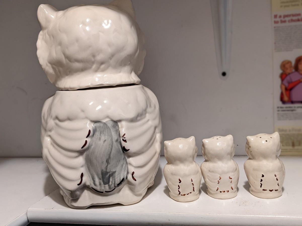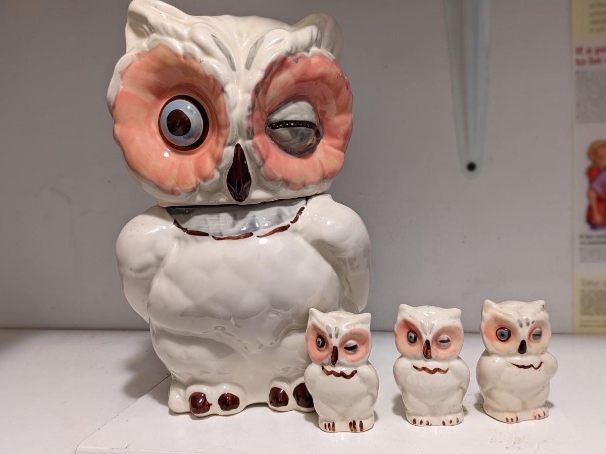 Rare Vtg Shawnee Winking Owl Cookie Jar and S/P Shakers+1