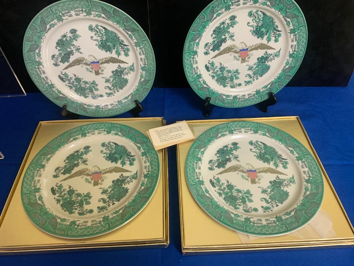 This lot includes FOUR plates - 2 in boxes, but just one "Guest Pick-Up Ticket" as we assume the set of 4 was waiting at the door for the previous owner. No chips, cracks or repairs.