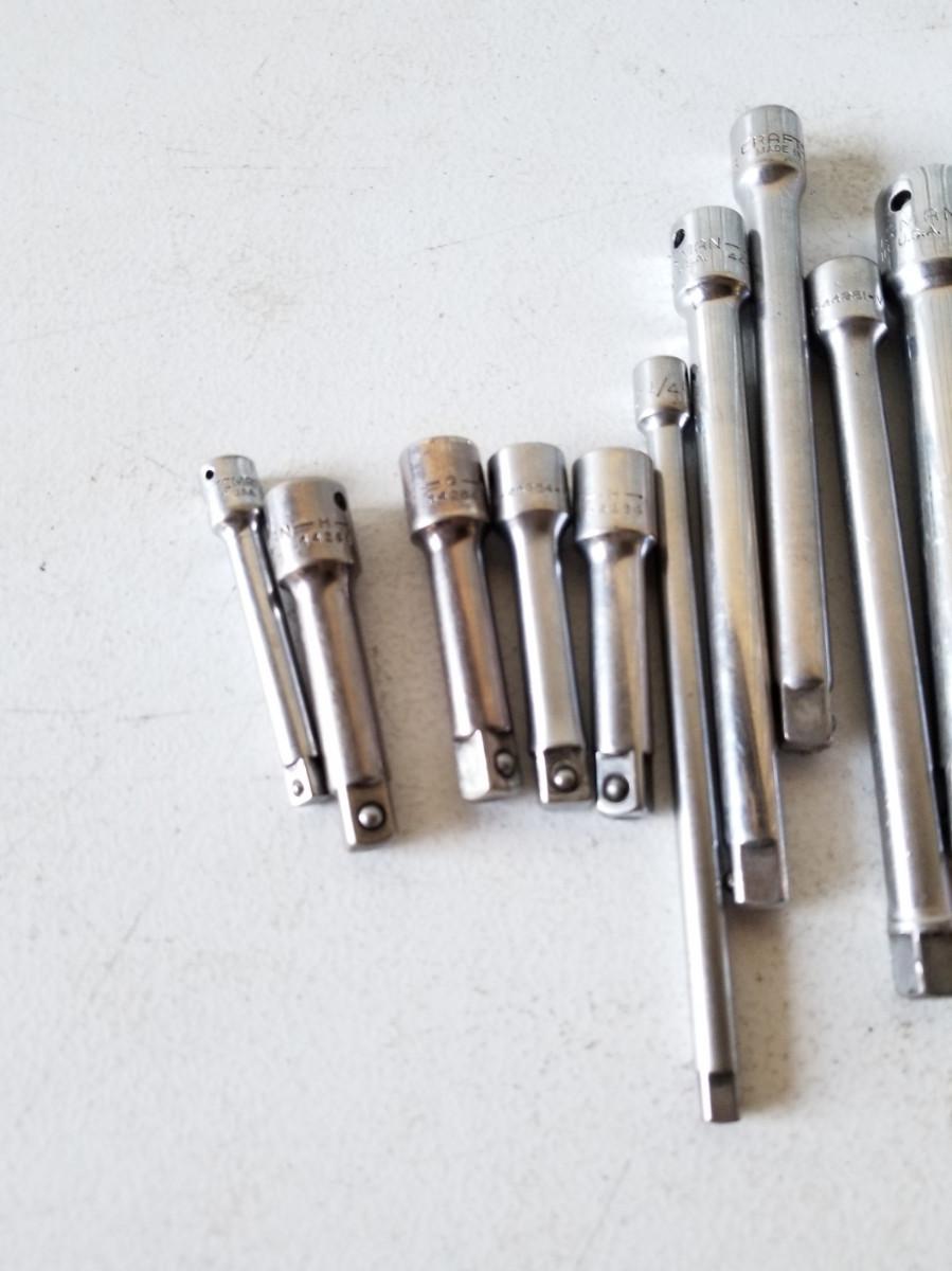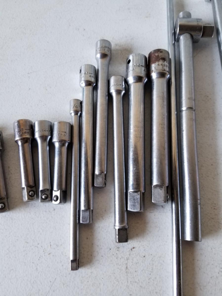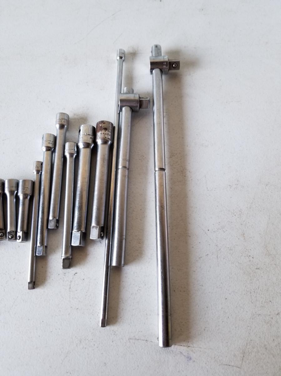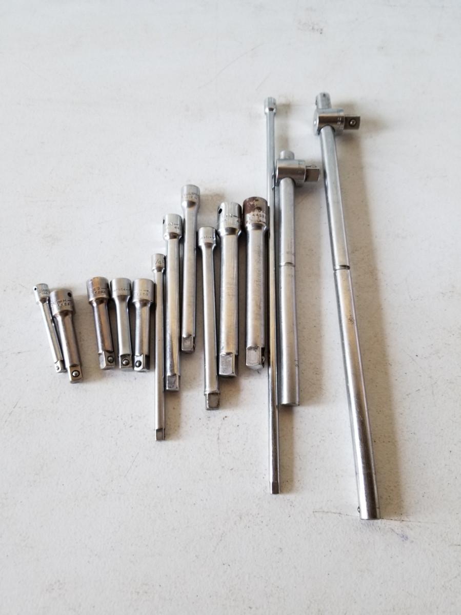 2- Craftsman 1/2" drive 9" & 15" slide bars, 2- 1/2" drive extensions, 3- 3/8" drive, 3" extensions, 3- 3/8" drive extensions, 6", and 3- 1/4" drive extensions at 3", 6", and 9".