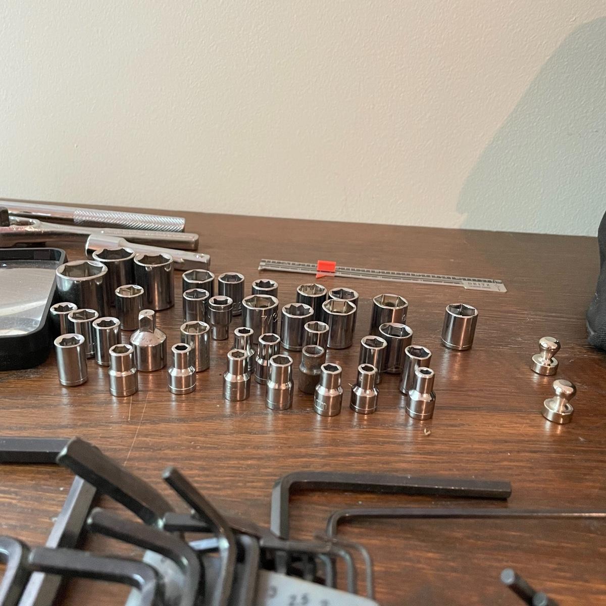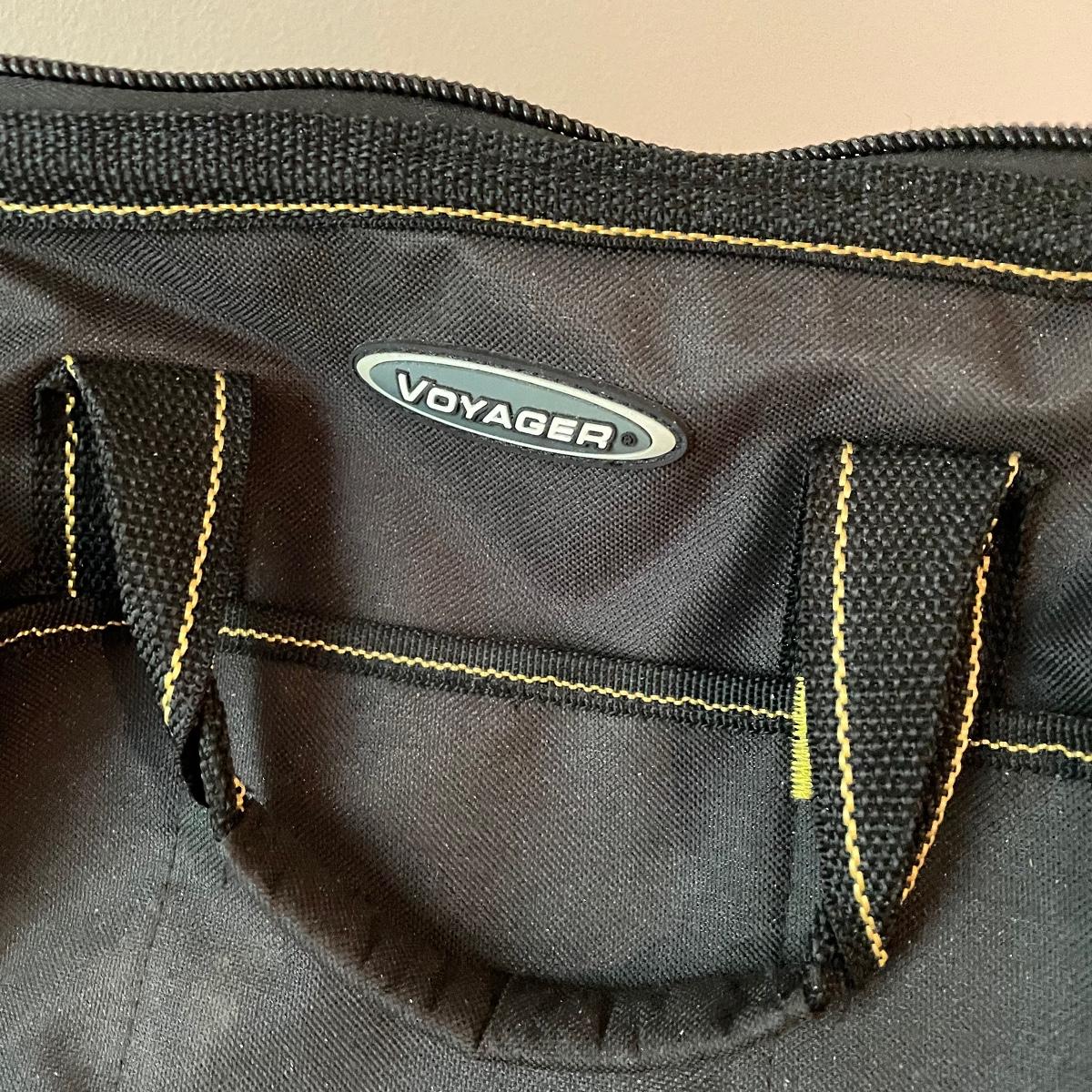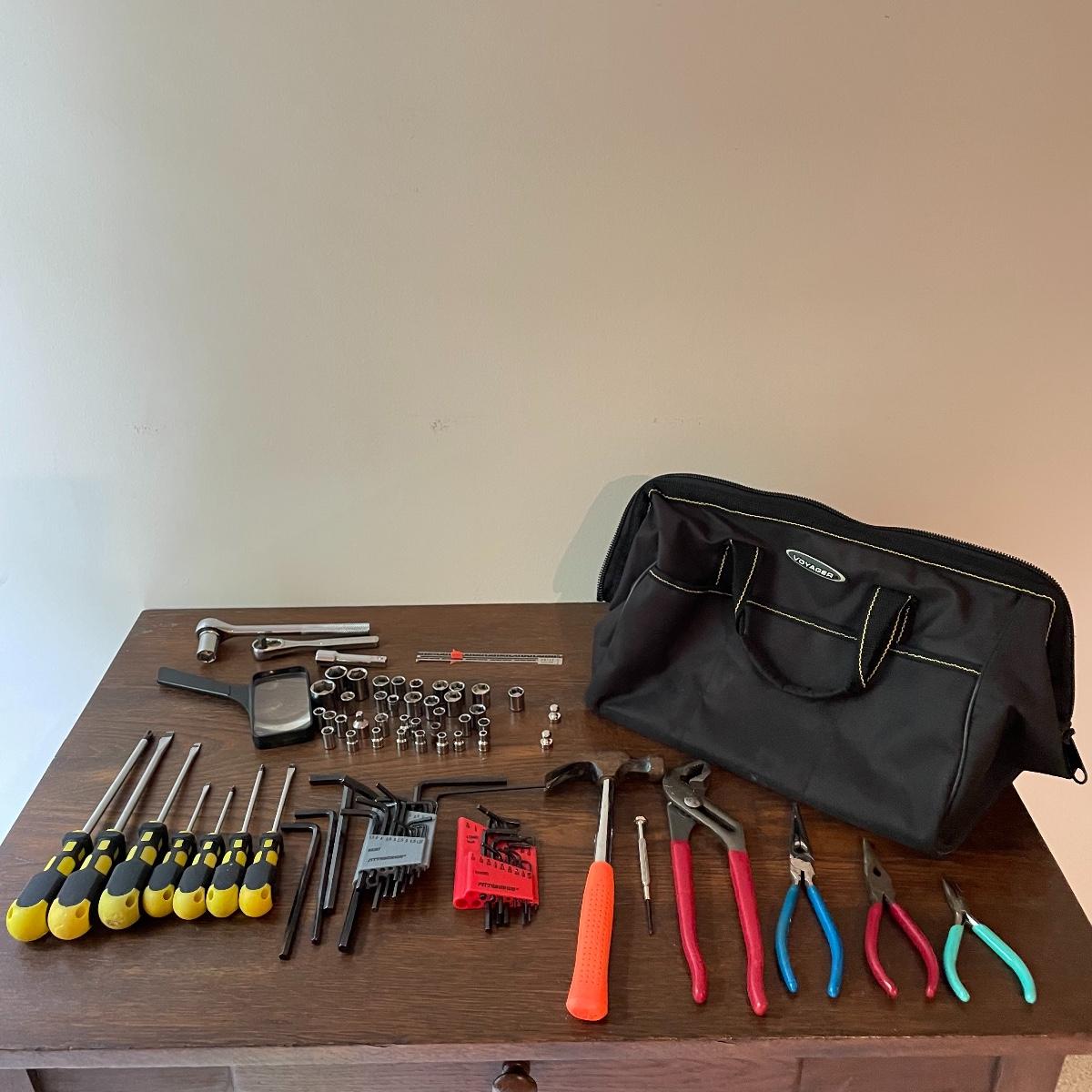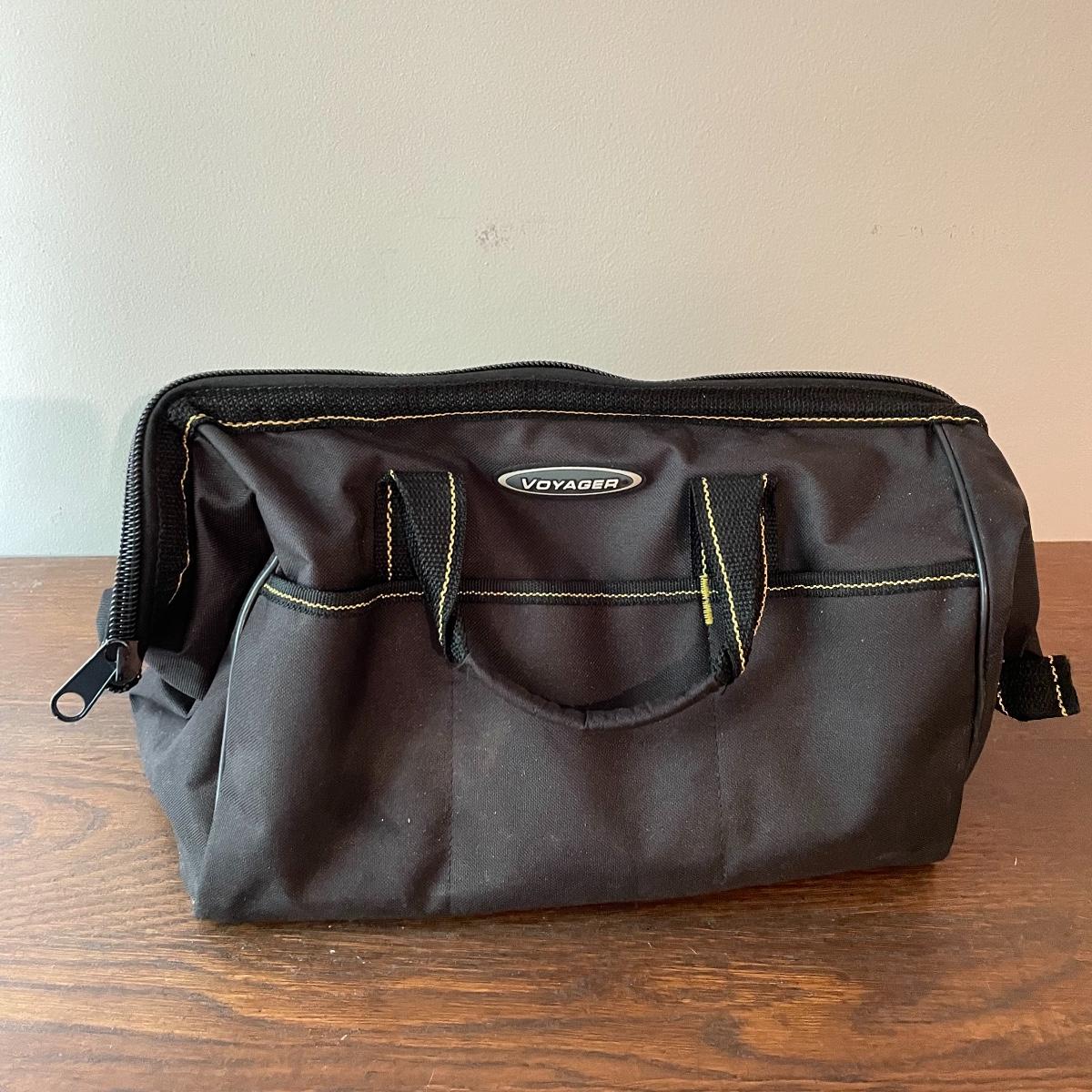 Voyager multi-pocket case with two ratchets and over thirty sockets. A seven piece screwdriver set, plenty of Allen wrenches, hammer, pliers, magnifying glass and two small magnets. Voyager bag measures approximately 14” x 10” x 10”. Local pick up only.