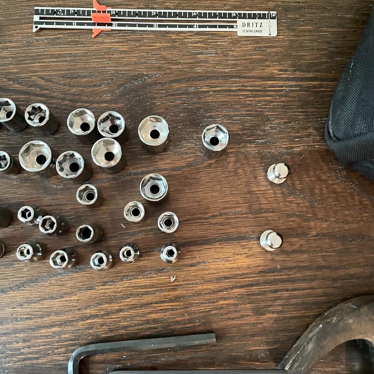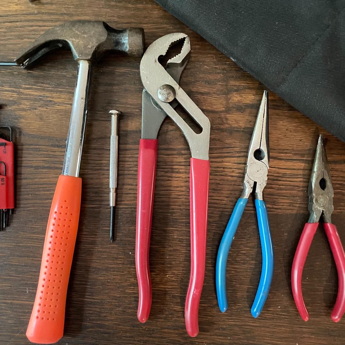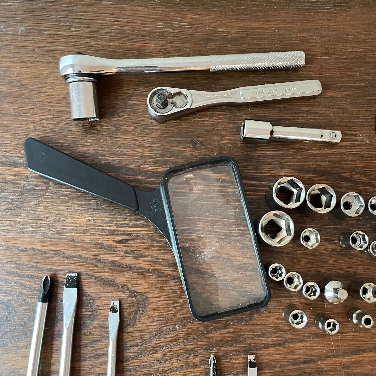 Voyager multi-pocket case with two ratchets and over thirty sockets. A seven piece screwdriver set, plenty of Allen wrenches, hammer, pliers, magnifying glass and two small magnets. Voyager bag measures approximately 14” x 10” x 10”. Local pick up only.