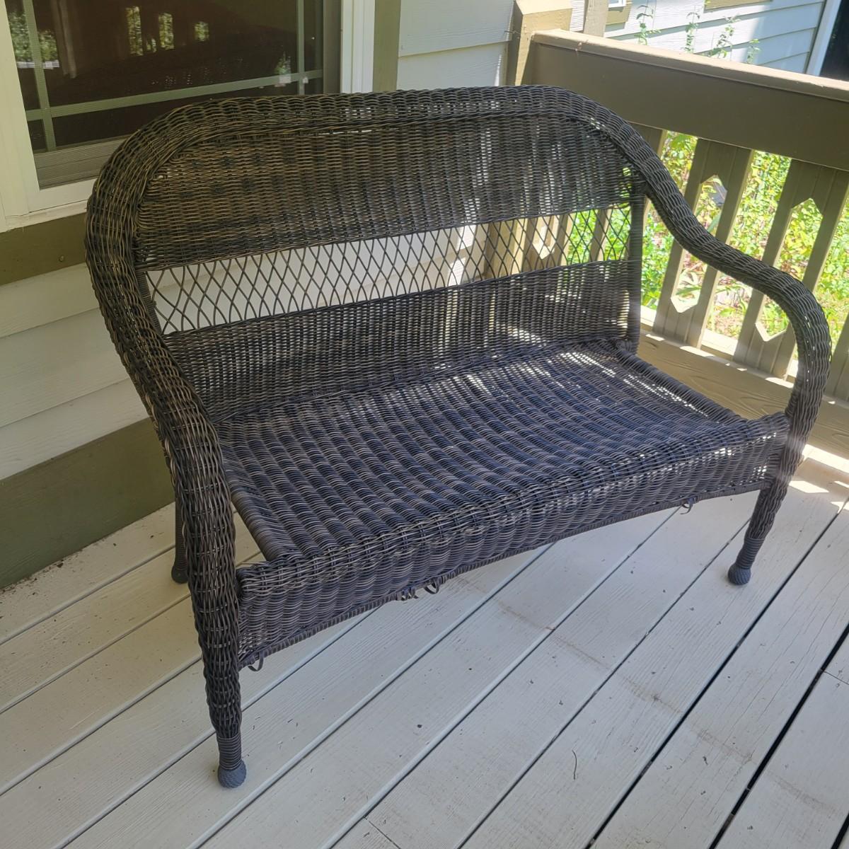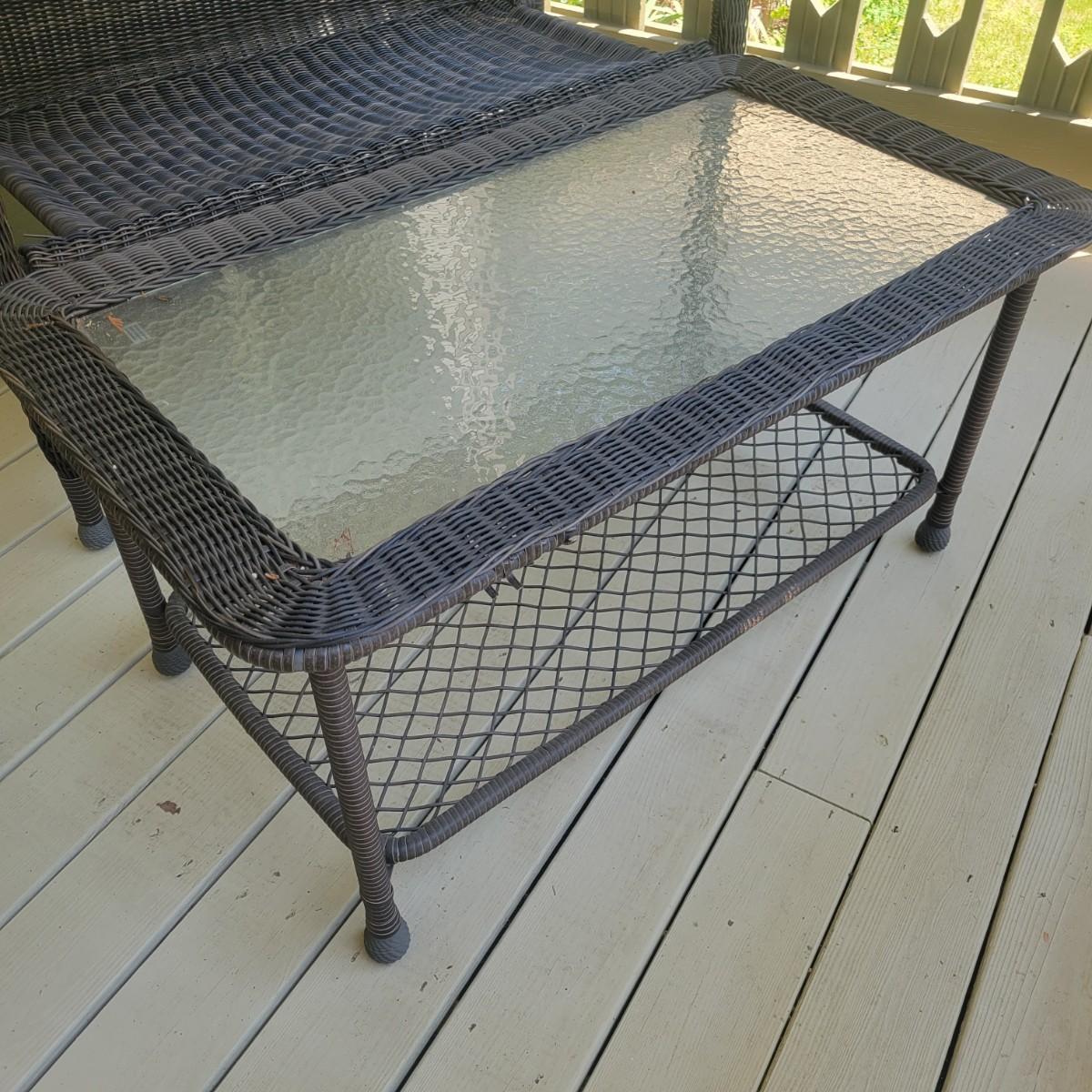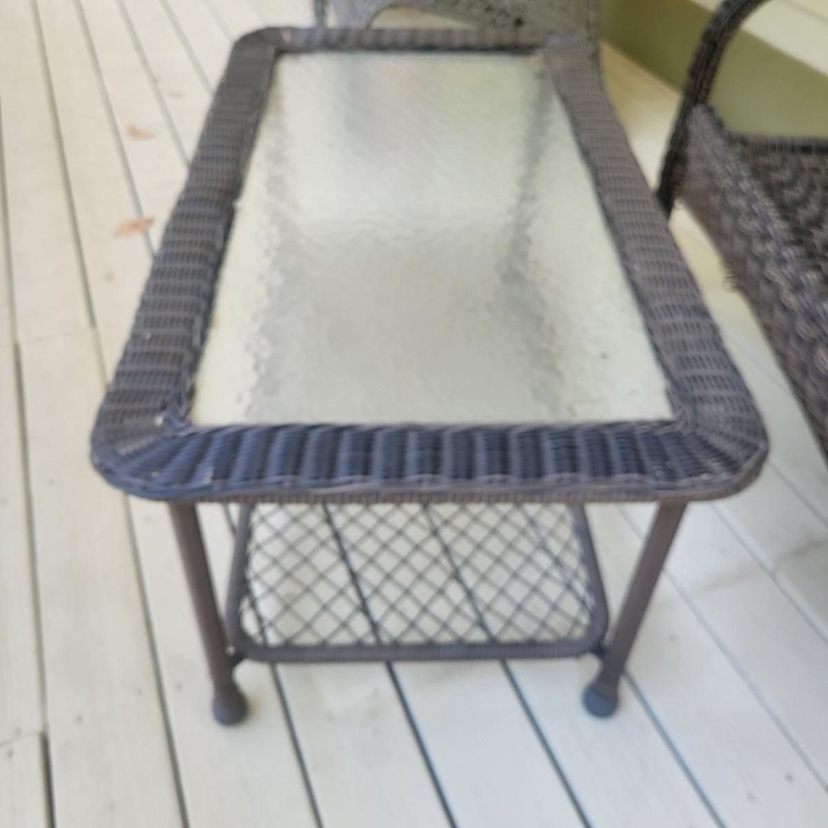 A faux rattan bench and glass topped table. The bench measures approximately 48" x 26" x 35"H with a seat height of 17". The bench does have a few places that are unraveling. Also includes a tempered glass table with a matching rattan frame that measures approximately 42" x 24" x 20"H. Local pickup only