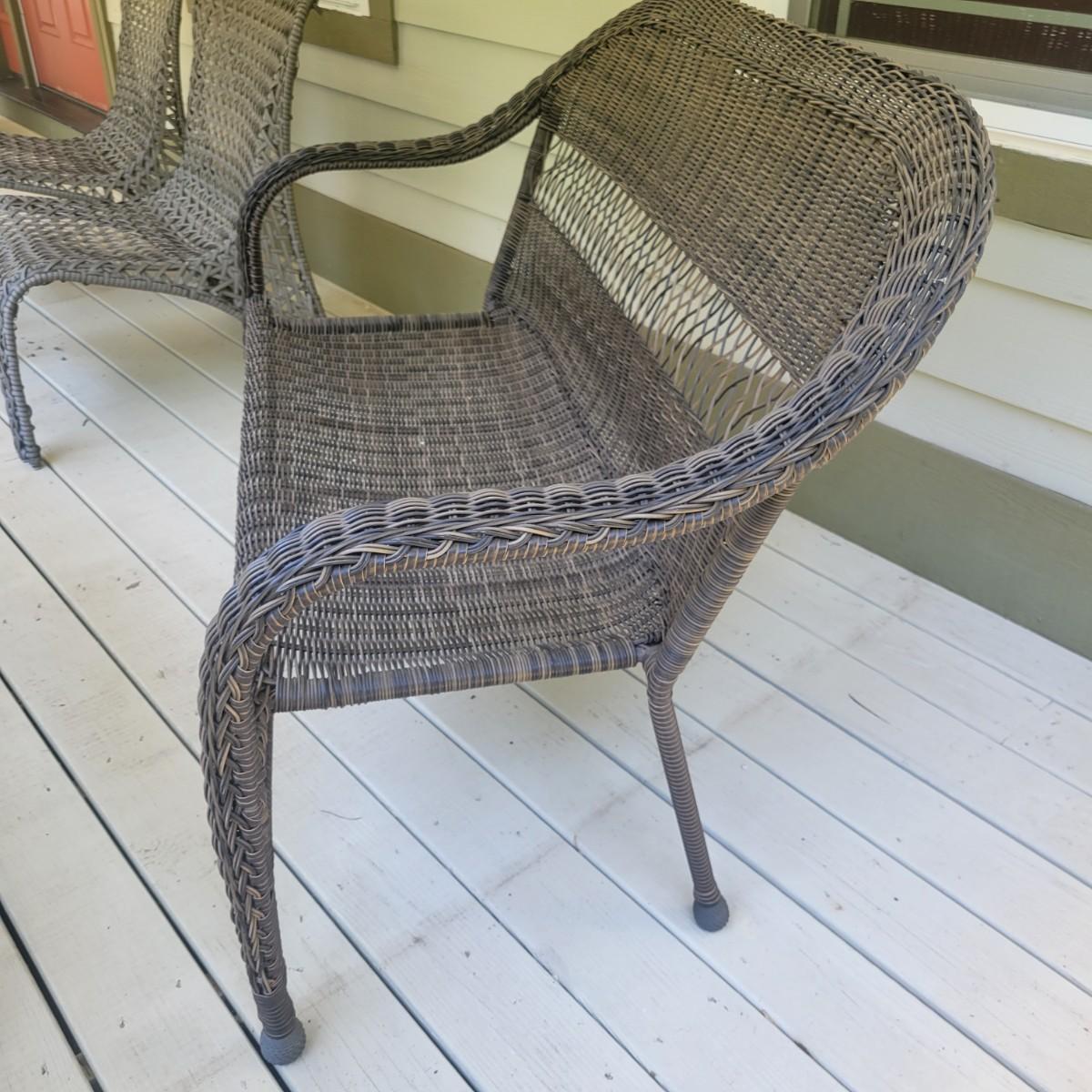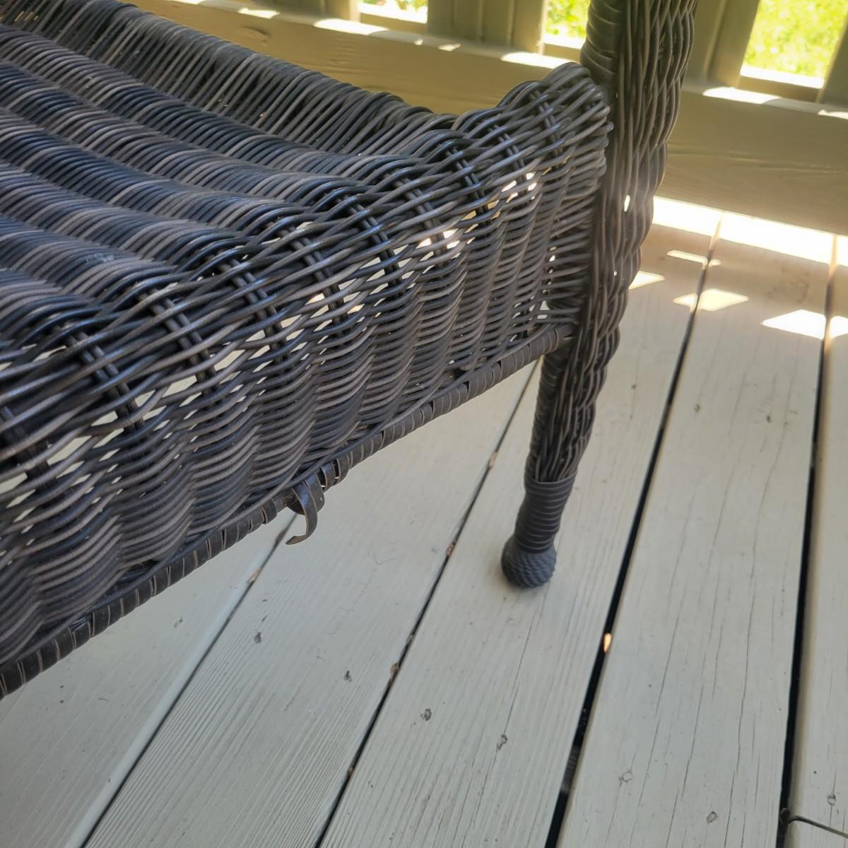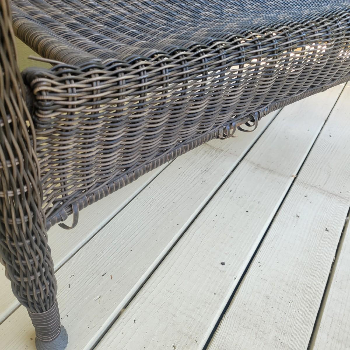 A faux rattan bench and glass topped table. The bench measures approximately 48" x 26" x 35"H with a seat height of 17". The bench does have a few places that are unraveling. Also includes a tempered glass table with a matching rattan frame that measures approximately 42" x 24" x 20"H. Local pickup only