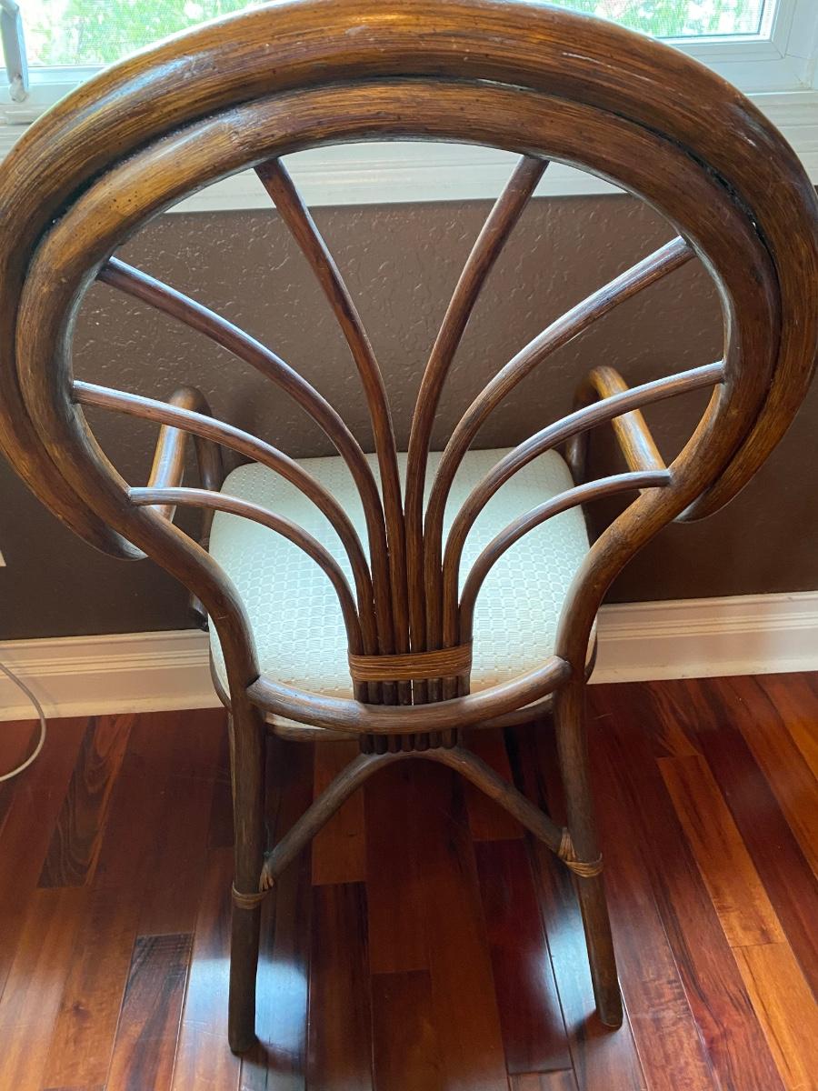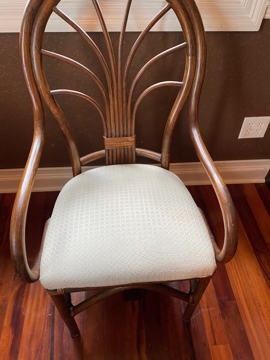 Rattan chair w/upholstered seat. 41H back, seat is 29-3/4 x 19-1/2. Very good condition