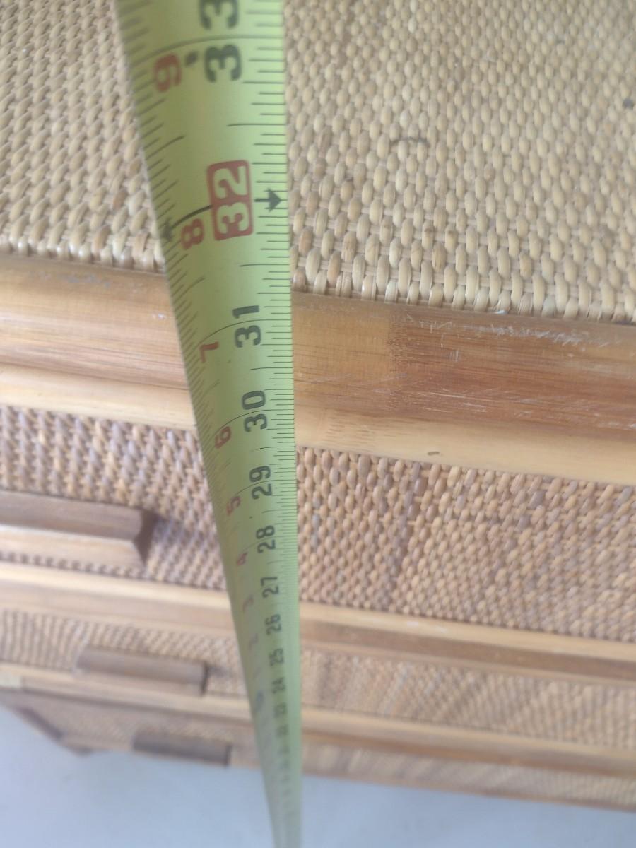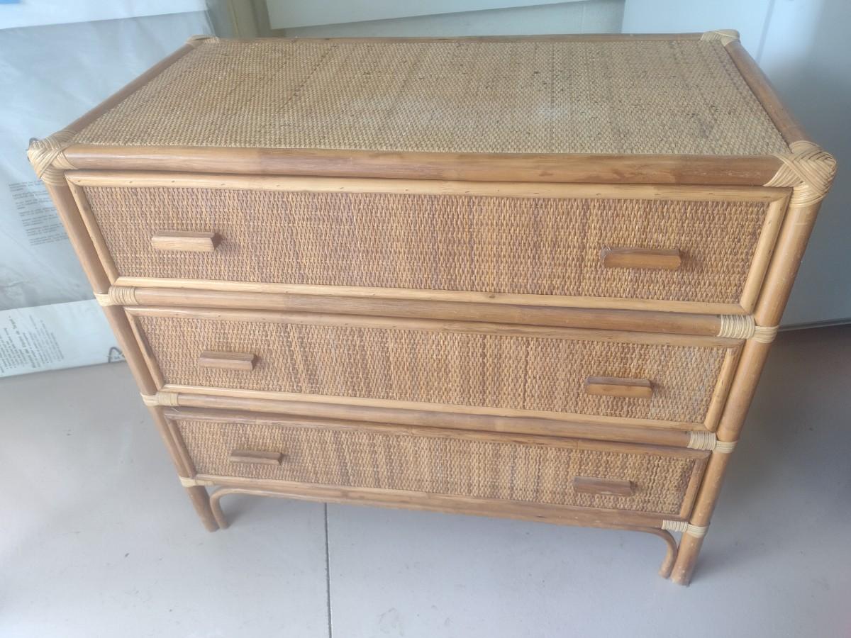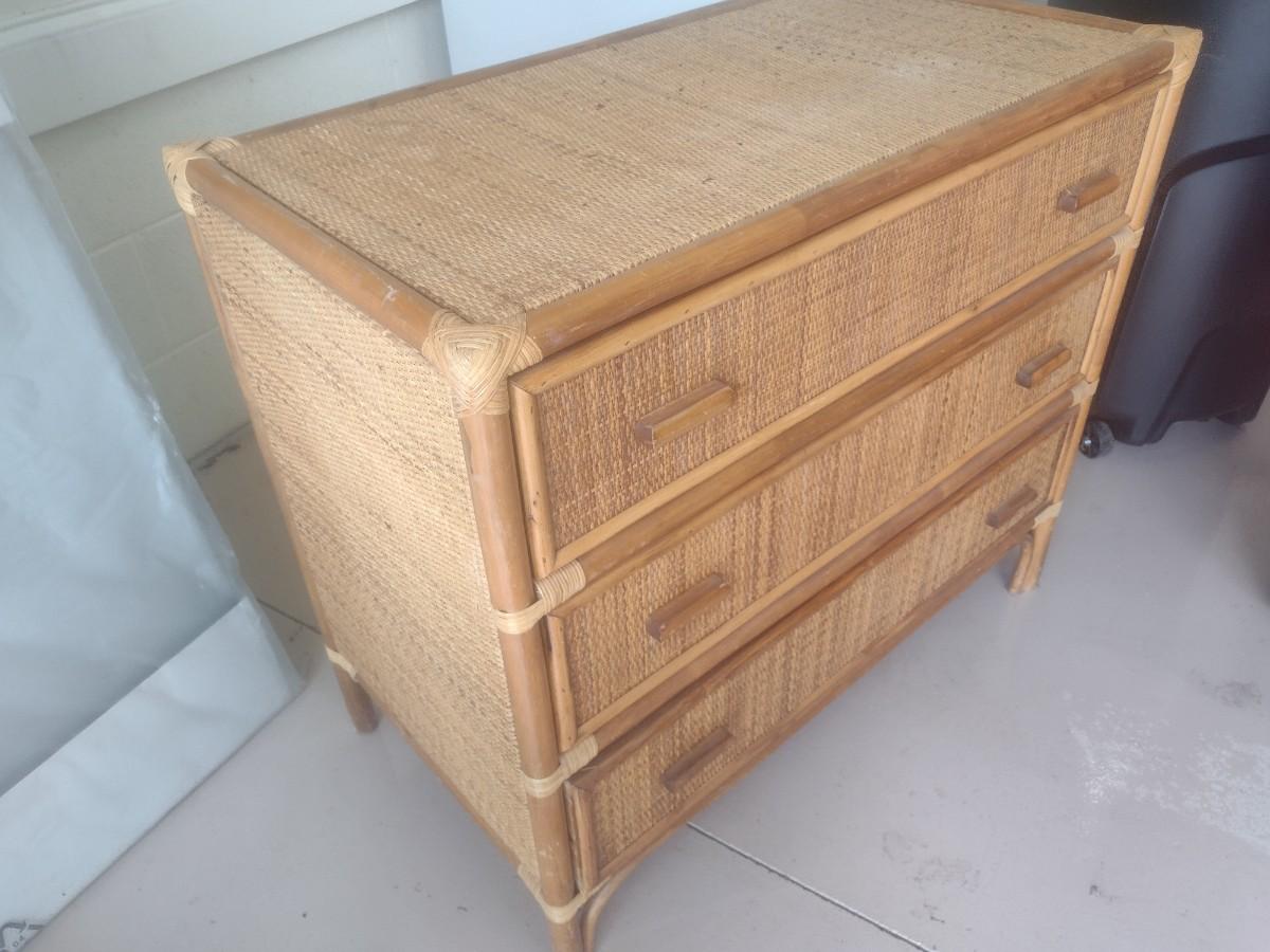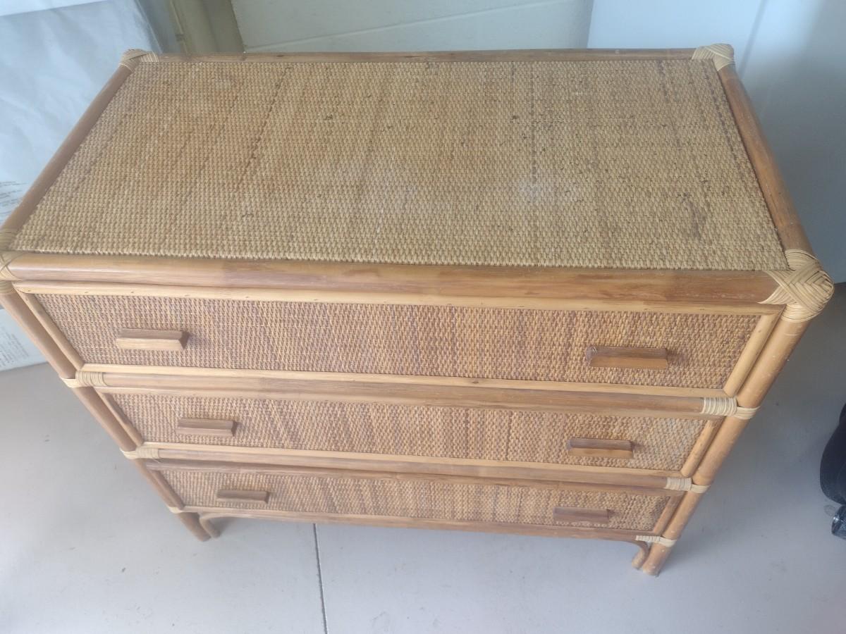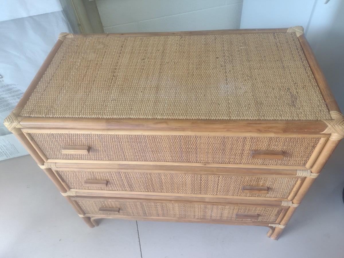 Rattan Design Three Drawer Dresser may have some wear and scratches to exterior.