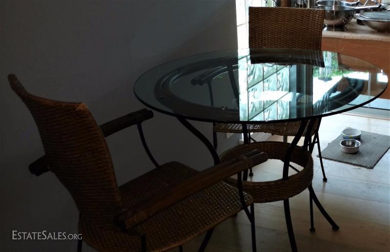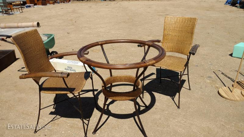 Rattan & Metal Cafe Glass Top Table w Two Chairs