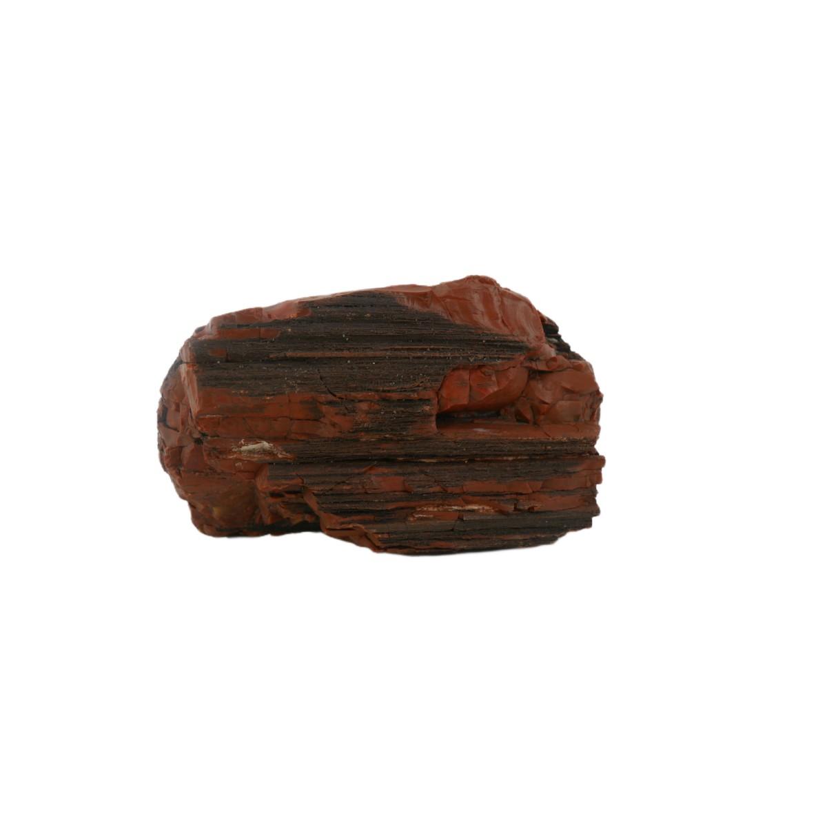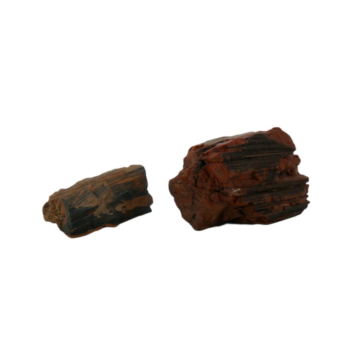 Two raw pieces of petrified wood fossils. Jasperized wood with red coloring and brown coloring with black striations. Excellent condition. Largest measures L 5.5" x H 3" x W 3".Lot weighs 3 lbs 5 oz. (R6)