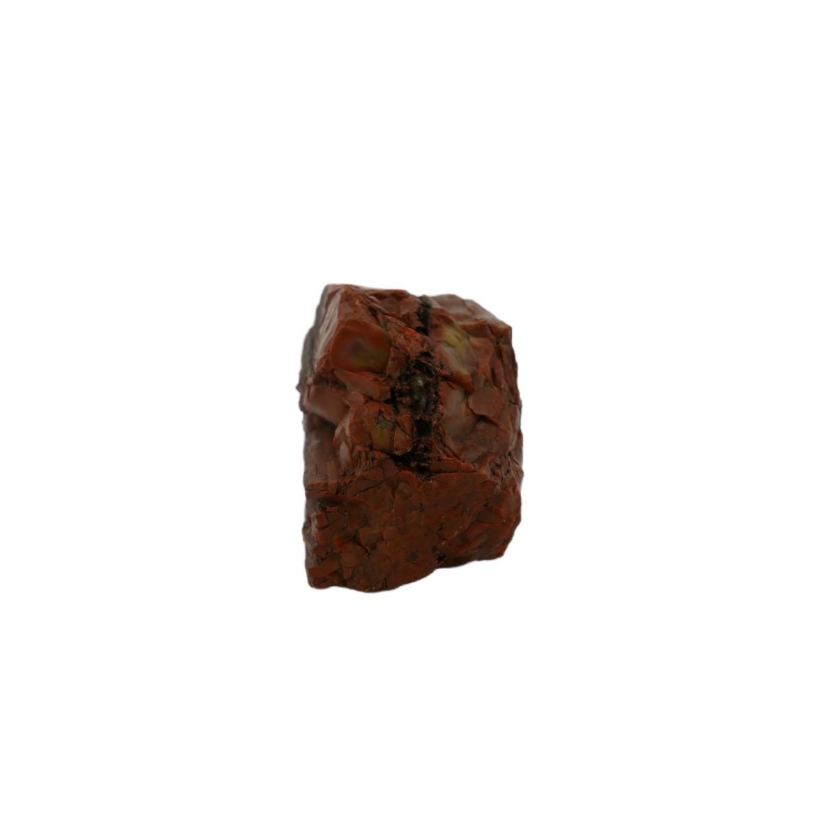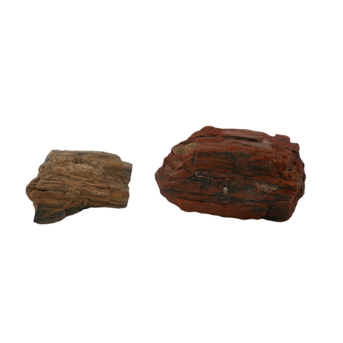 Two raw pieces of petrified wood fossils. Jasperized wood with red coloring and brown coloring with black striations. Excellent condition. Largest measures L 5.5" x H 3" x W 3".Lot weighs 3 lbs 5 oz. (R6)