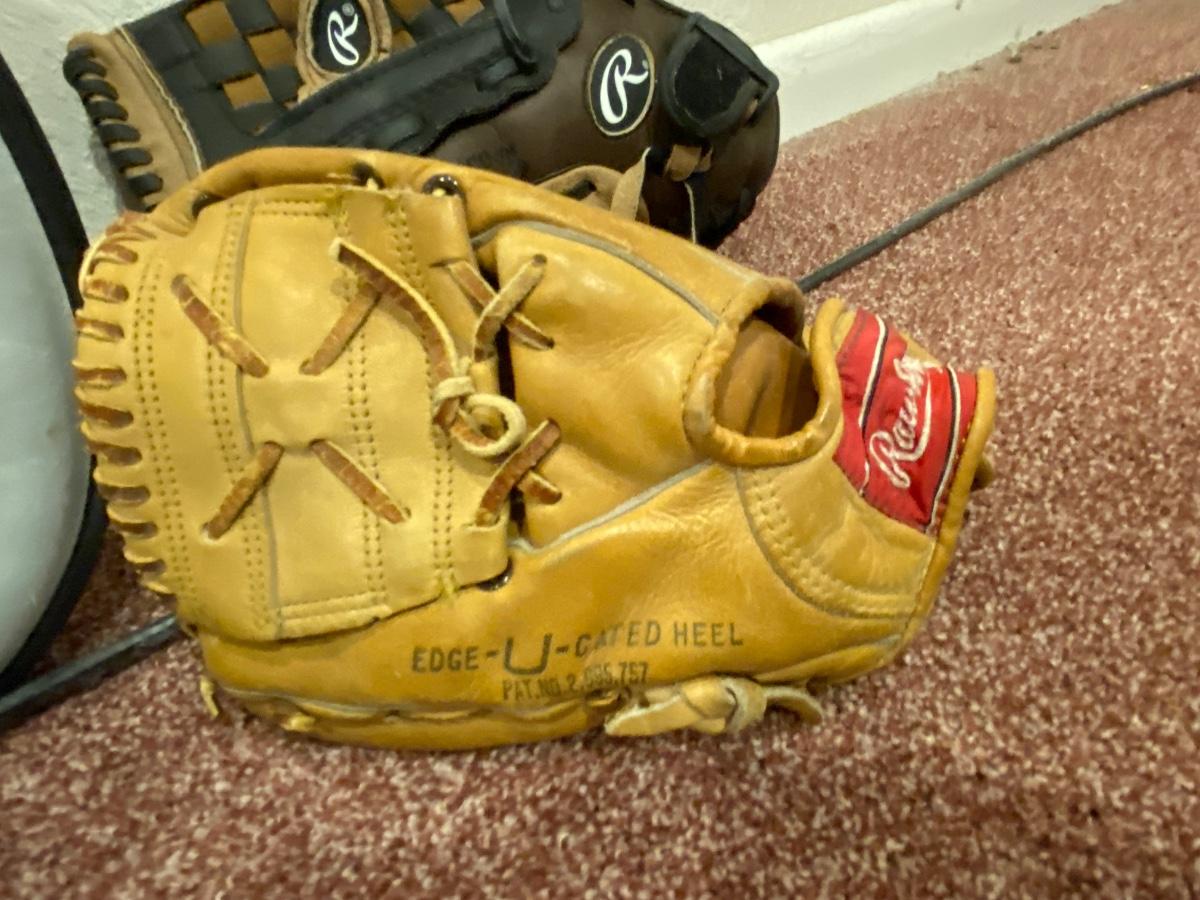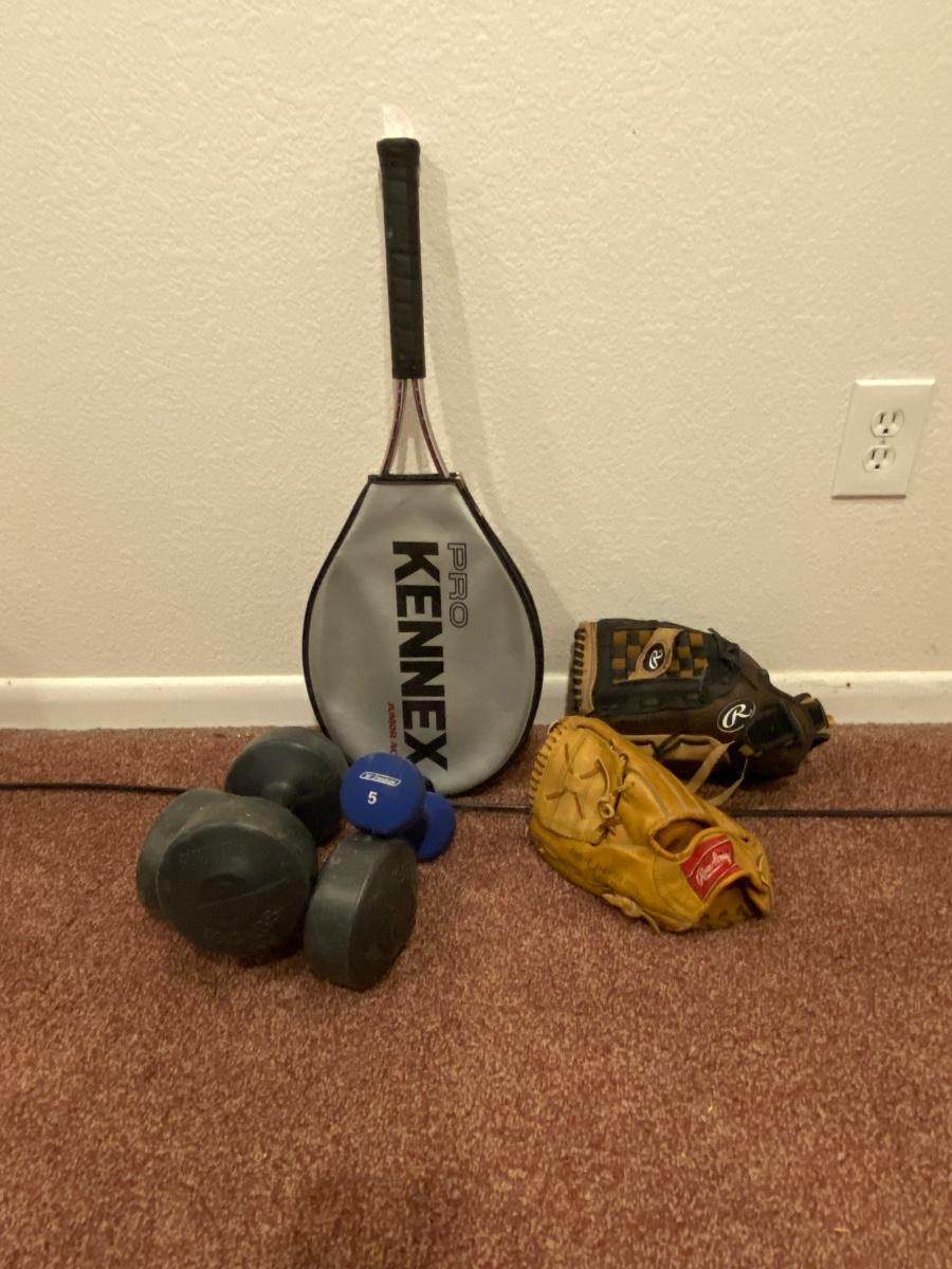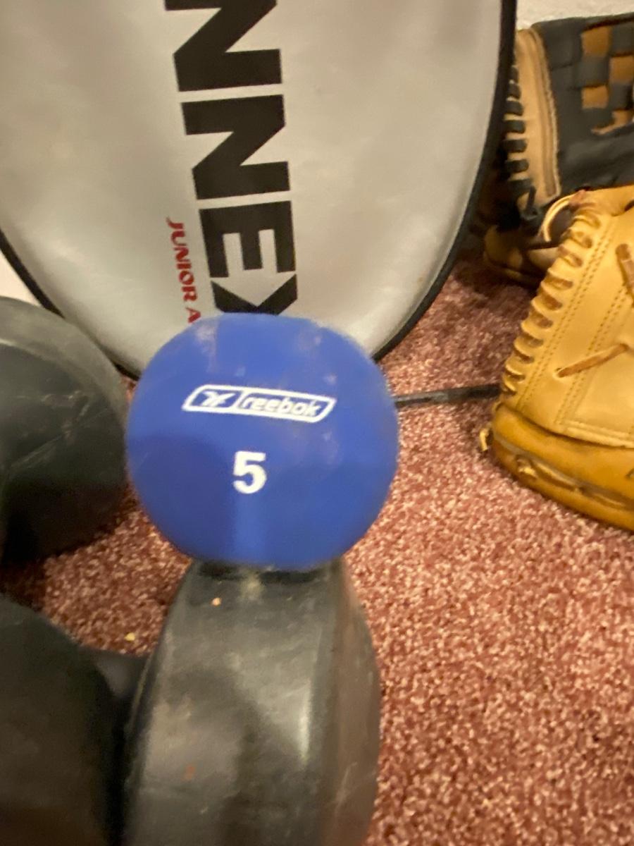 RAWLINGS BALL MITTS, JUNIOR RAQUET, & DUMB BELLS
