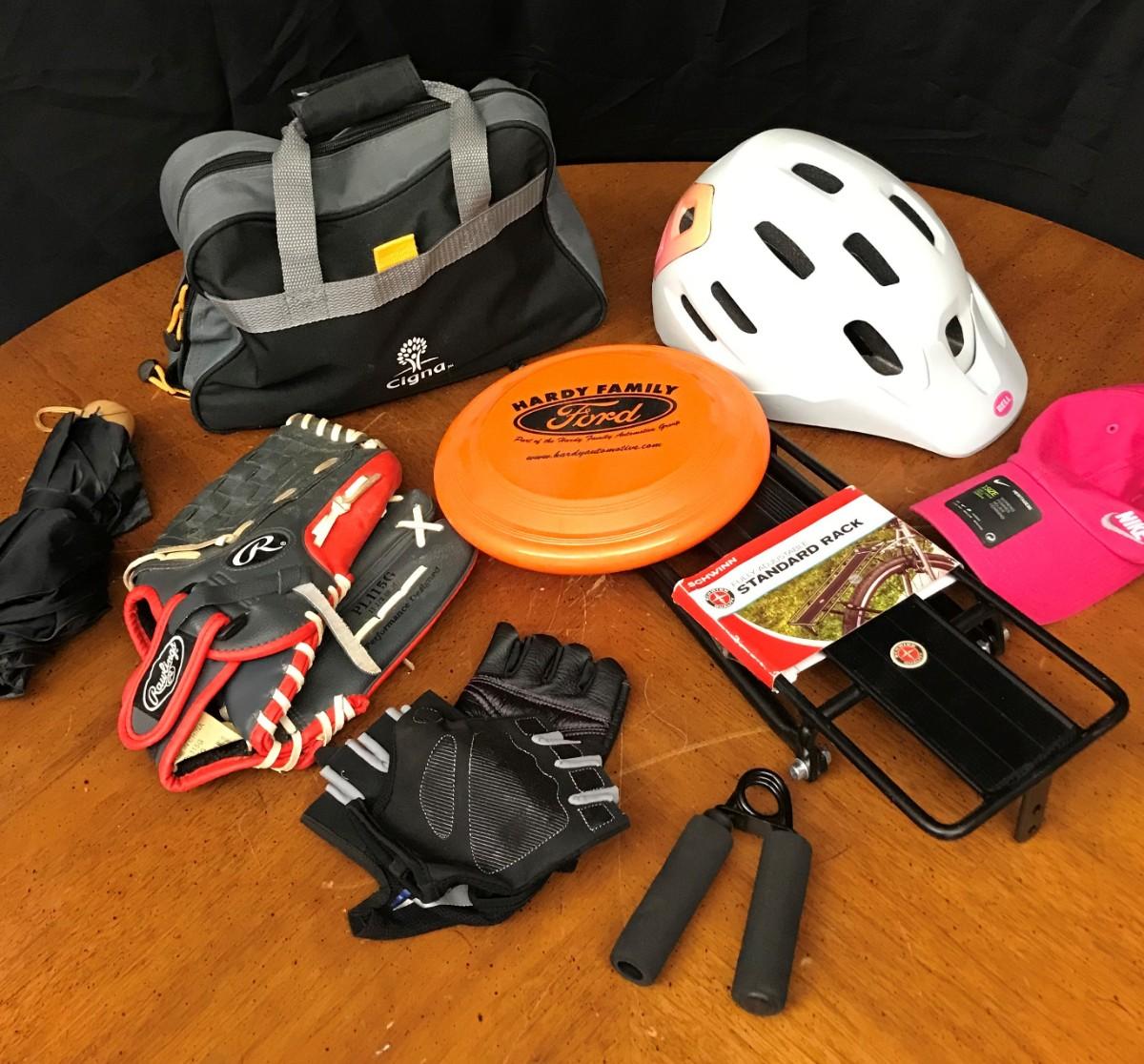 sports equipment: rawlings baseball glove, frisbee, helmet, standard bike rack, batters gloves, umbrella, nike hat and bag;