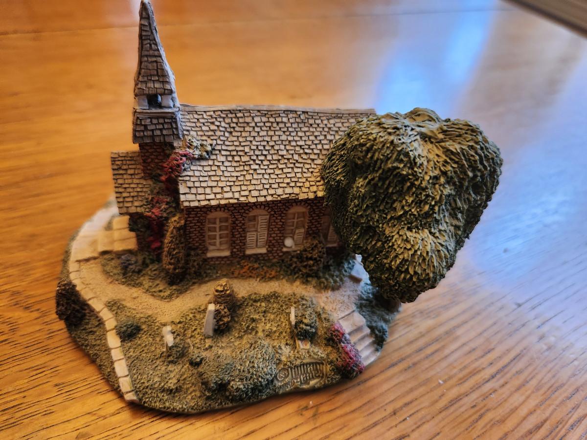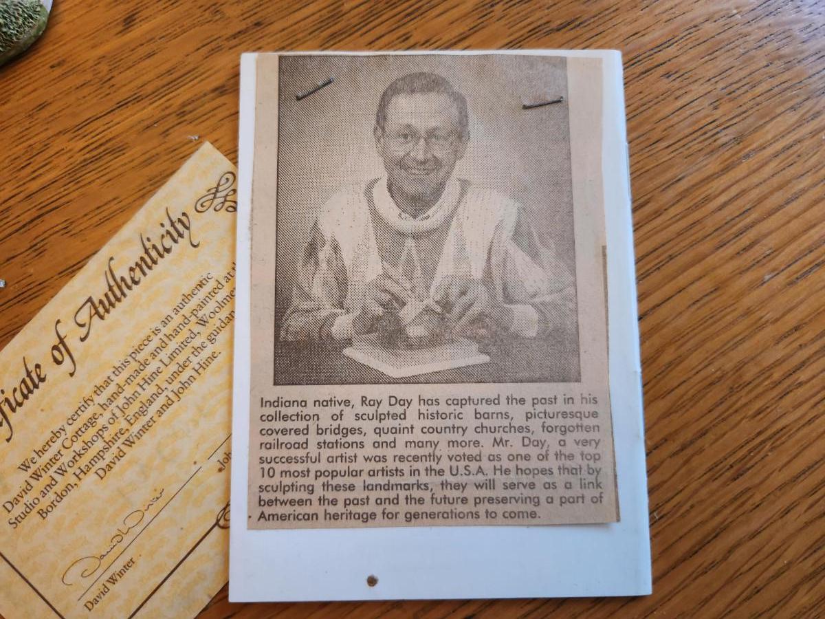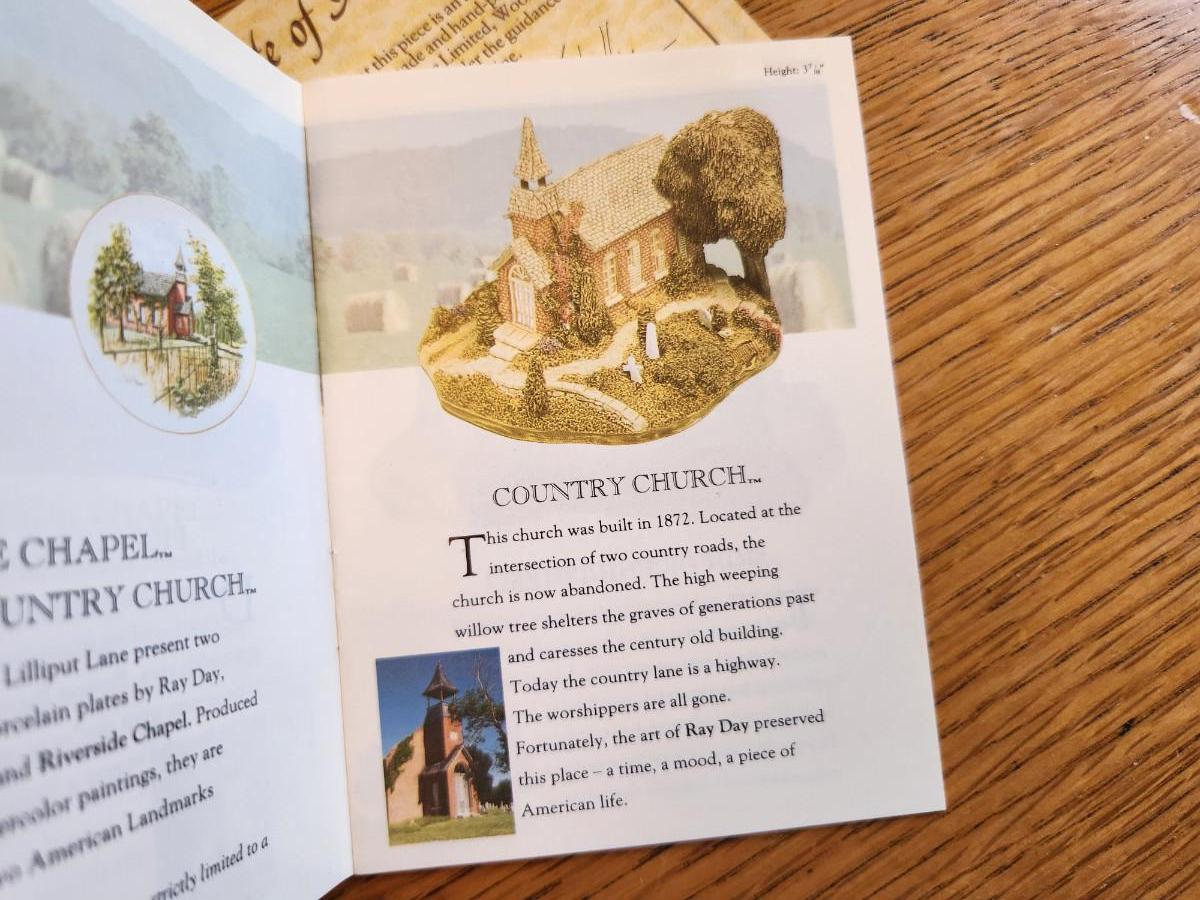 This auction lot is for Ray Day's American Landmark Collection - Country Church. A sculpted miniature make in England by the noted John Hine Company. This items comes with a Certificate of Authenticity and a booklet that explains the works of this artist with this series. This pieces is personally signed and dedicated on the verso. with a date of 1991. This item is not perfect, please examine the photos as there are several very tiny chipped places which in reality do not affect the overall wonder of this item.
