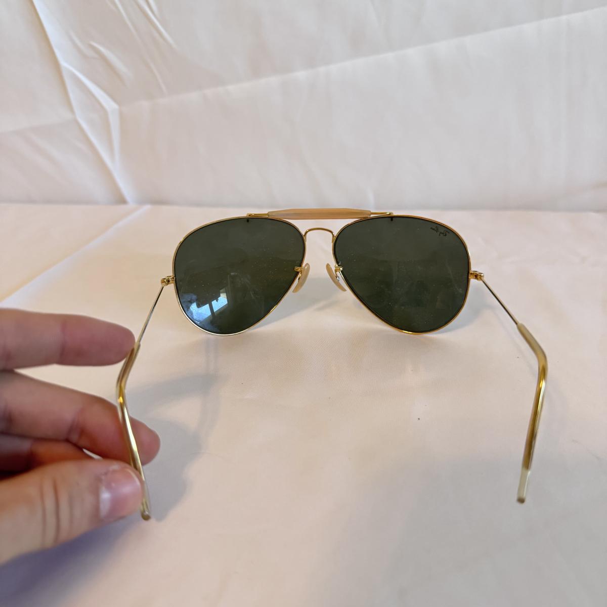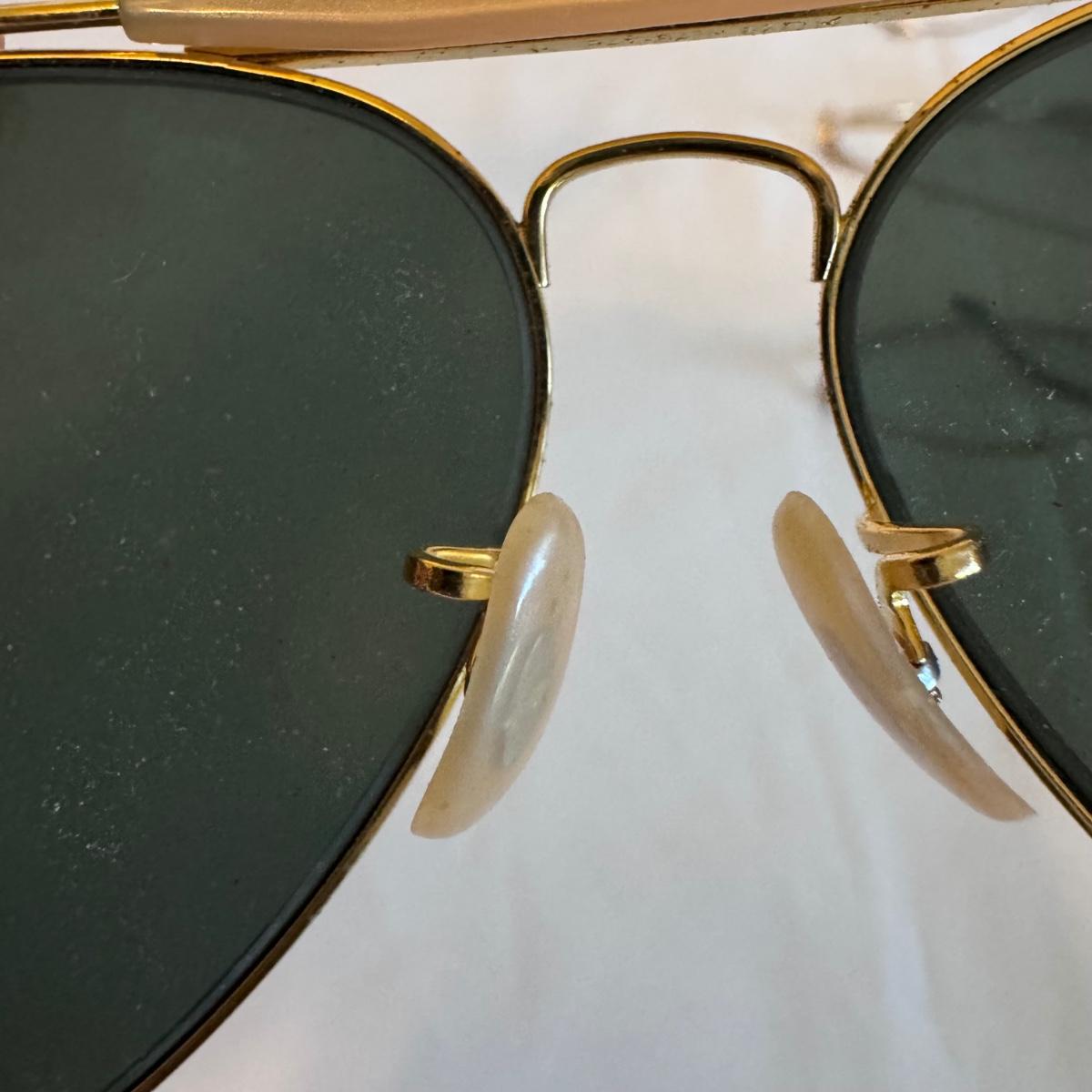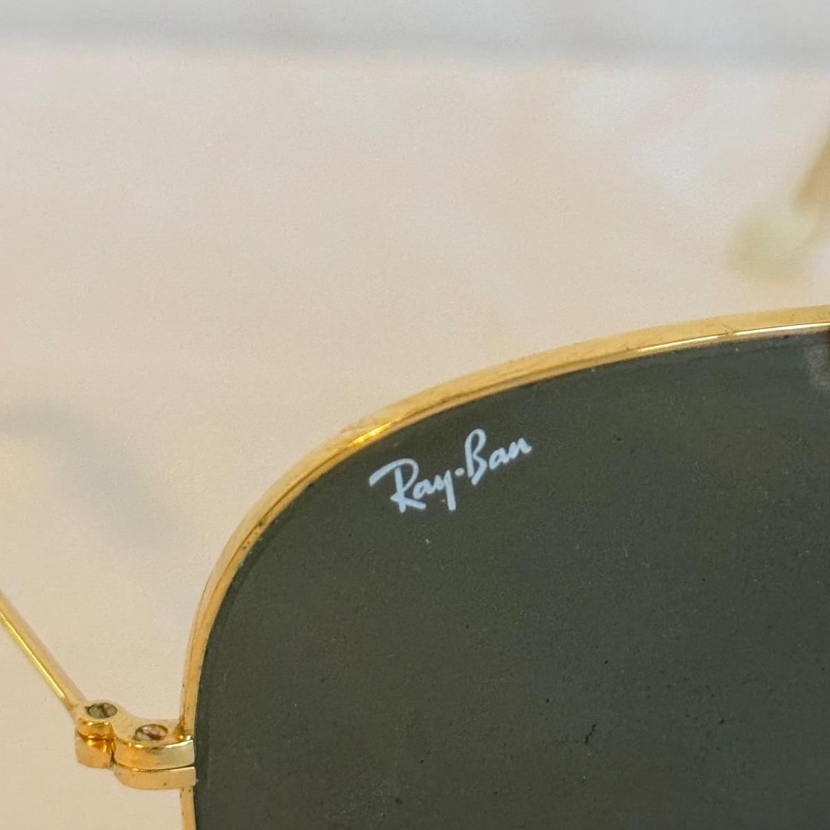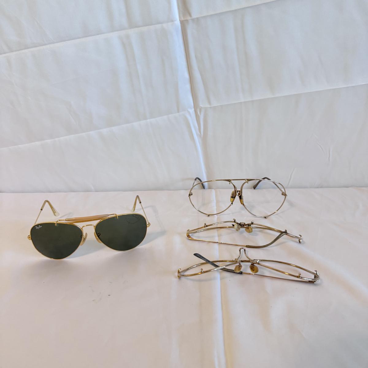 Lot includes one pair of Ray-Ban aviators, along with three gold-colored aviators. The three gold-colored aviators do not have markings and are missing their lenses. Two out of the three are missing one of their arms. Shipping available.