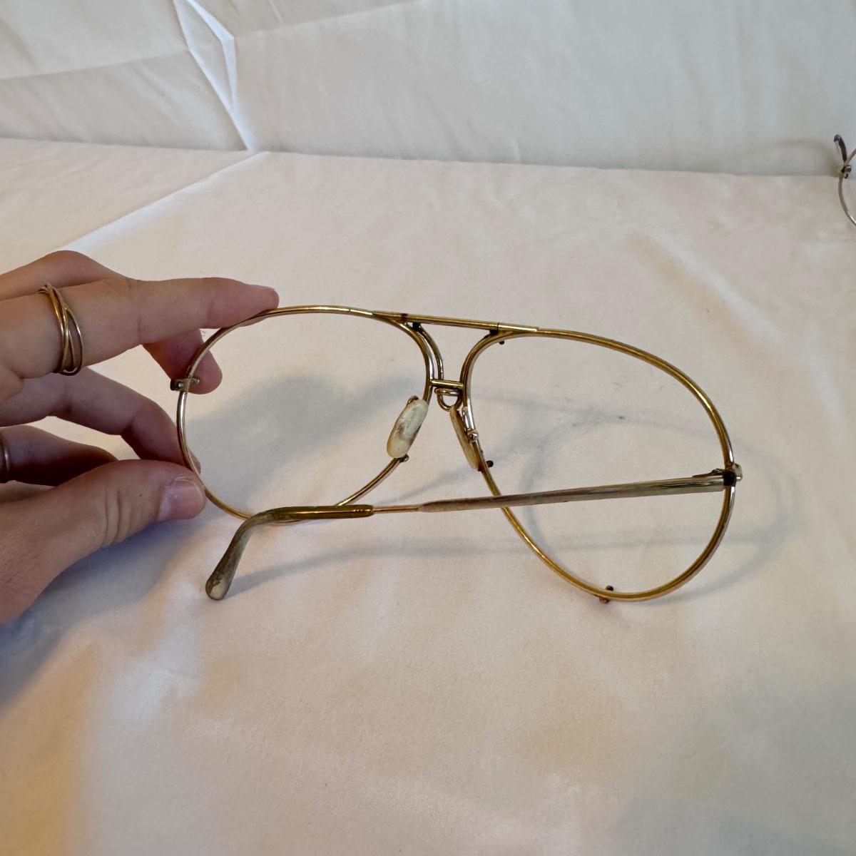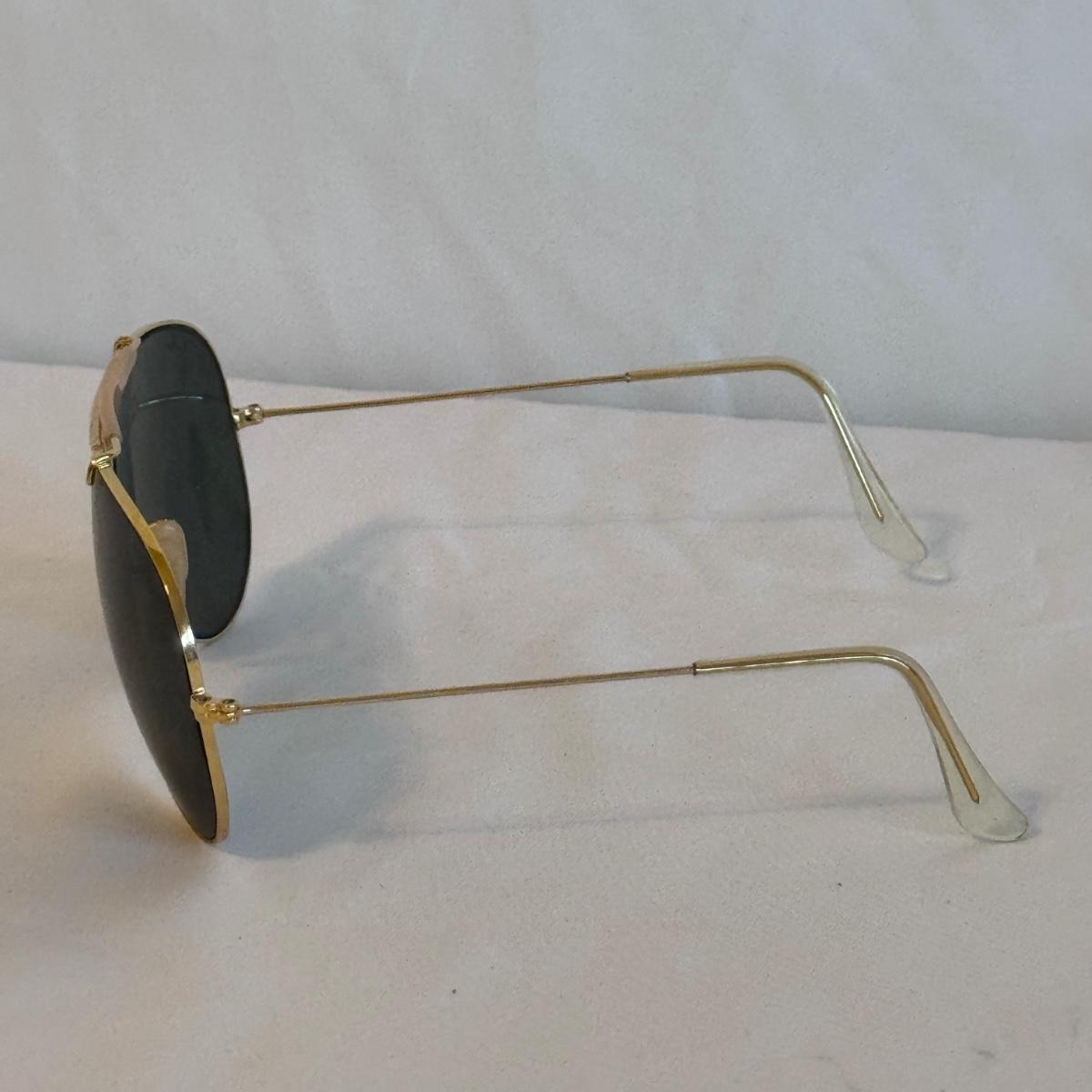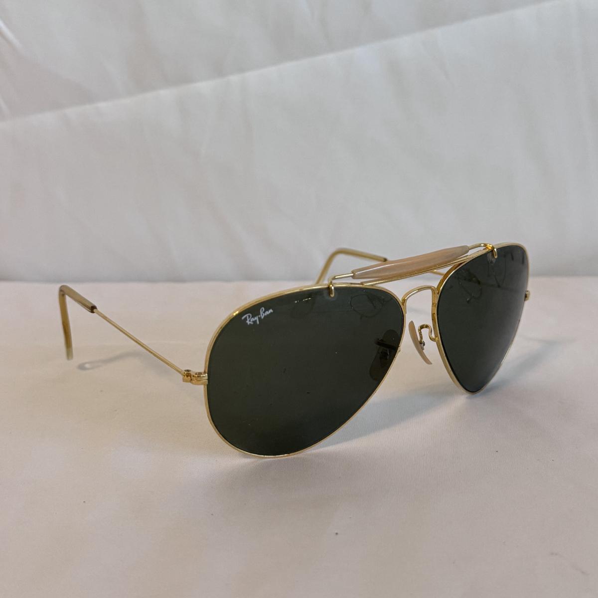 Lot includes one pair of Ray-Ban aviators, along with three gold-colored aviators. The three gold-colored aviators do not have markings and are missing their lenses. Two out of the three are missing one of their arms. Shipping available.